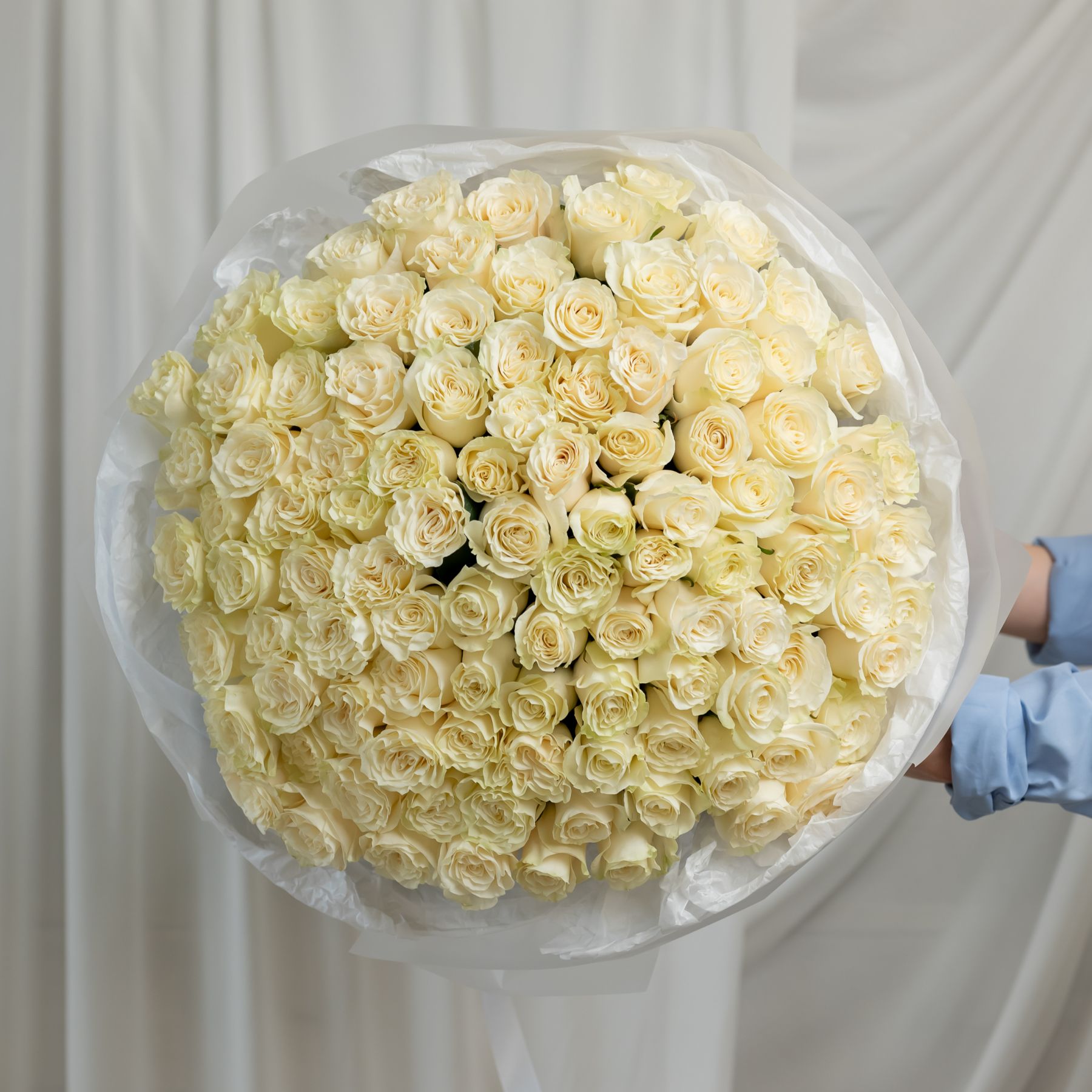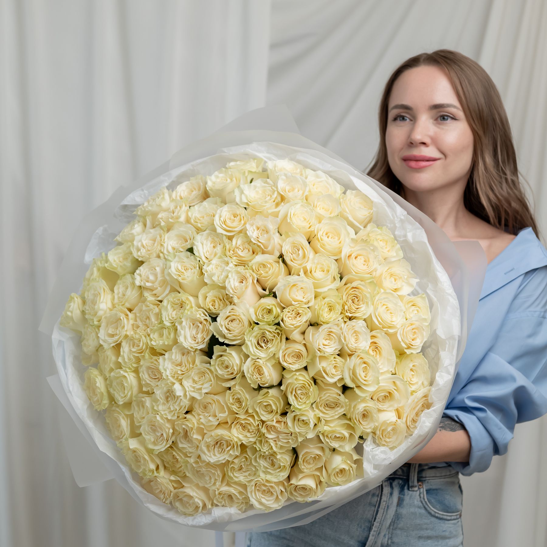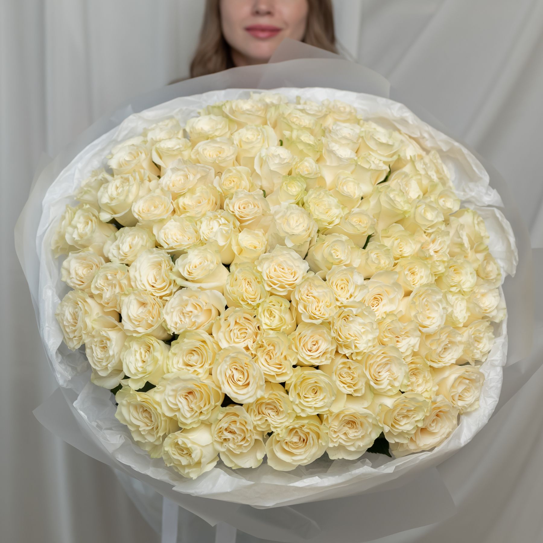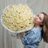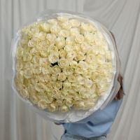 101 белая роза Эквадор (сорт Мондиаль) в объемной стильной упаковке.