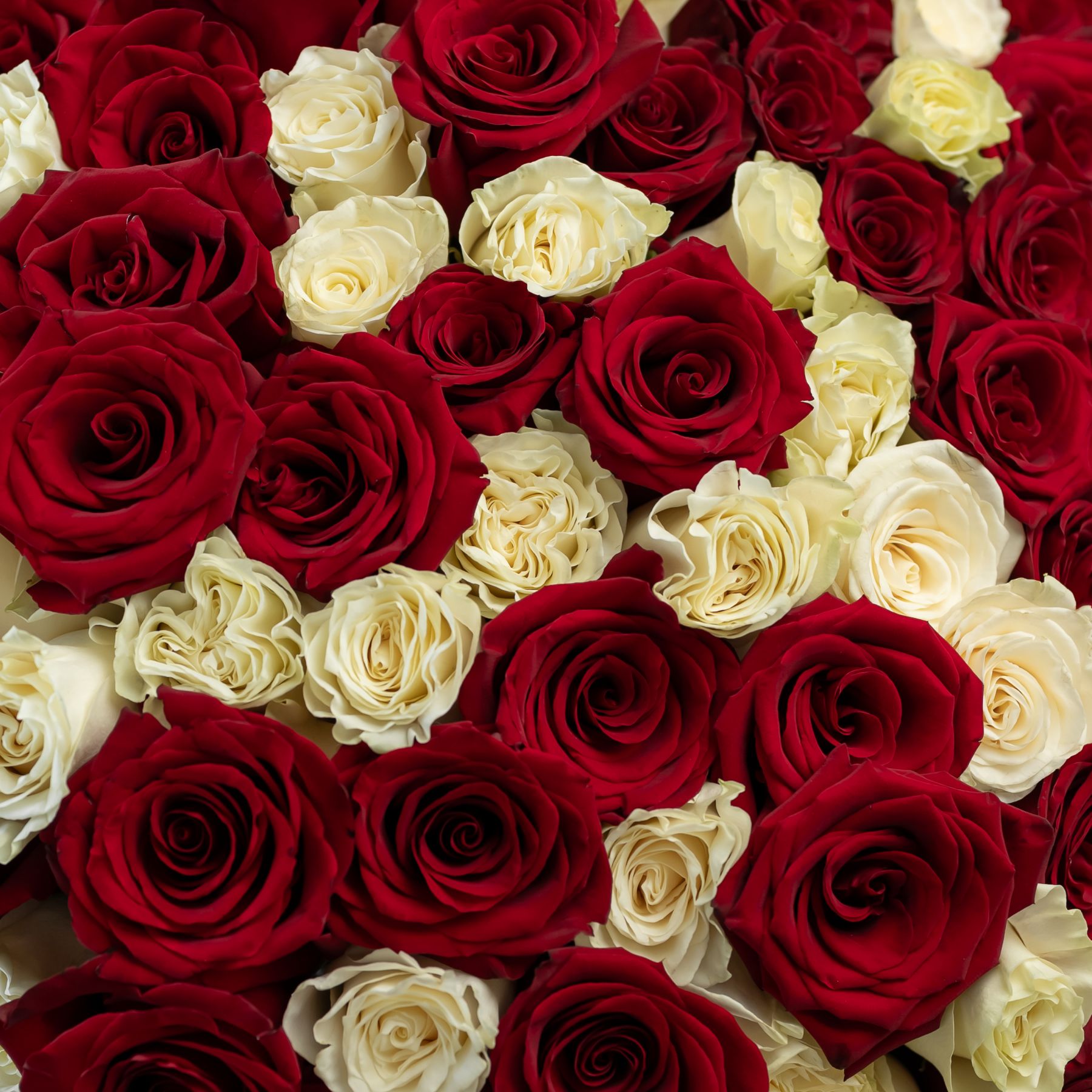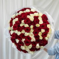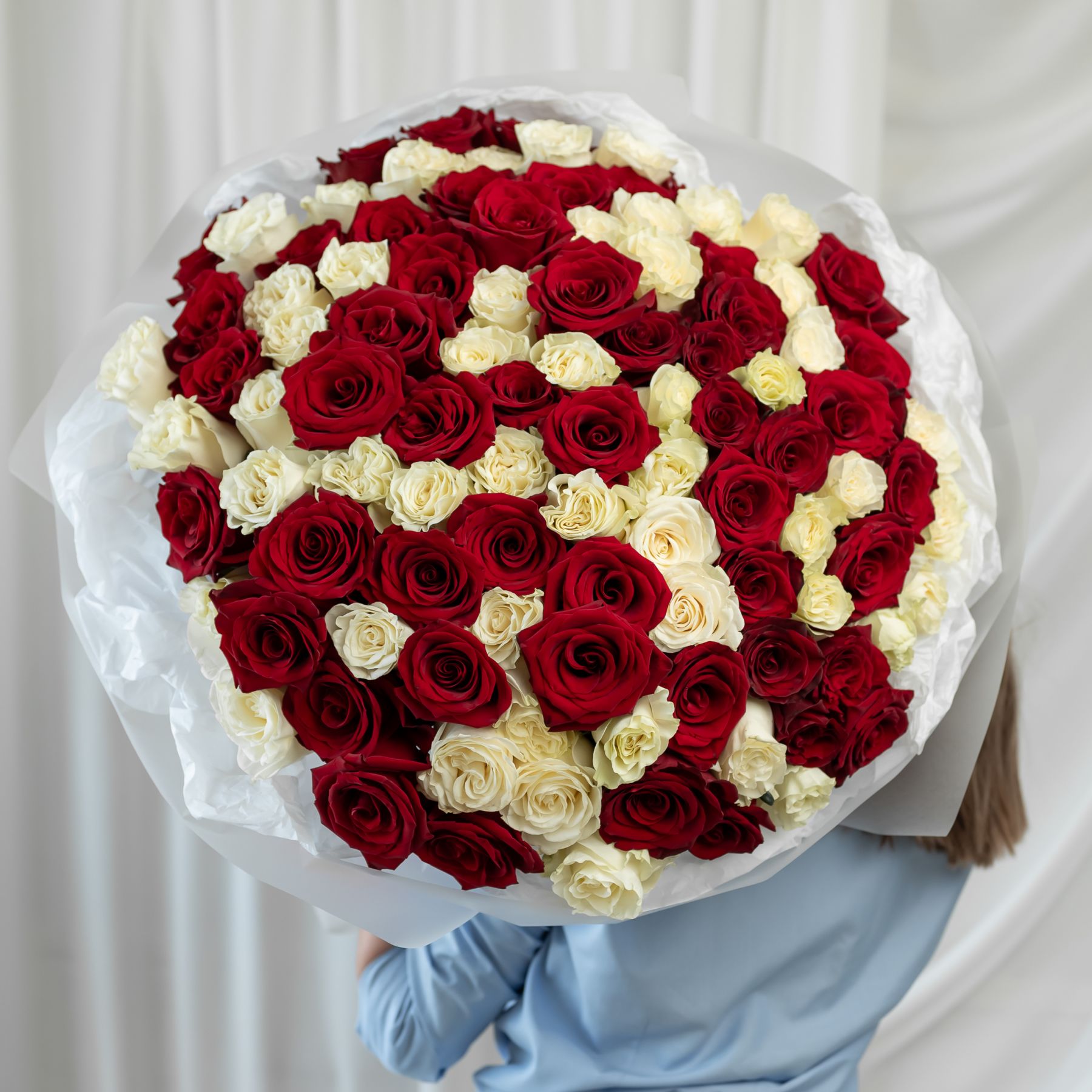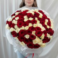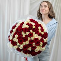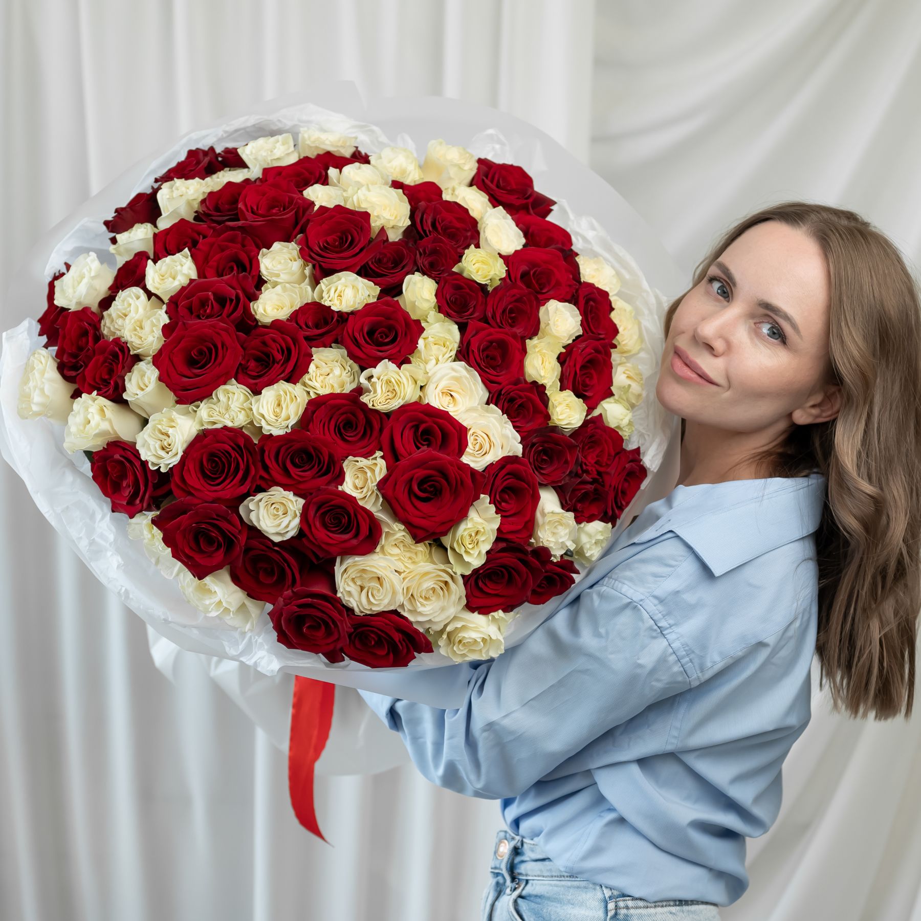 101 красно-белая роза (60 см) в дизайнерской упаковке.