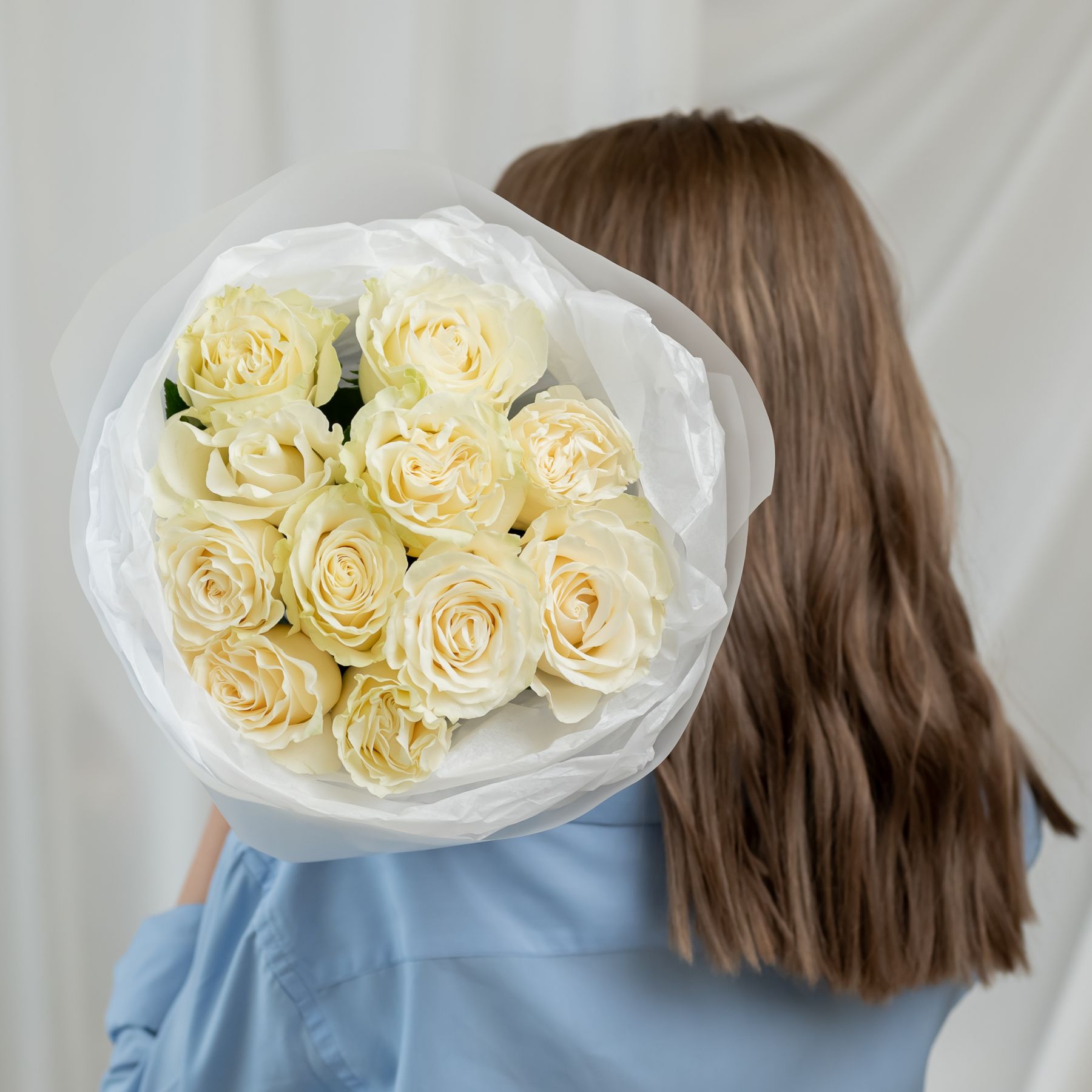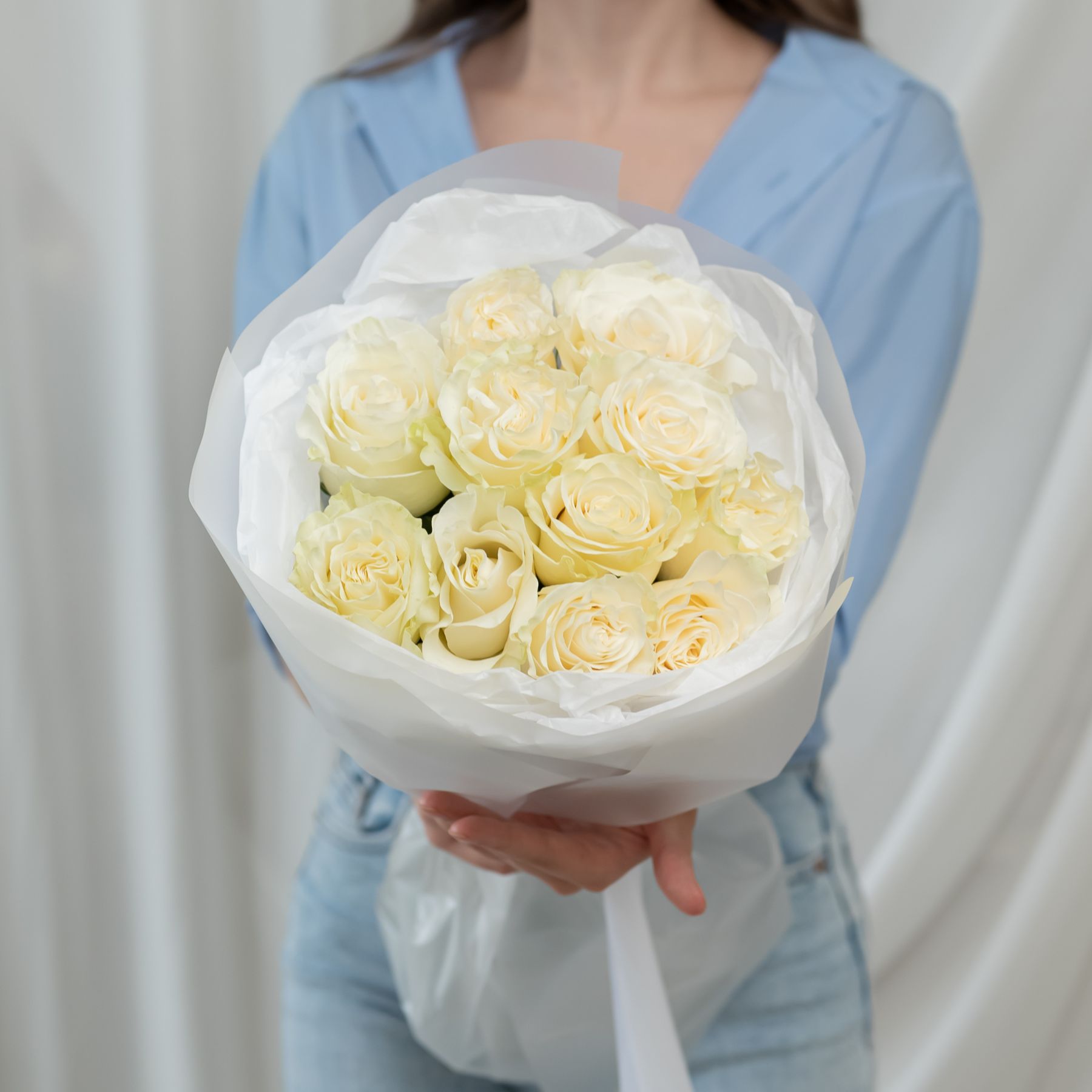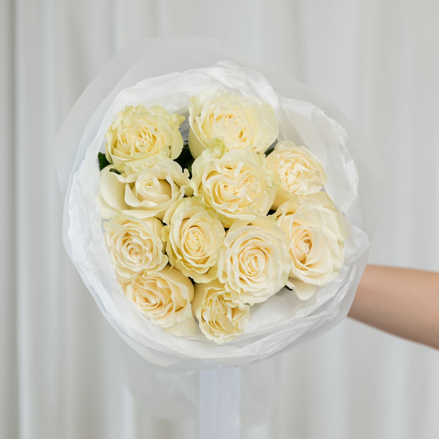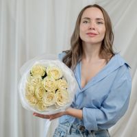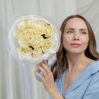 11 белых роз Эквадор (сорт Мондиаль) в объемной стильной упаковке.