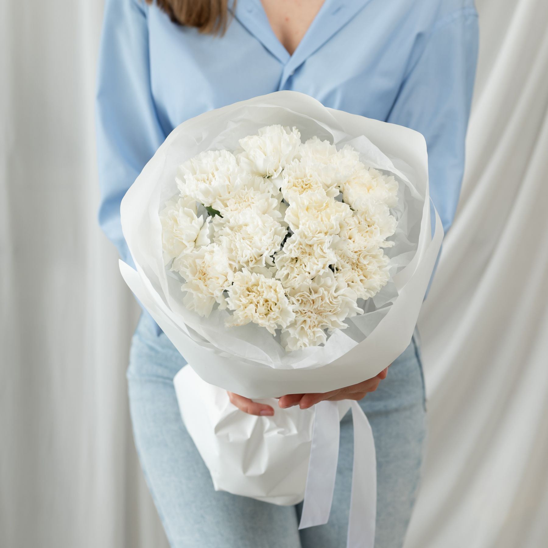В составе 15 белых диантусов в дизайнерской упаковке.