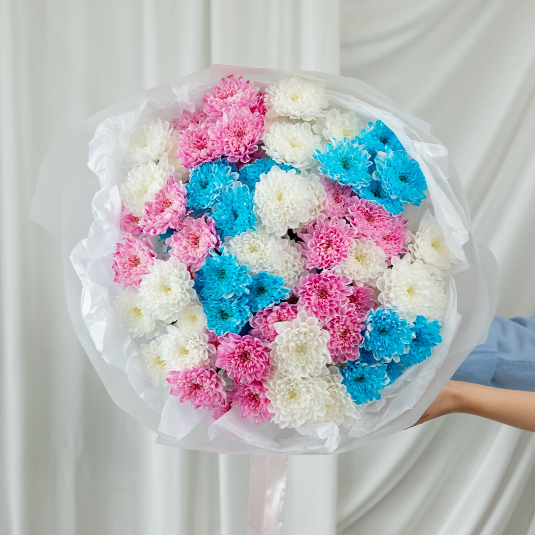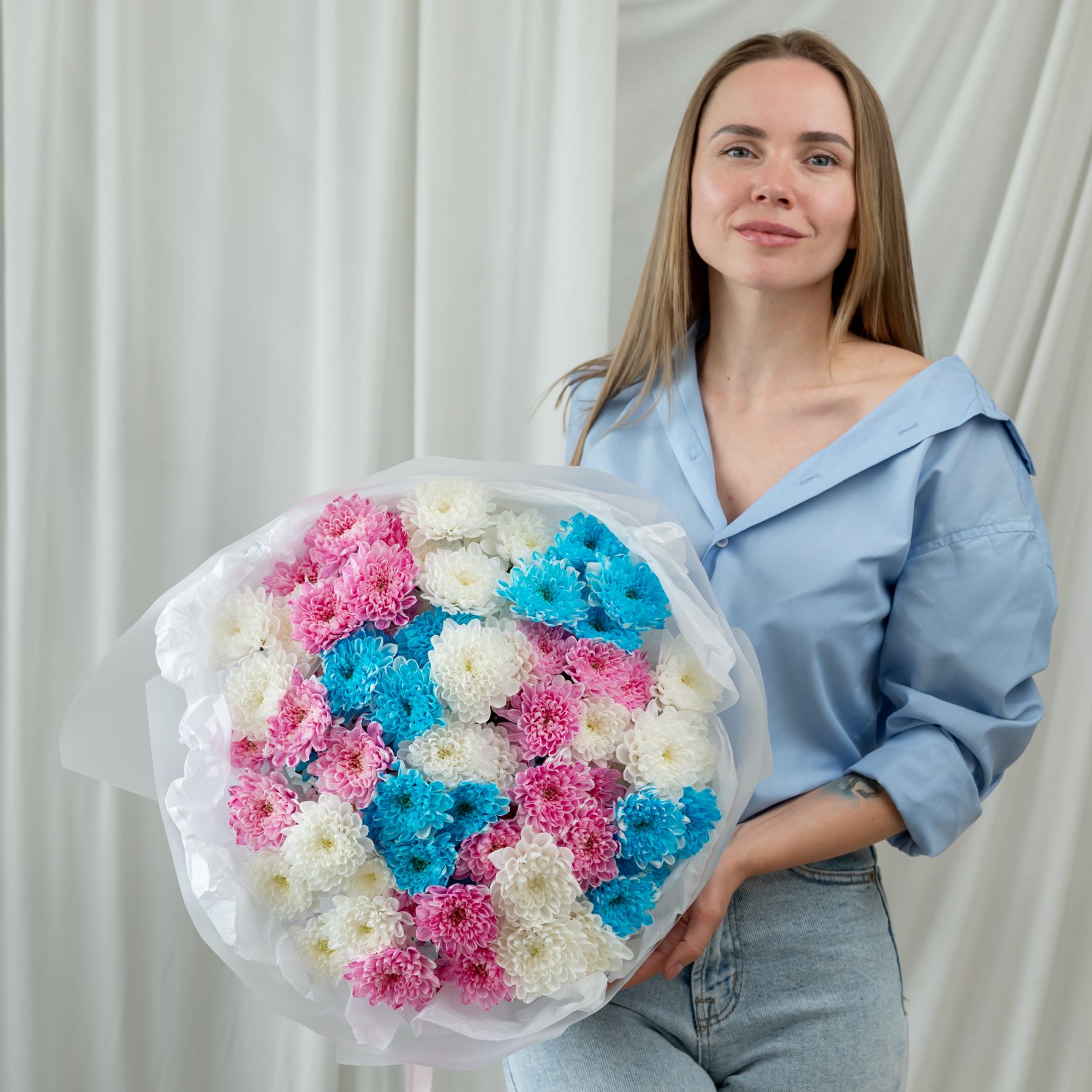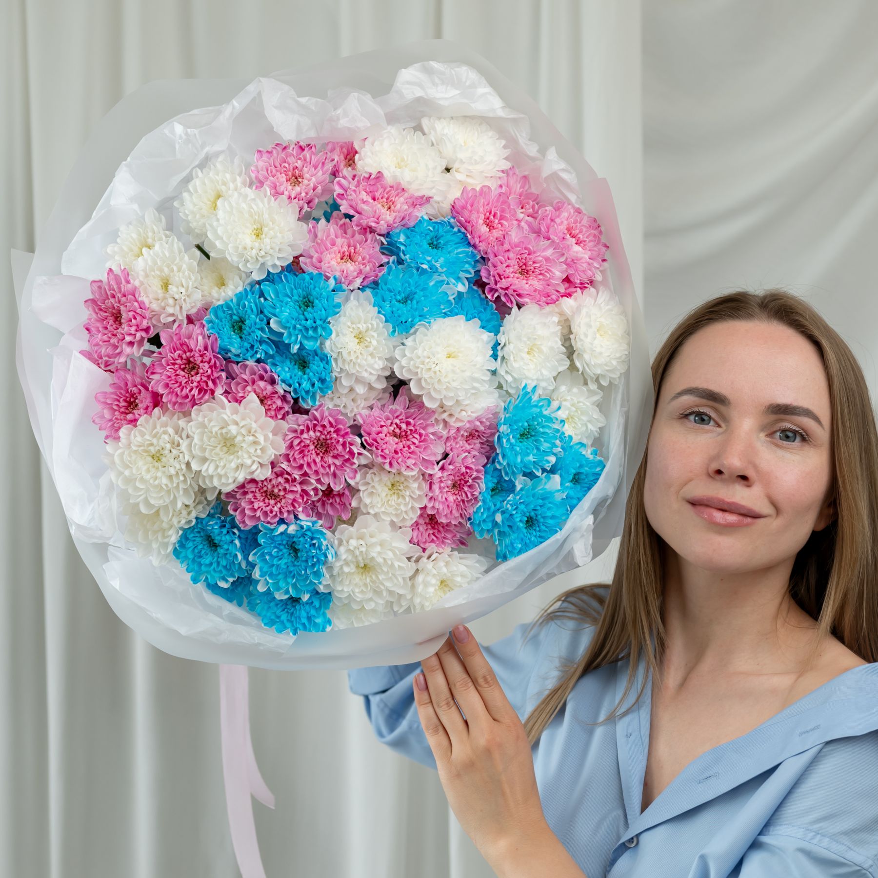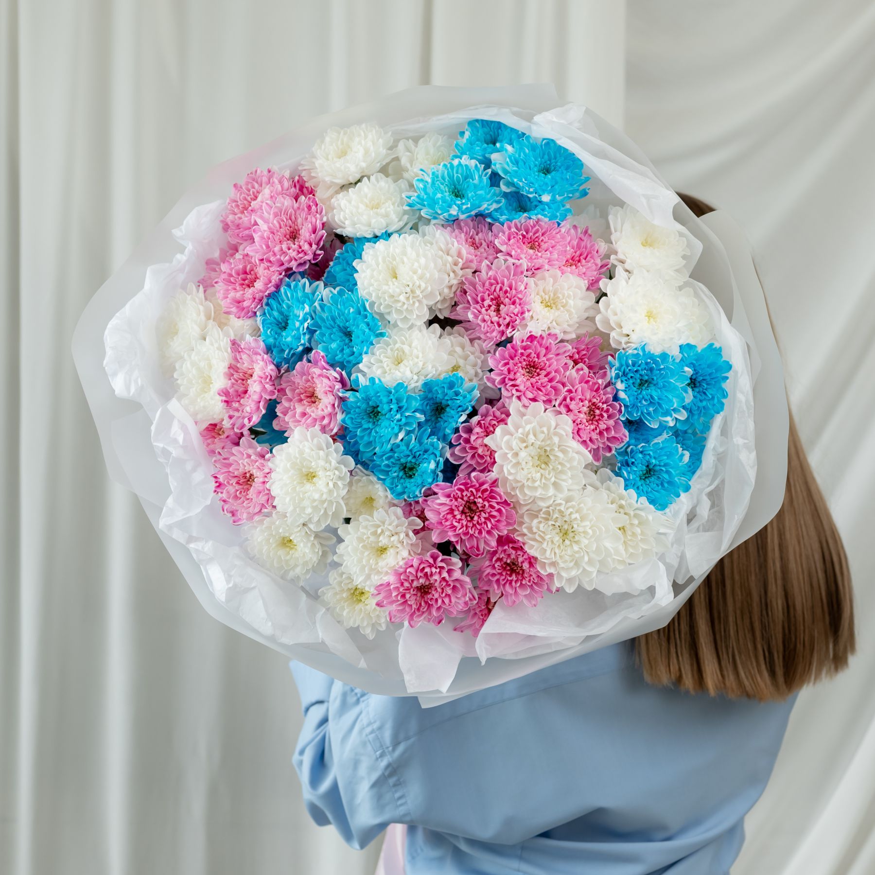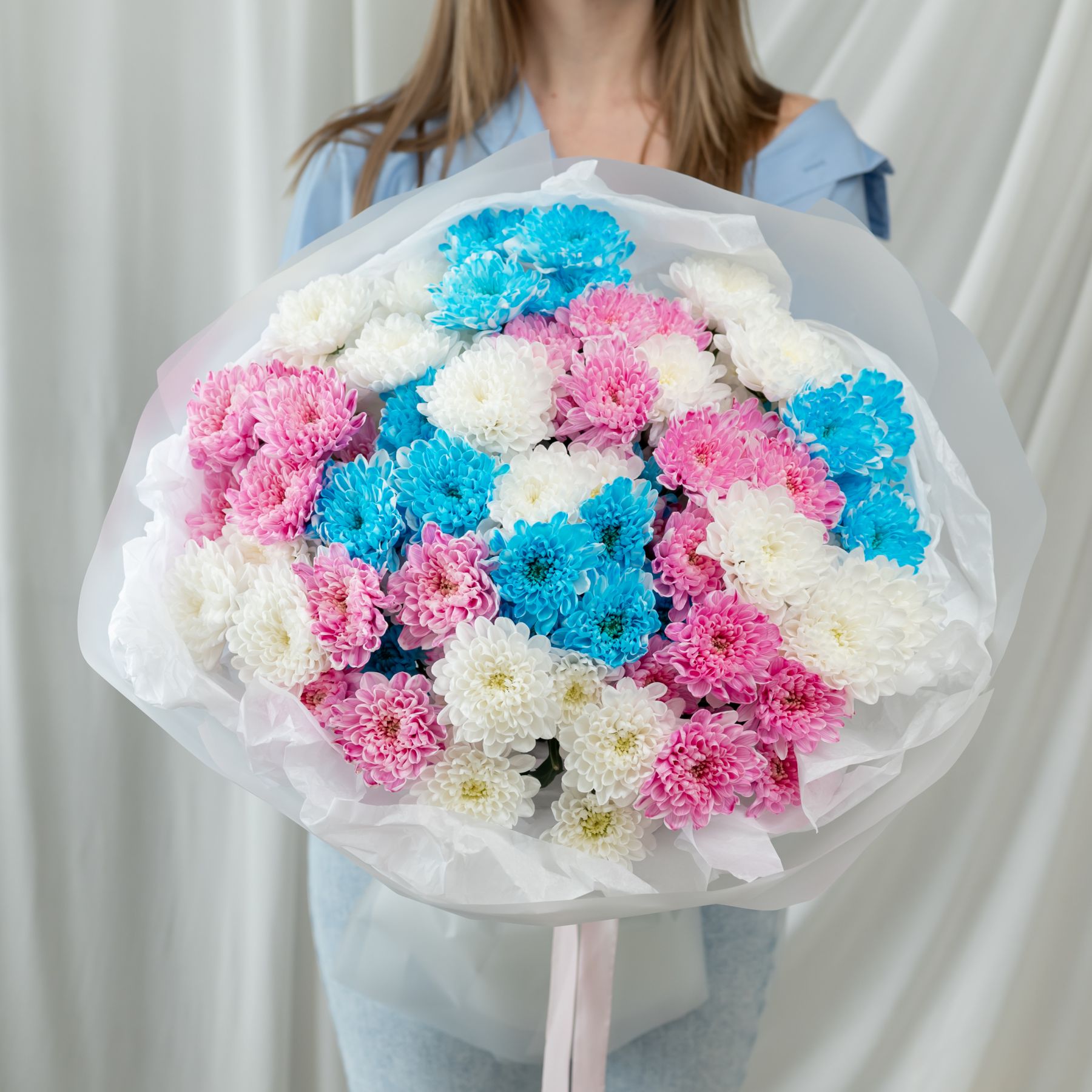 В составе 15 микс хризантем (сорт Алтай) в красивом оформлении.