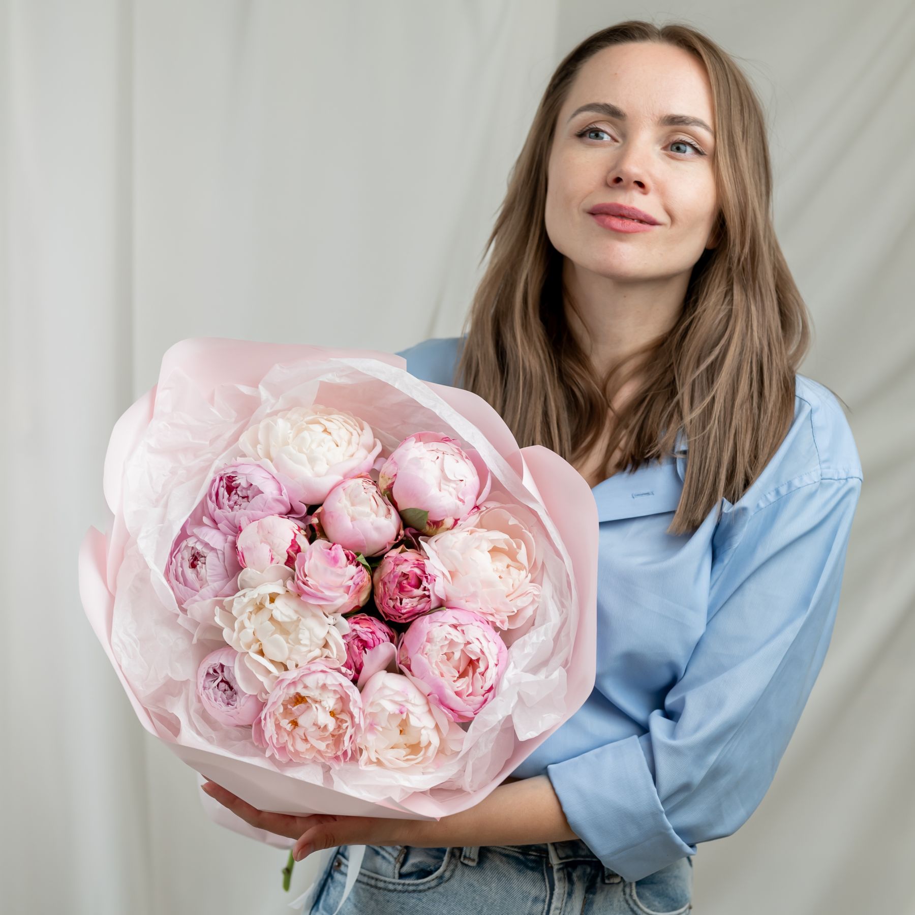 В составе 15 пионов (сорт Гардения) в дизайнерской упаковке.