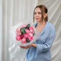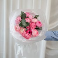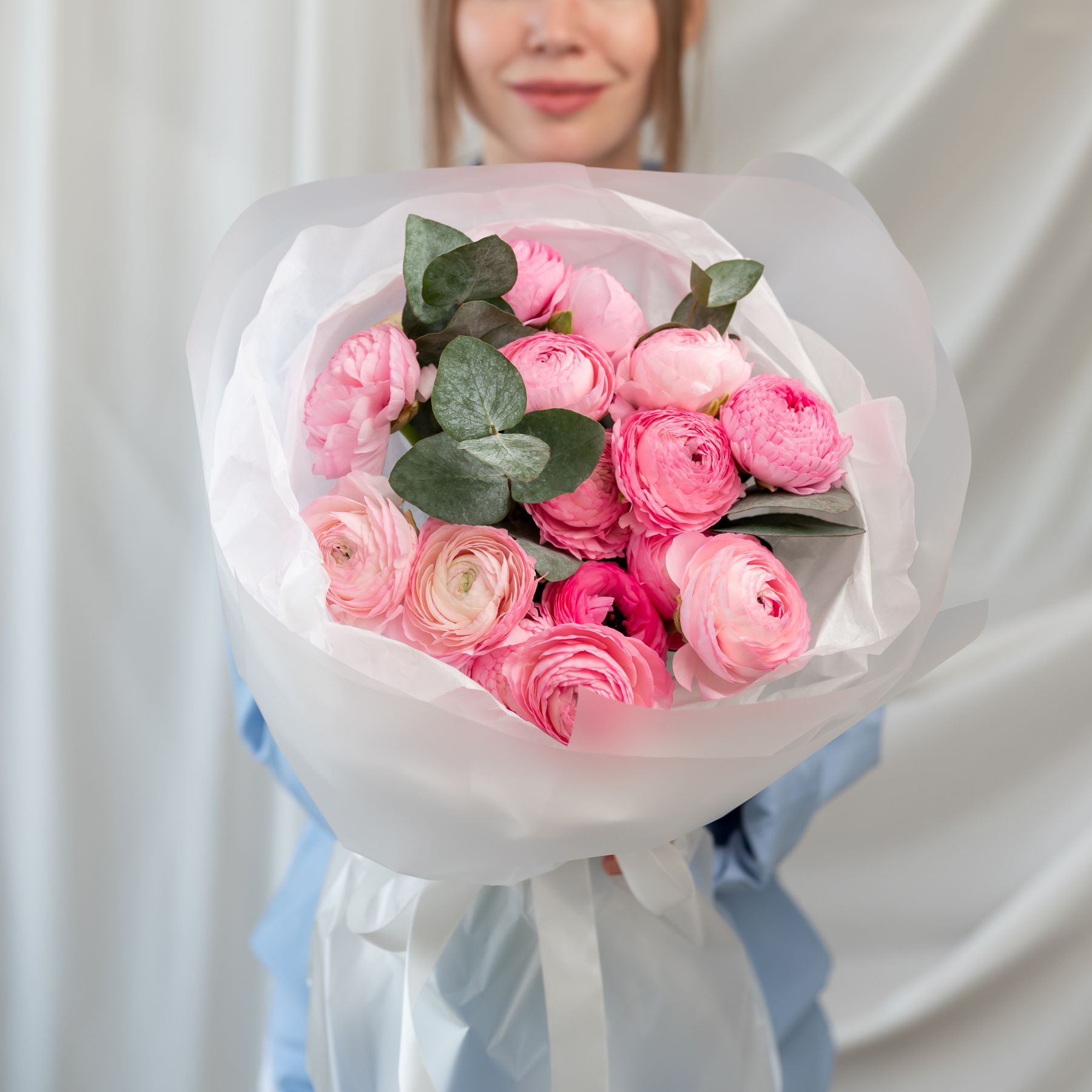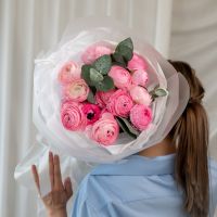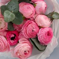 В составе 15 ранункулюсов с эвкалиптом в объемной красивой упаковке.