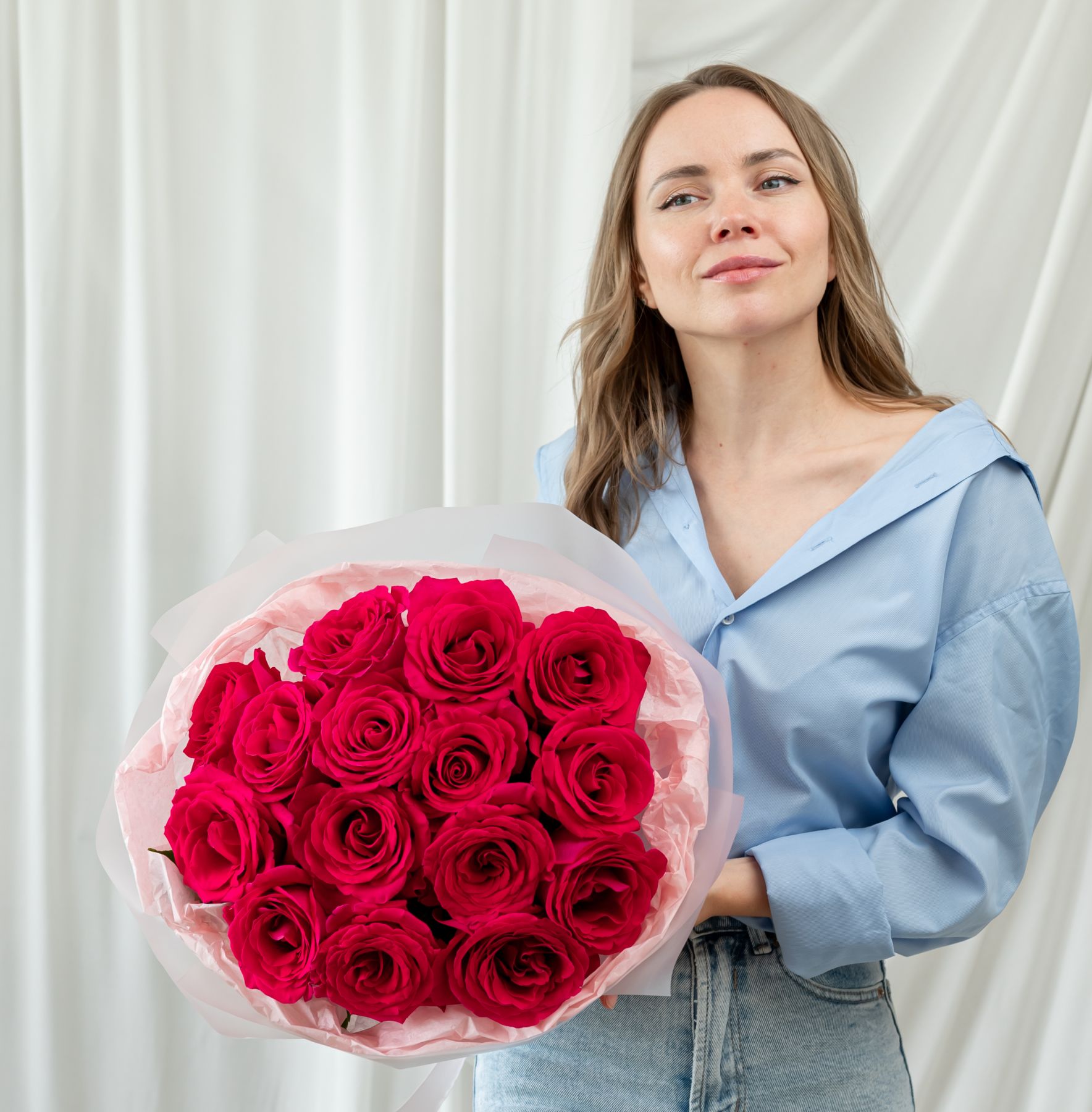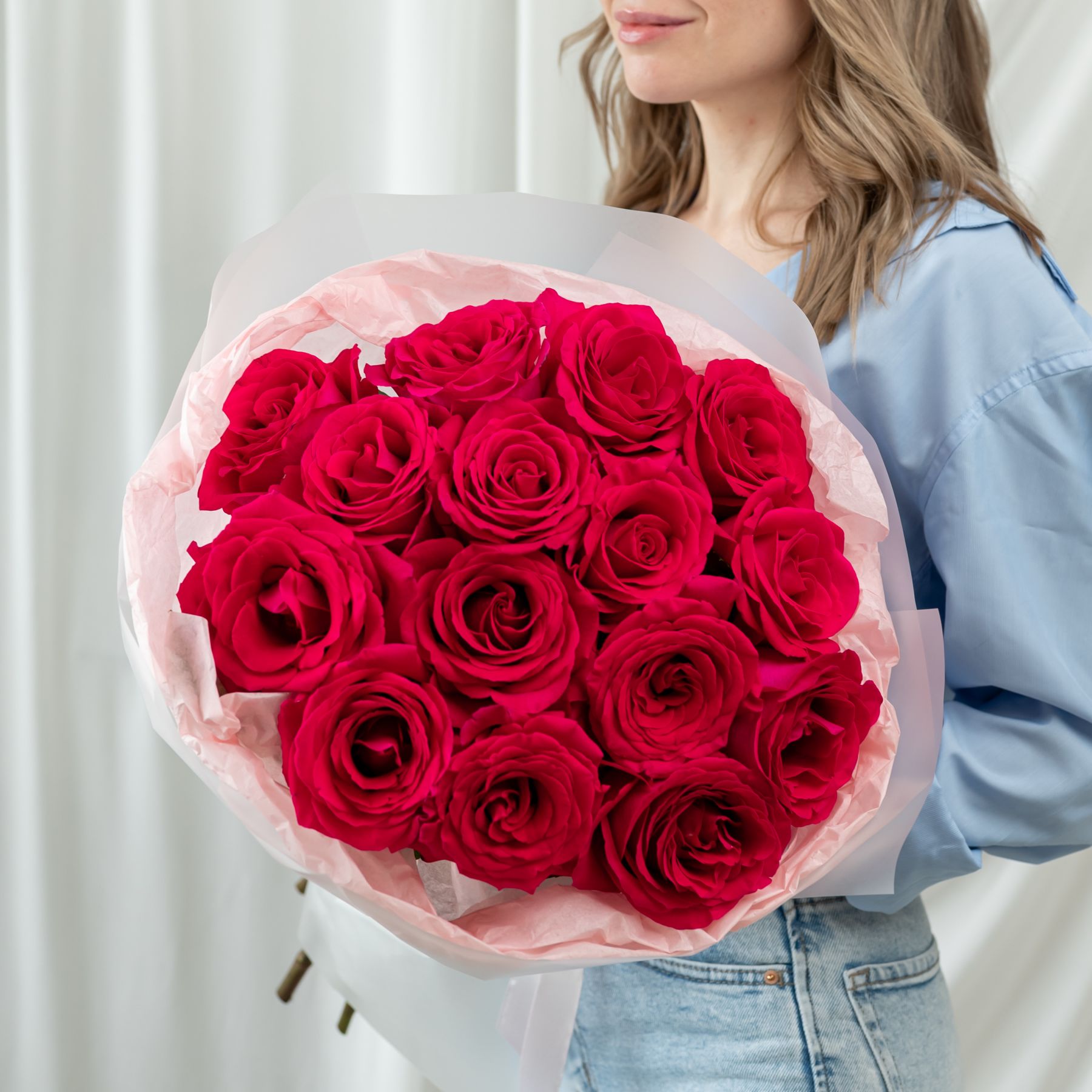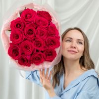 15 малиновых роз (60 см) в дизайнерской упаковке.