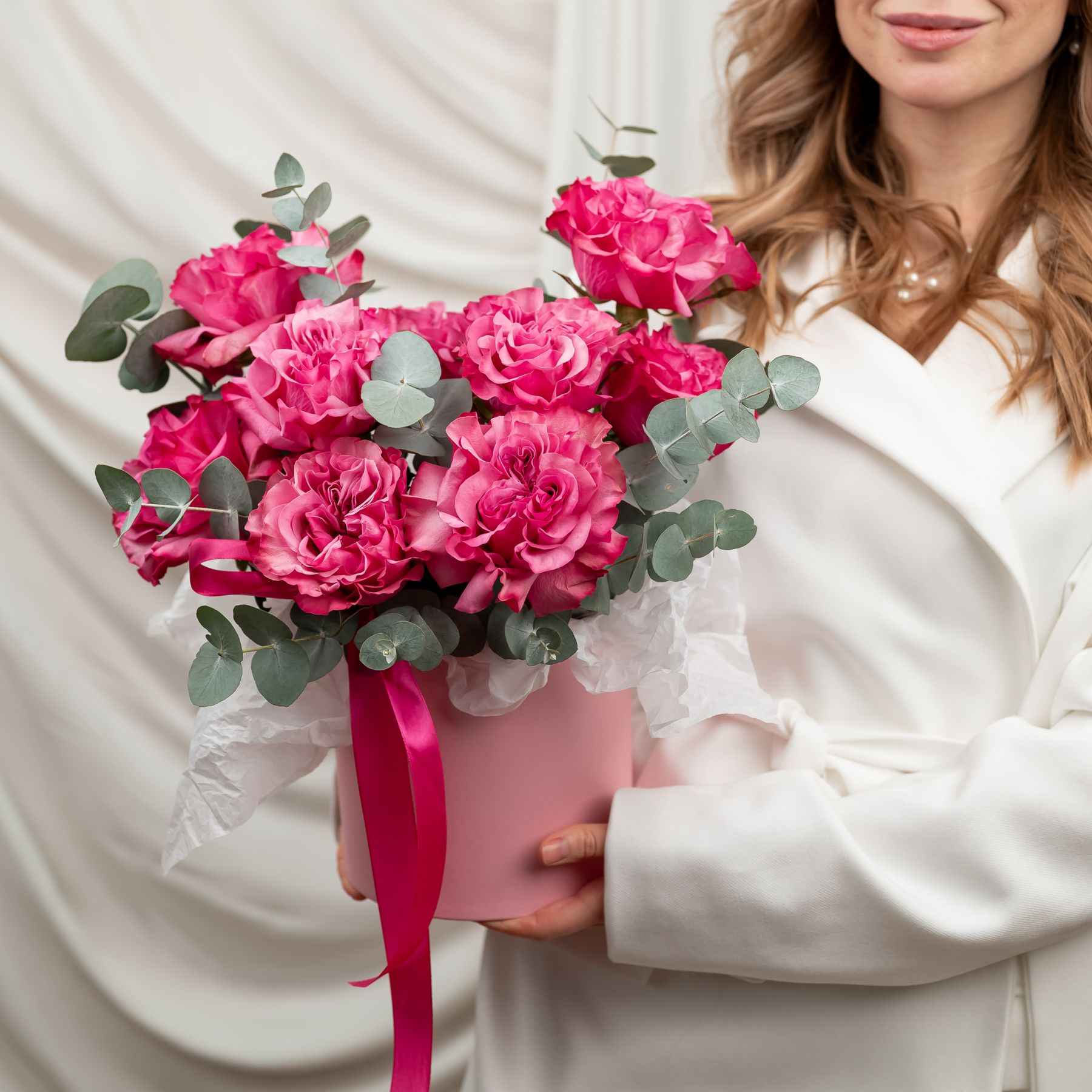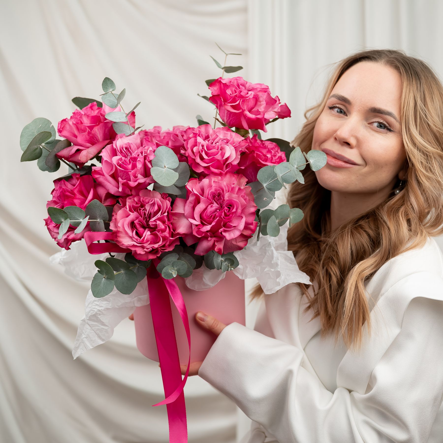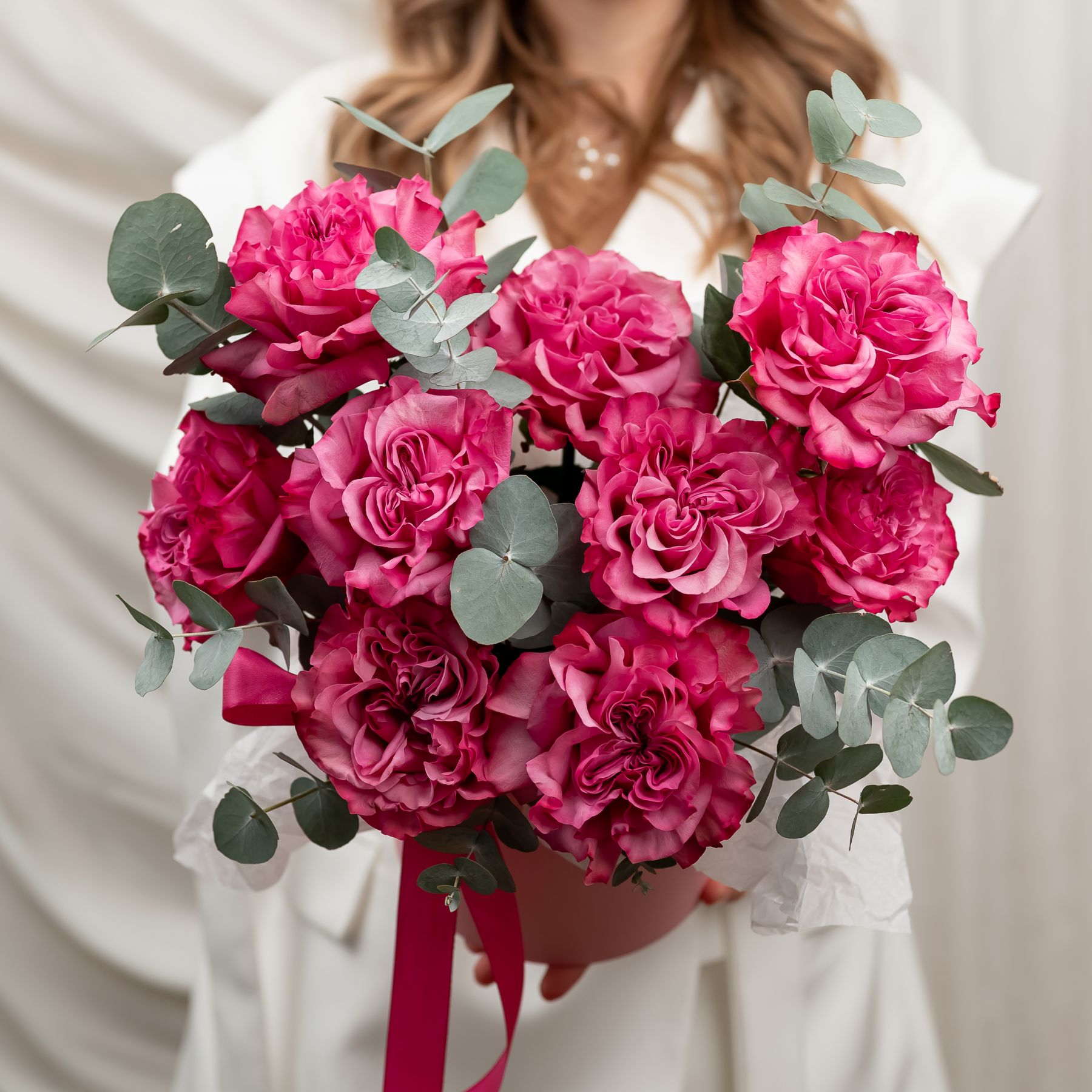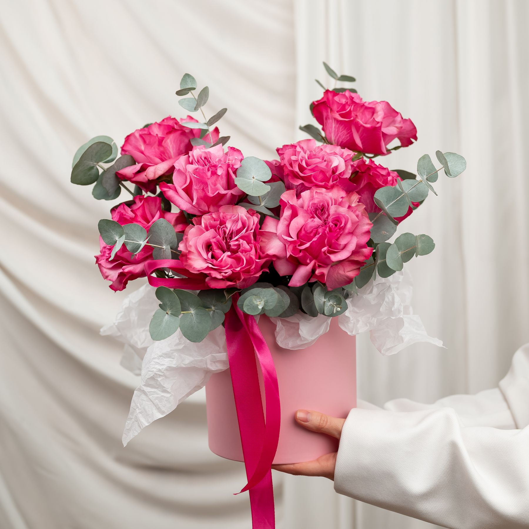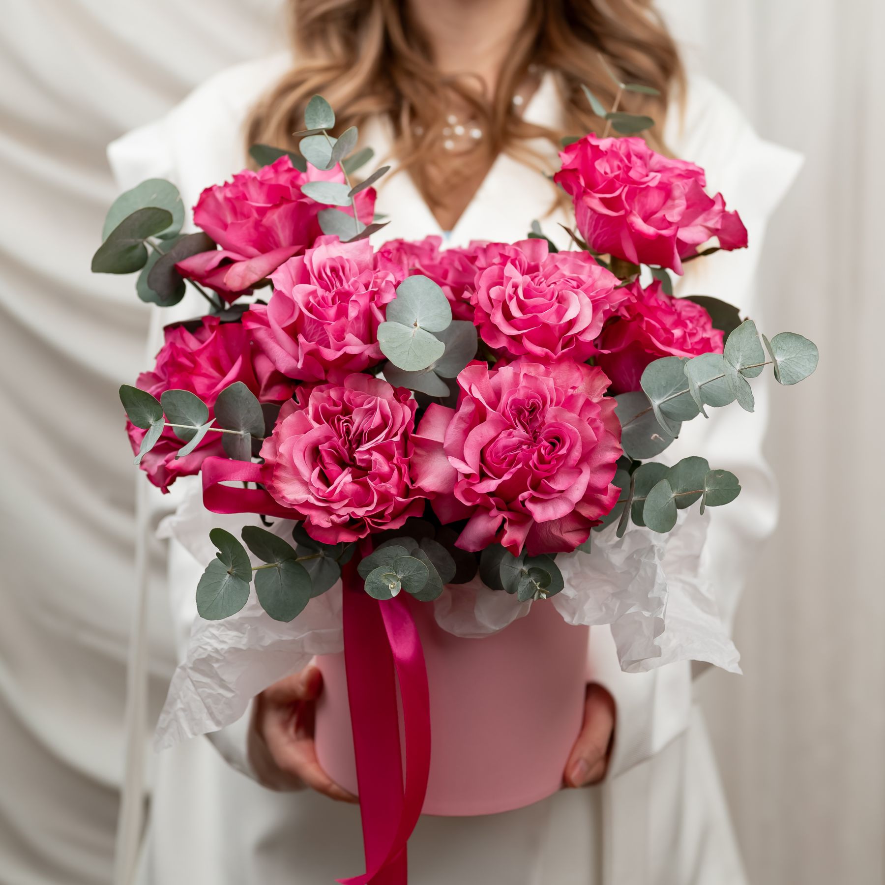 Состав: роза кантри блюз - 9 шт эвкалипт - 5-6 веток шляпная коробка - S