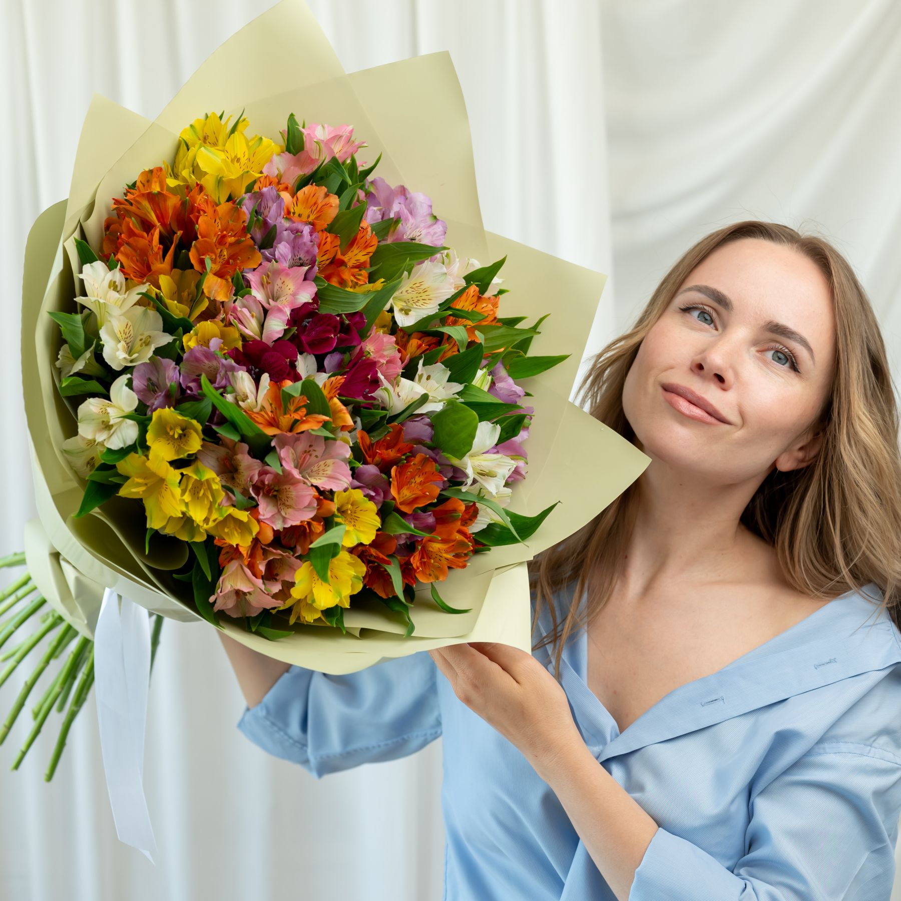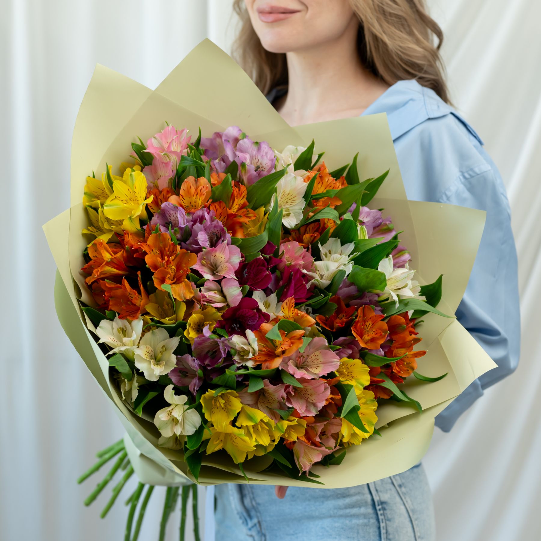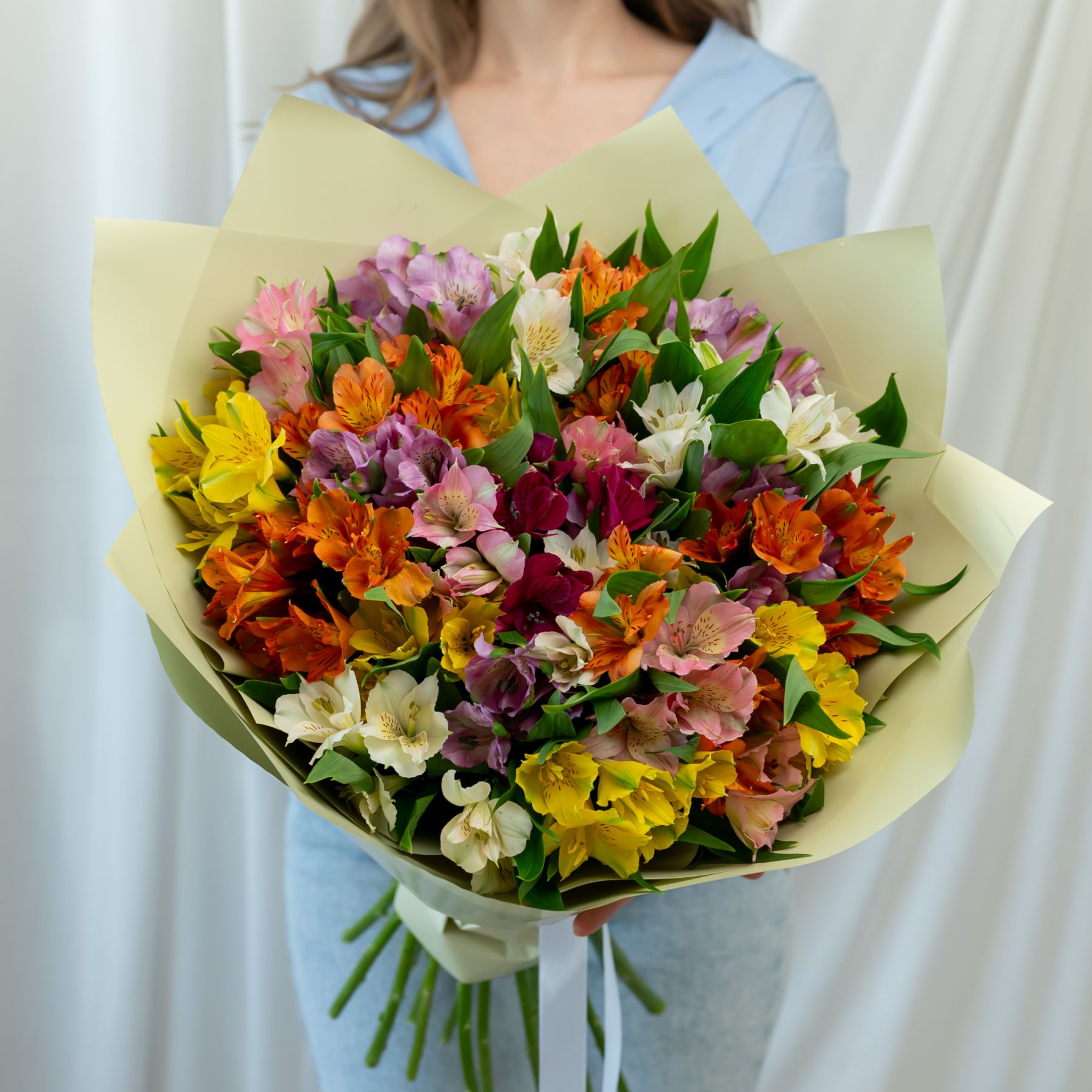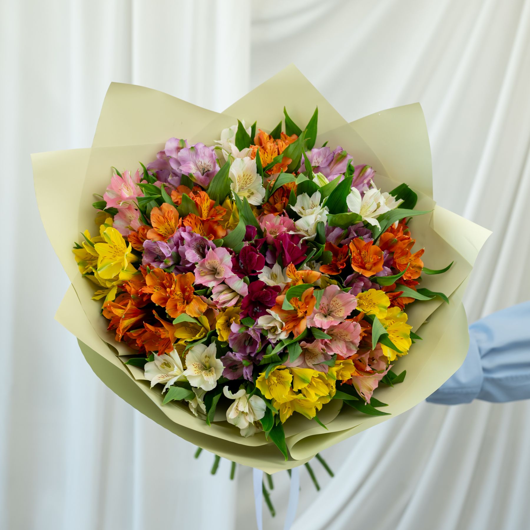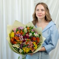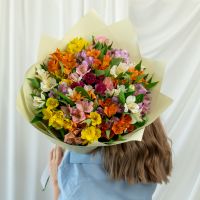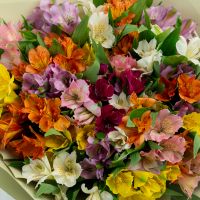 В составе 25 альстромерий микс в дизайнерской упаковке.