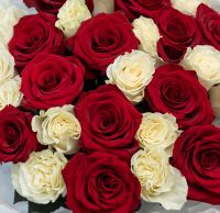 25 красно-белых роз (60 см) в дизайнерской упаковке.