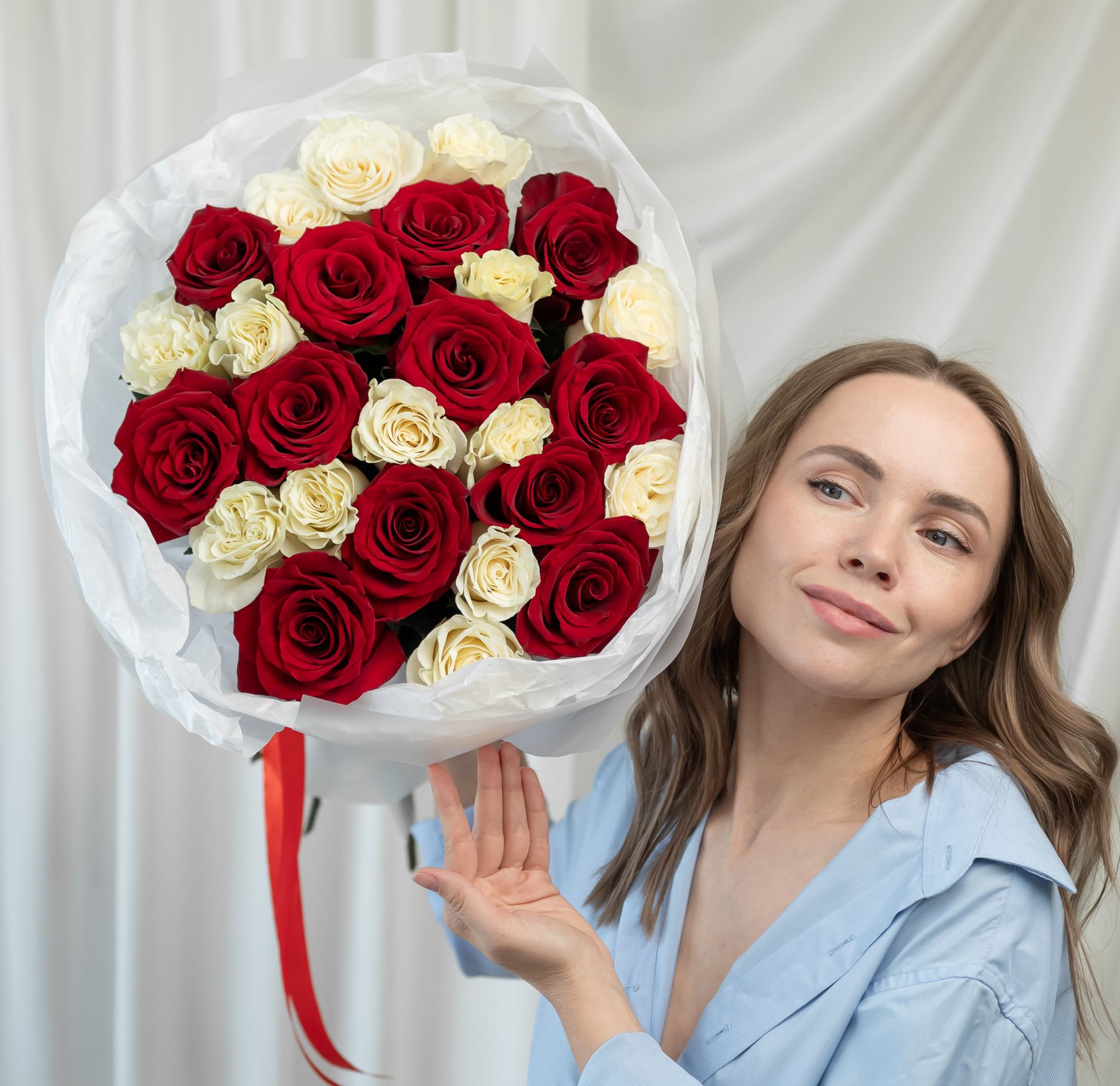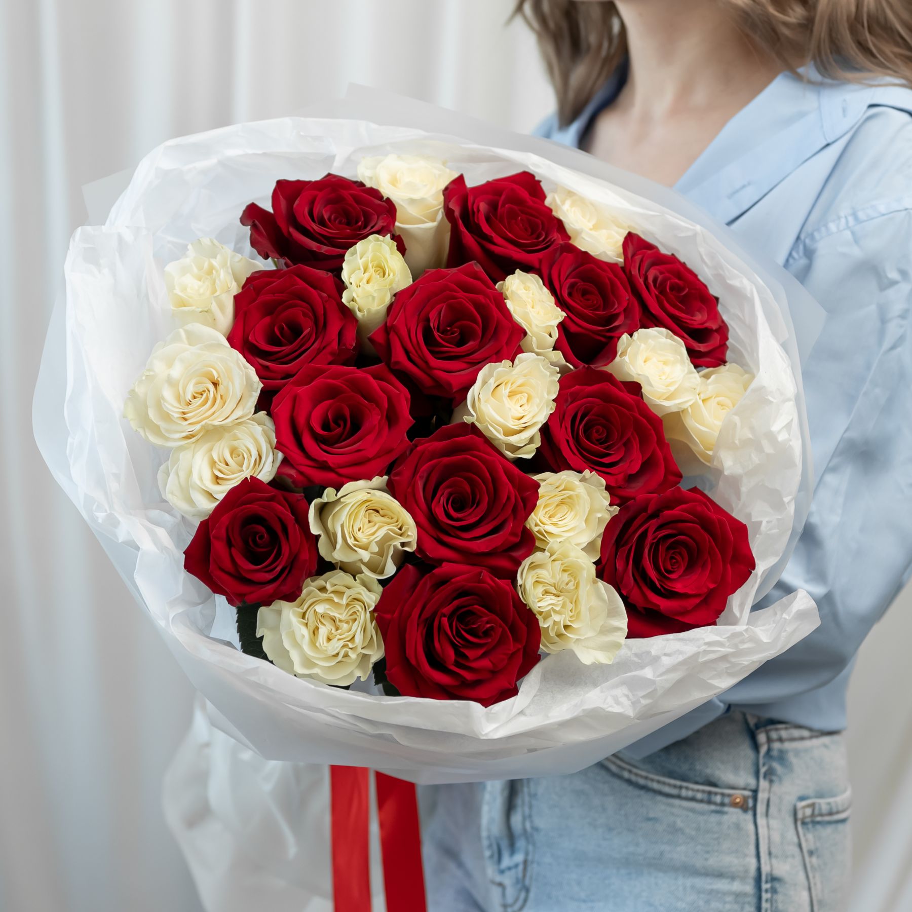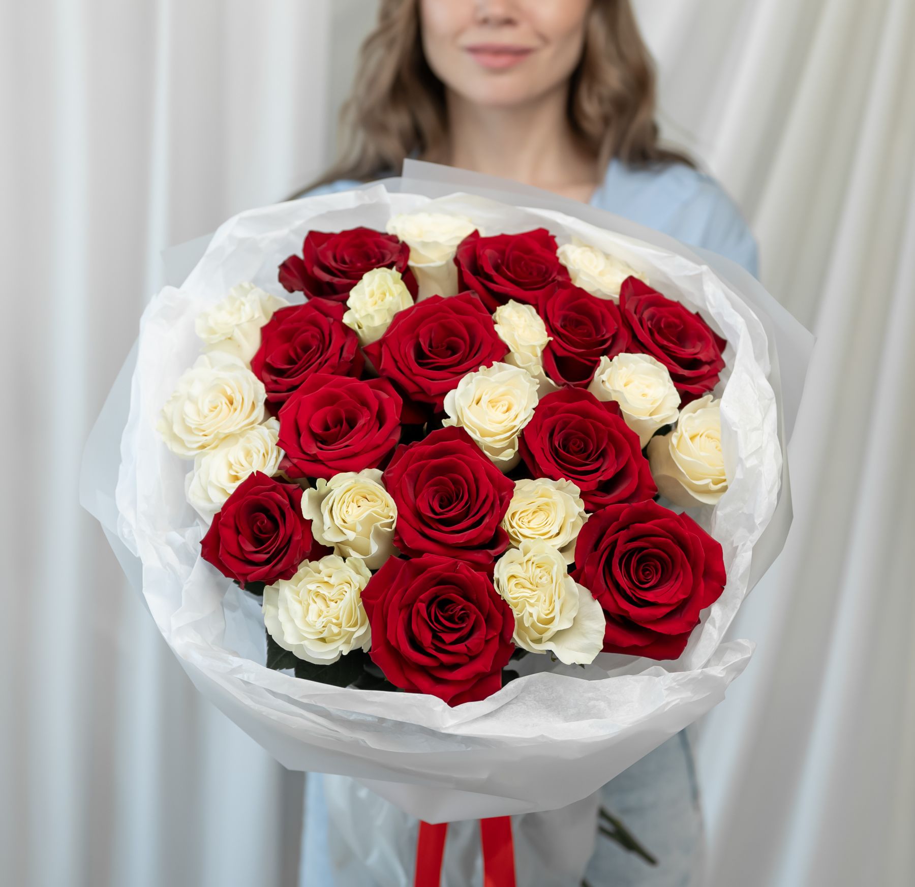 25 красно-белых роз (60 см) в дизайнерской упаковке.