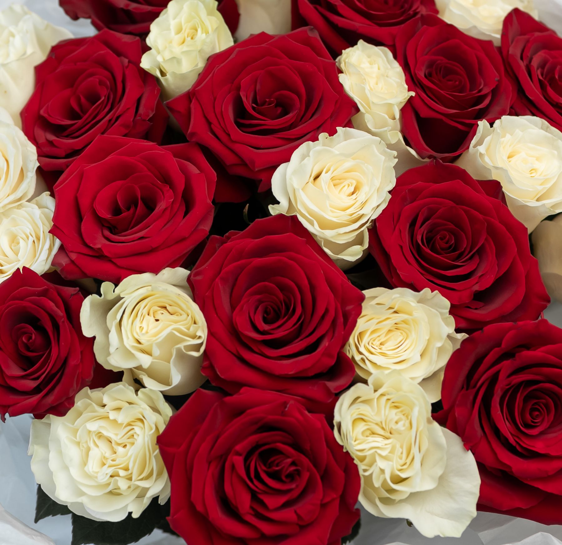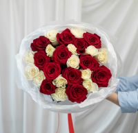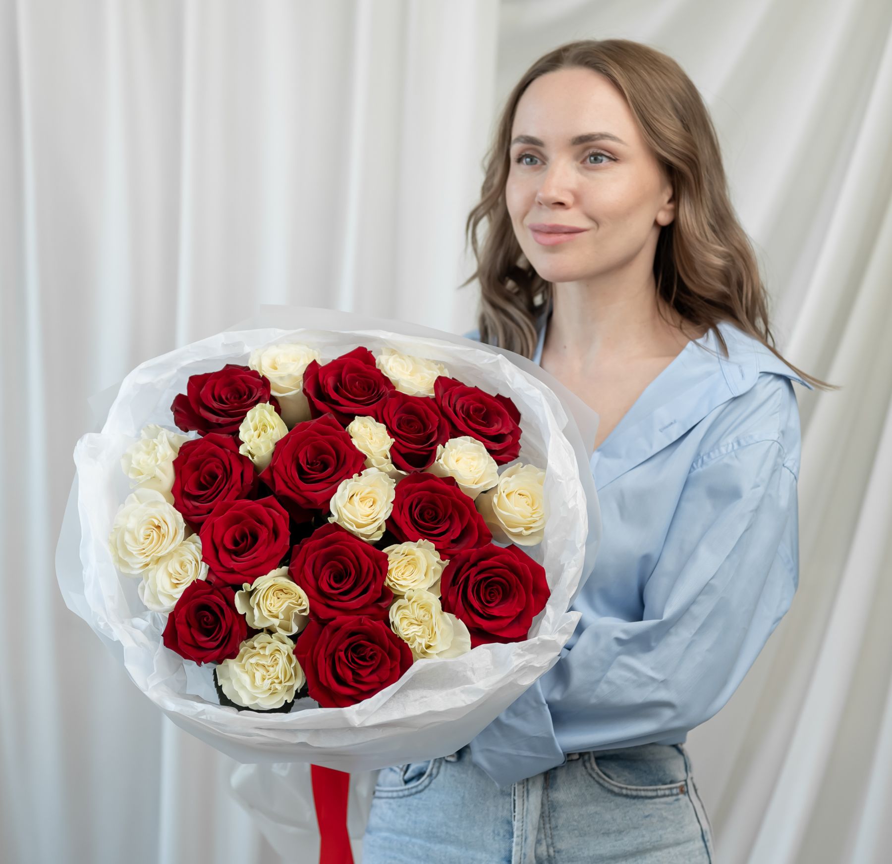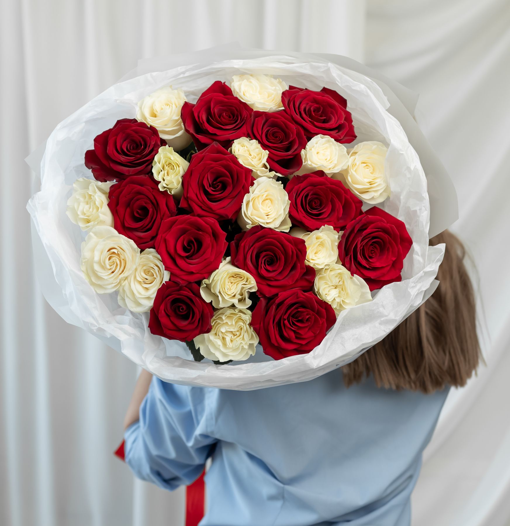 25 красно-белых роз (60 см) в дизайнерской упаковке.
