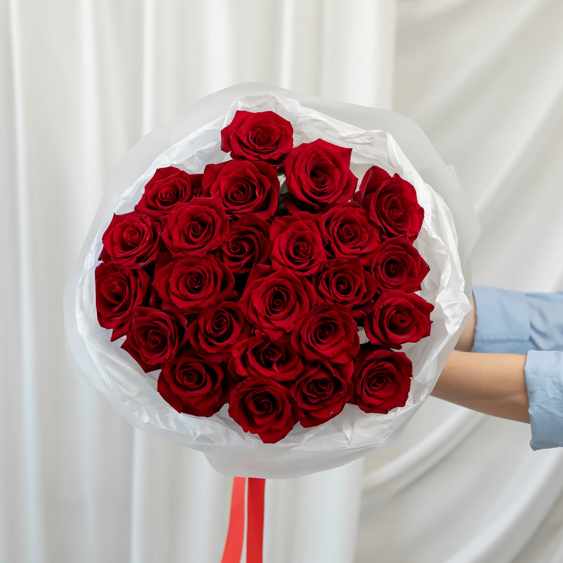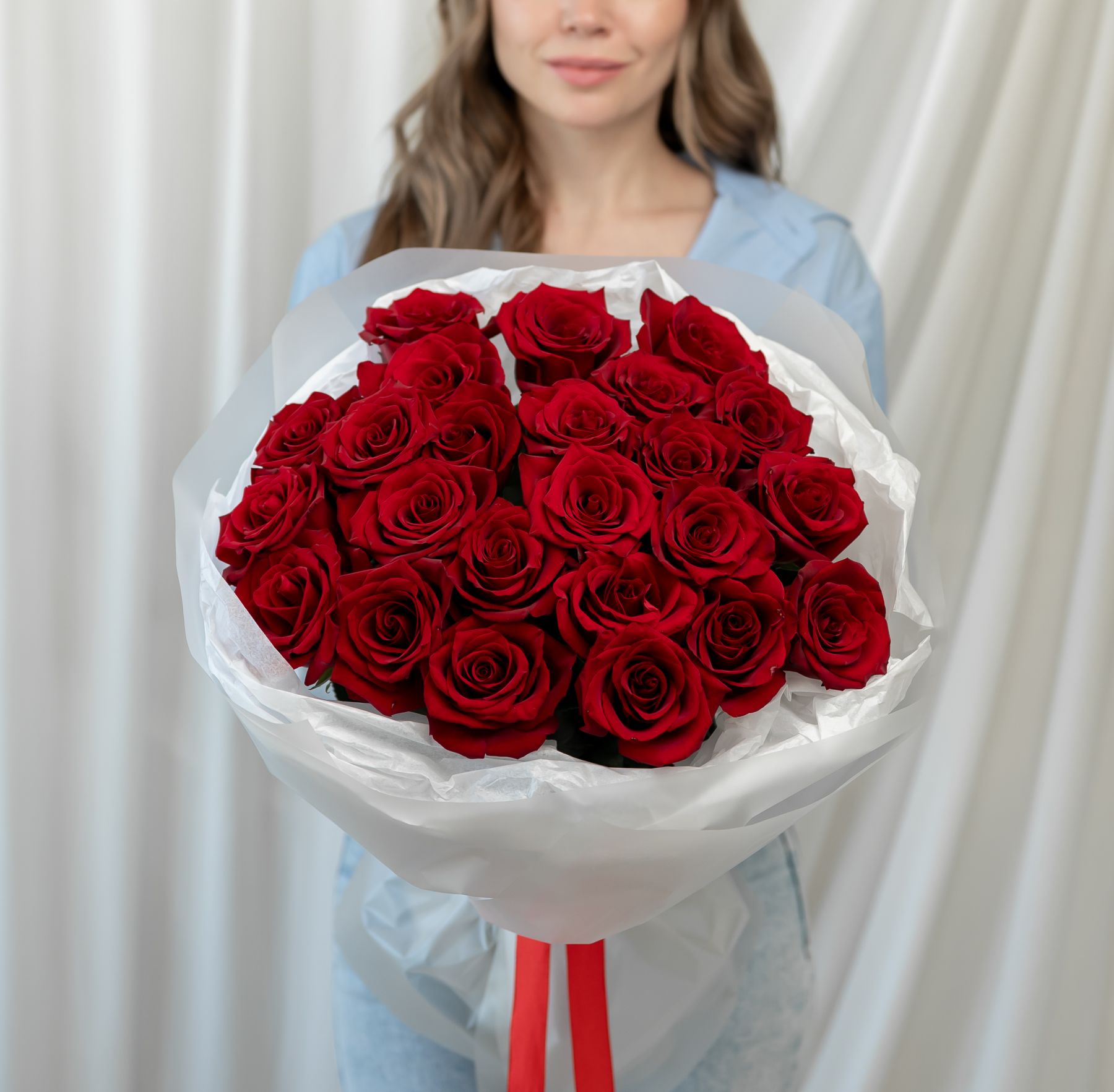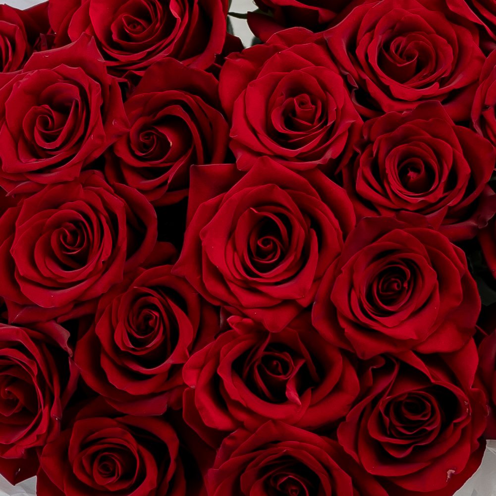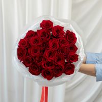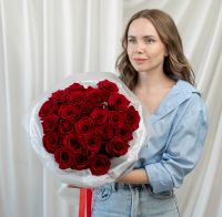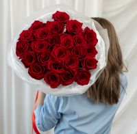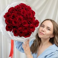 25 красных роз (60 см) в дизайнерской упаковке.