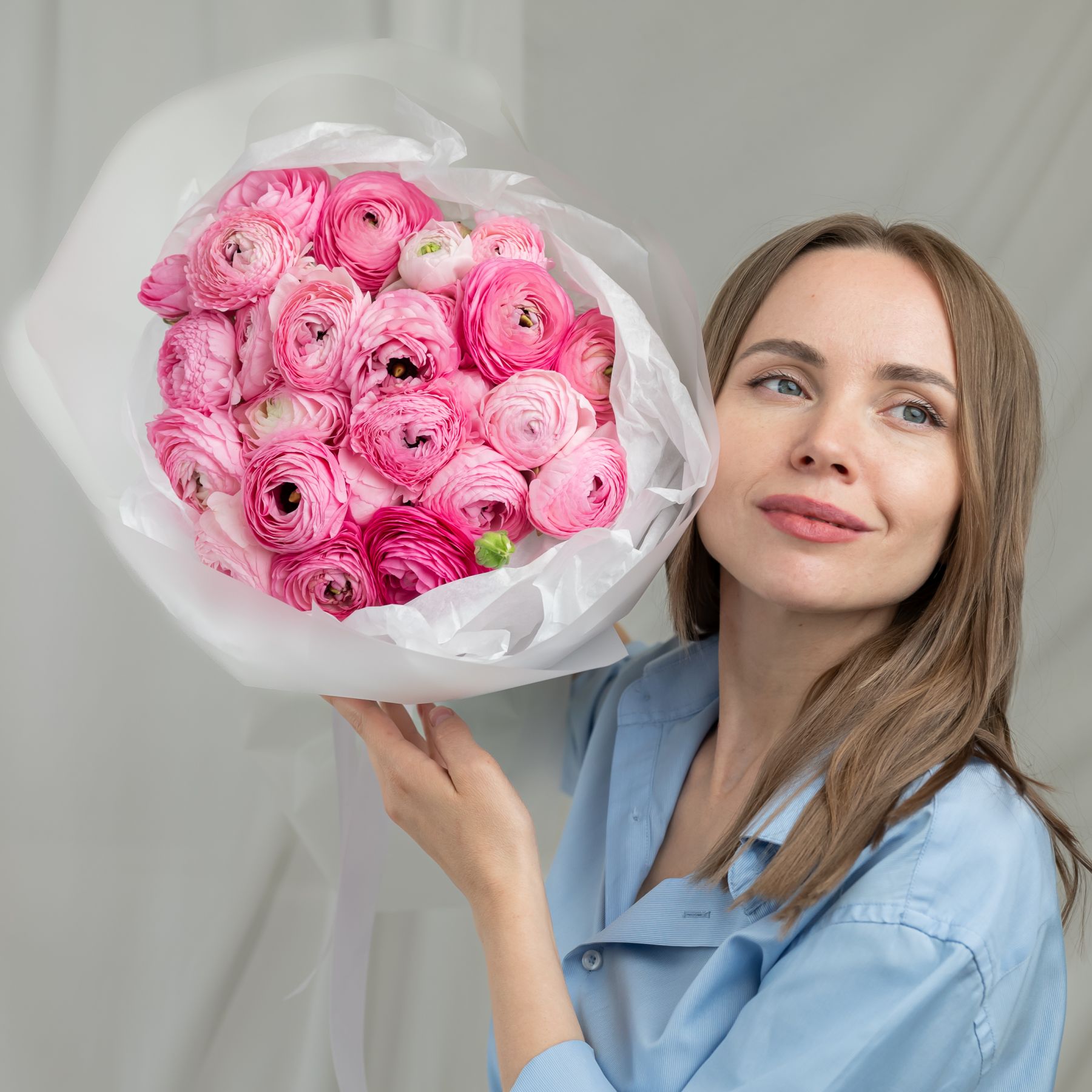 В составе 25 ранункулюсов в объемной красивой упаковке.