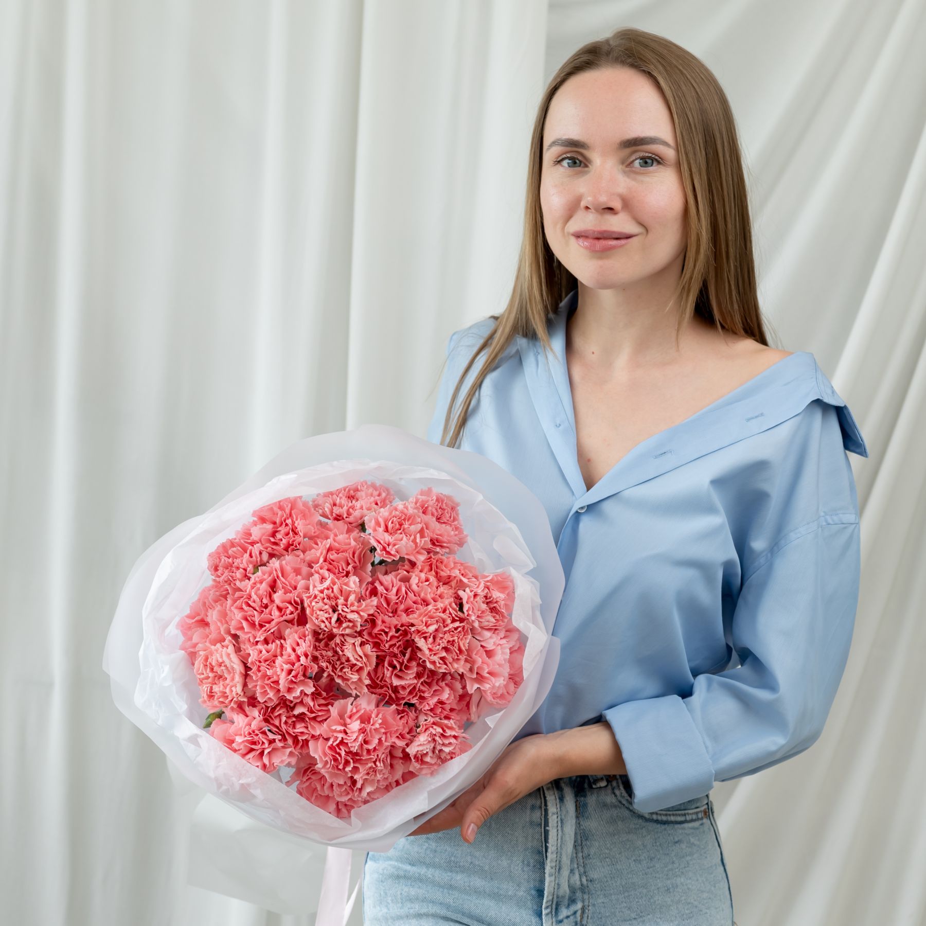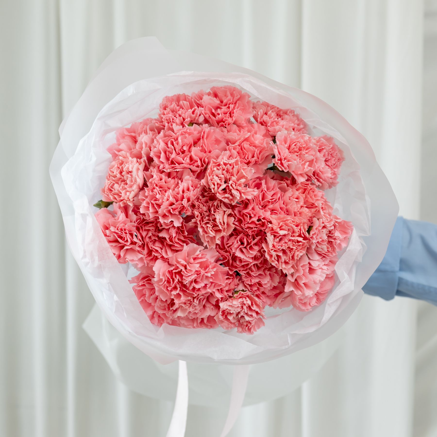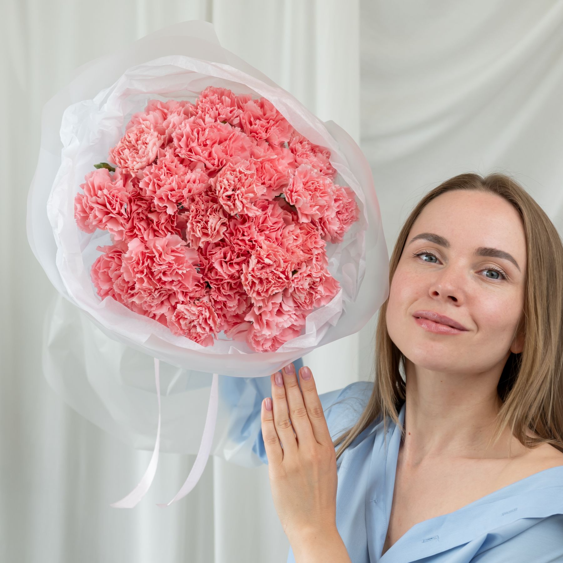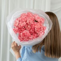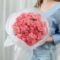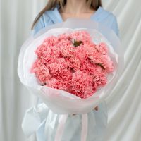 В составе 25 розовых диантусов в дизайнерской упаковке.