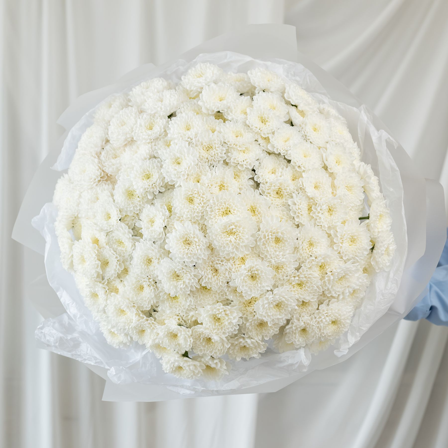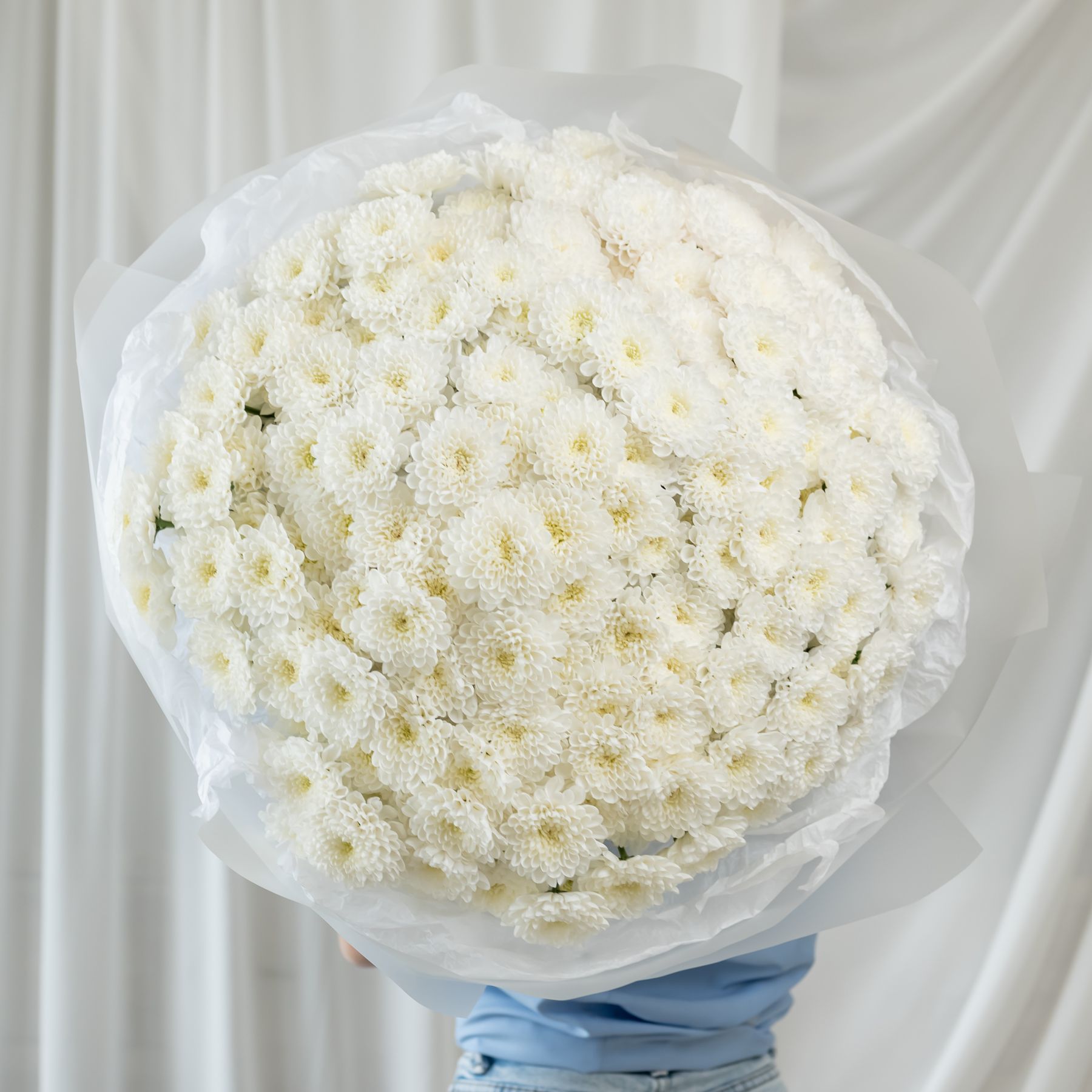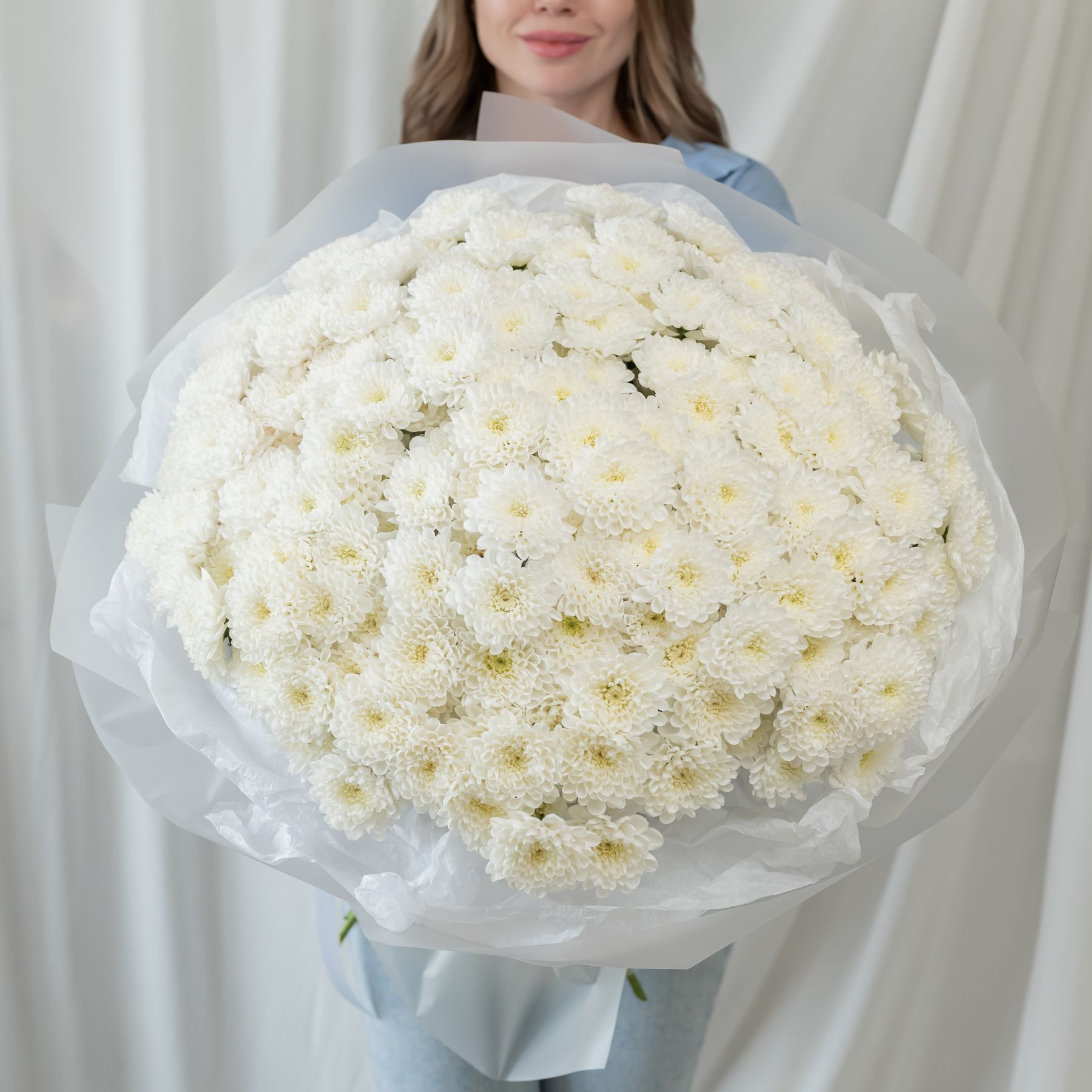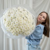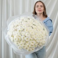 В составе 35 белых хризантем (сорт Алтай) в дизайнерской упаковке.