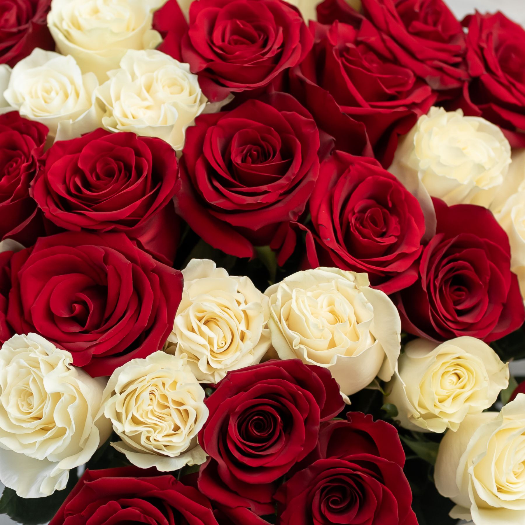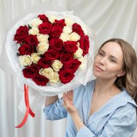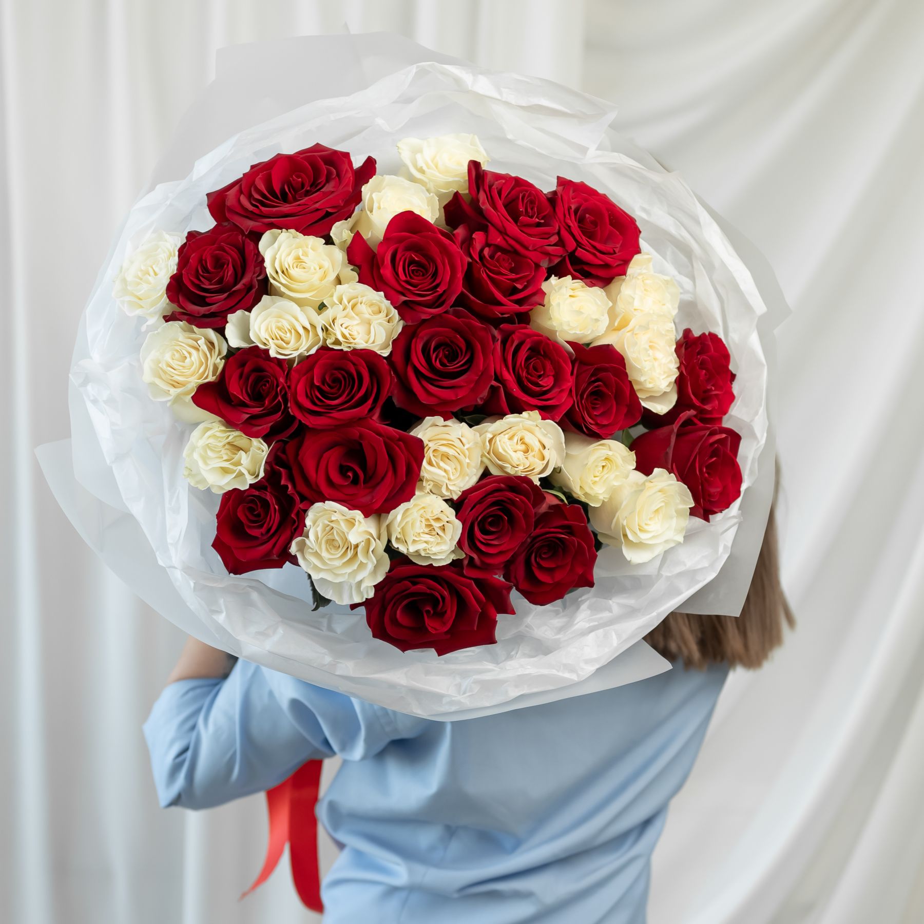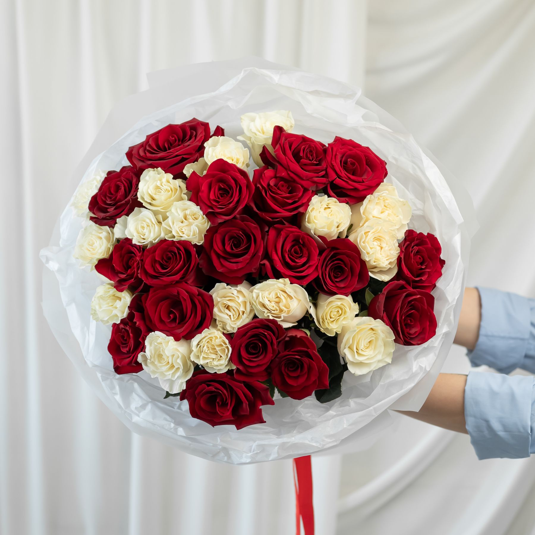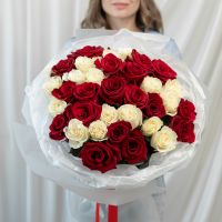 35 красно-белых роз (60 см) в дизайнерской упаковке.
