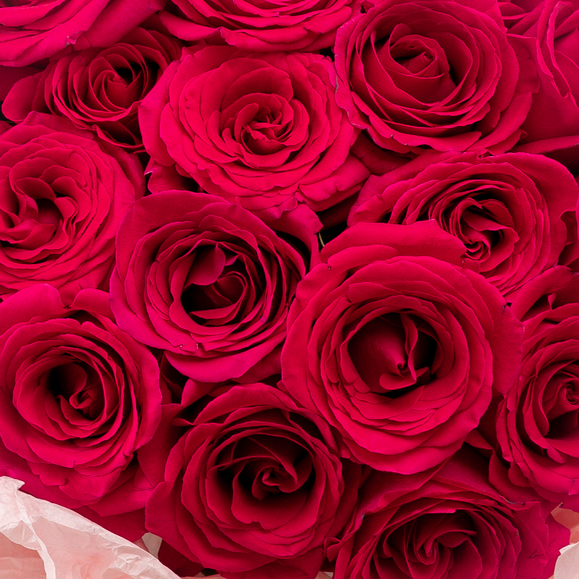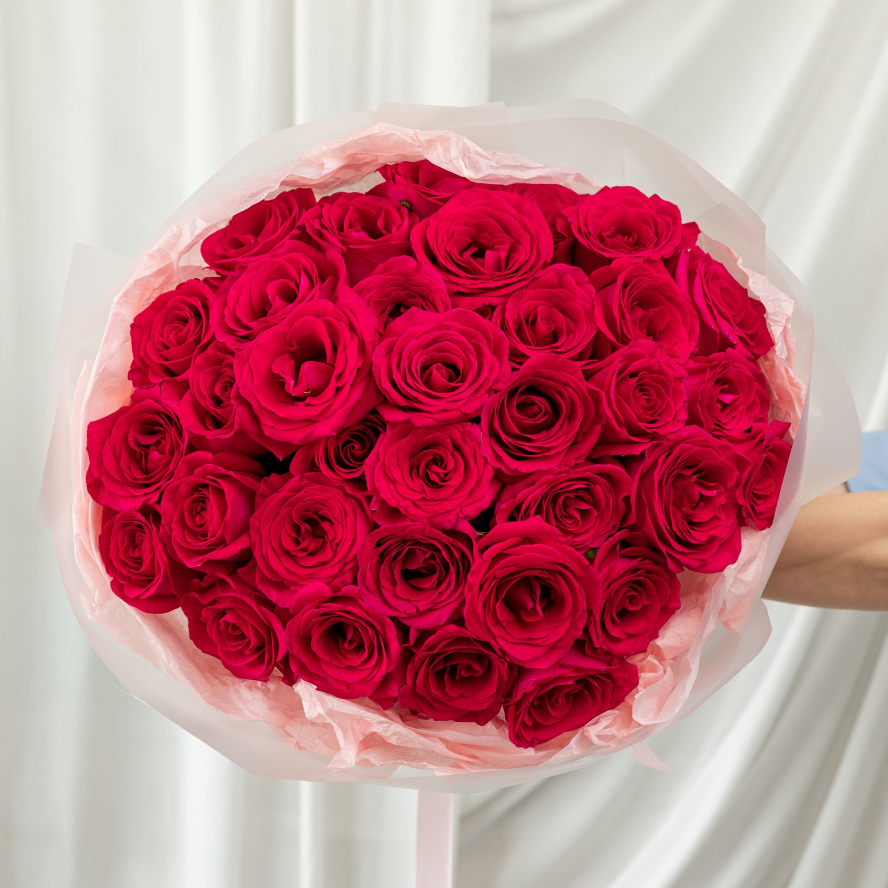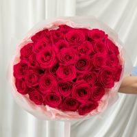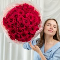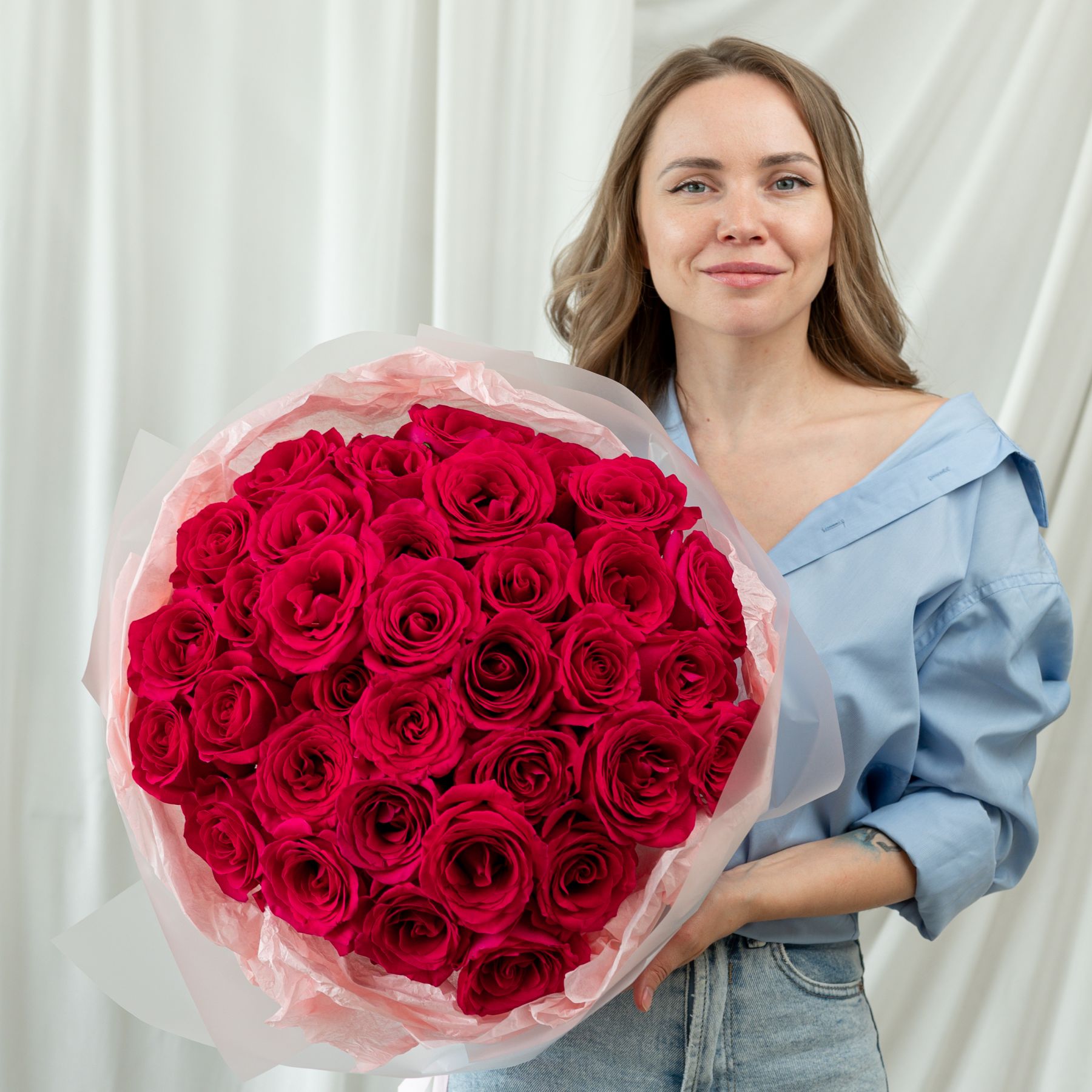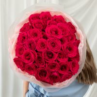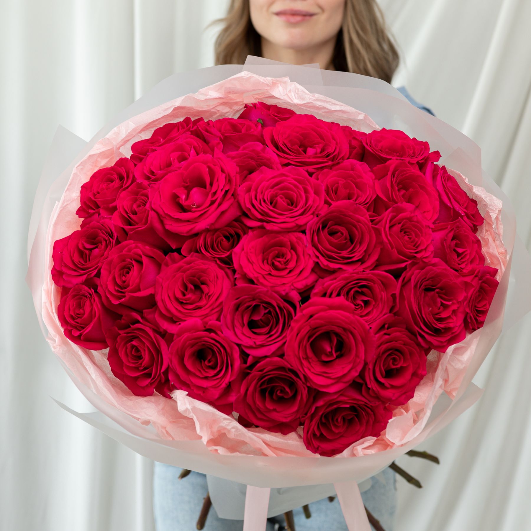 35 малиновых роз (60 см) в дизайнерской упаковке.