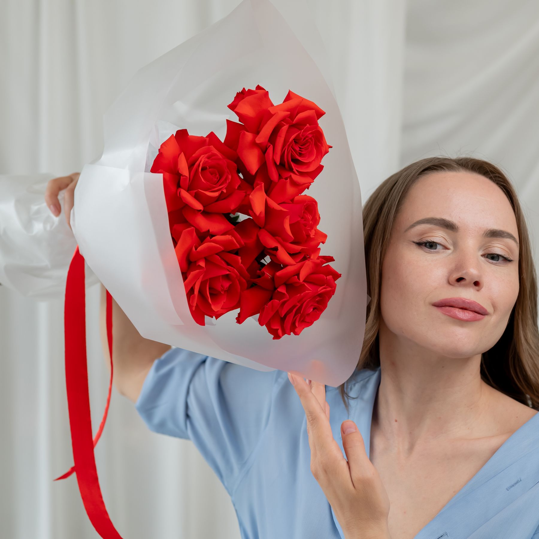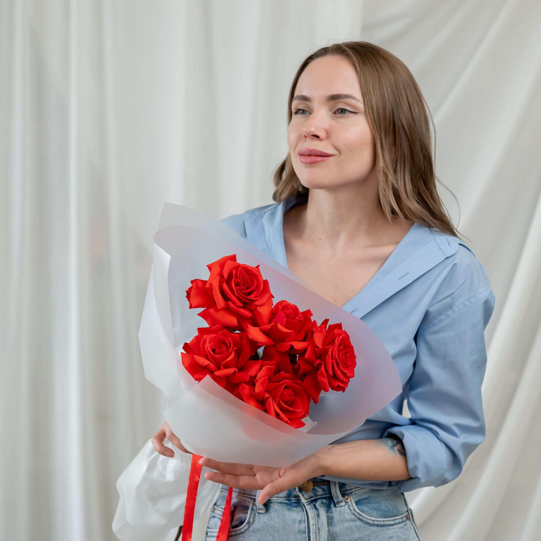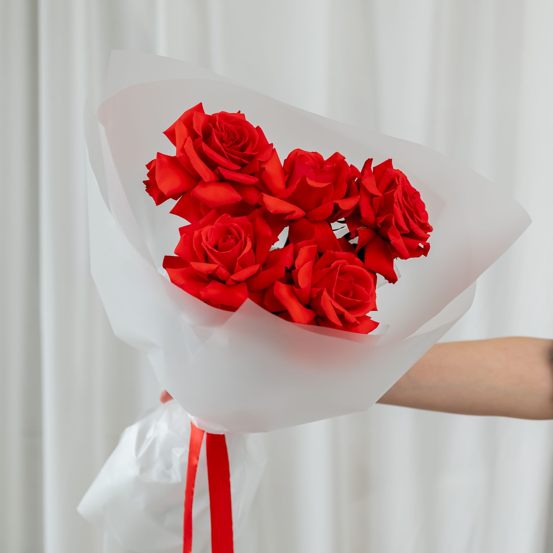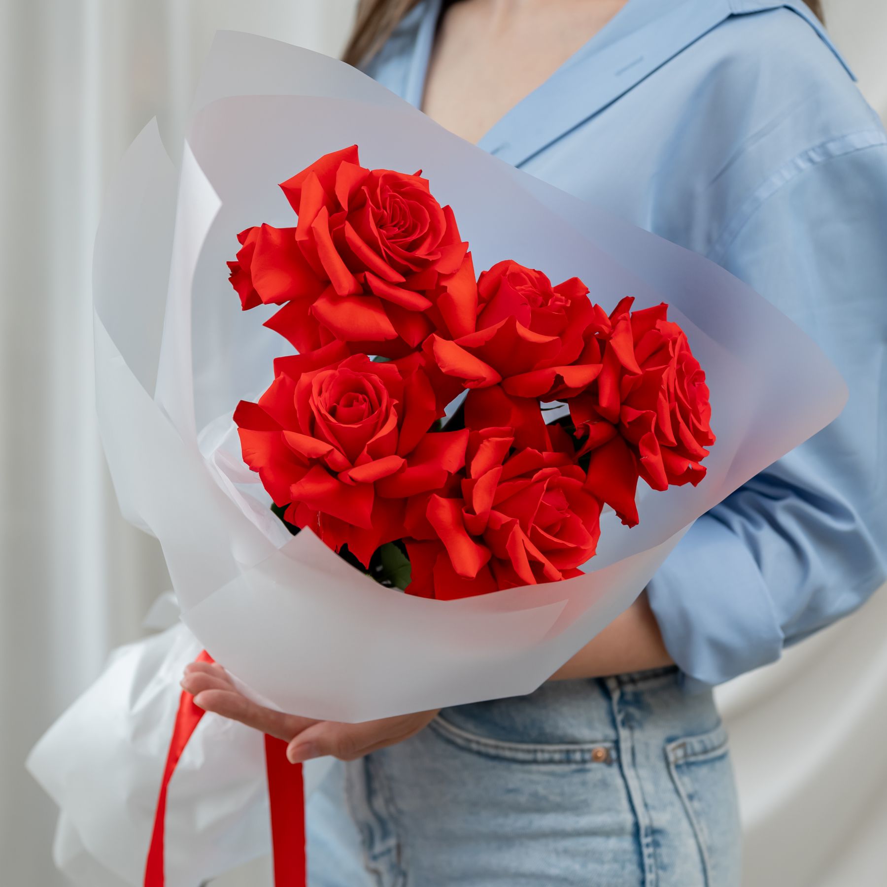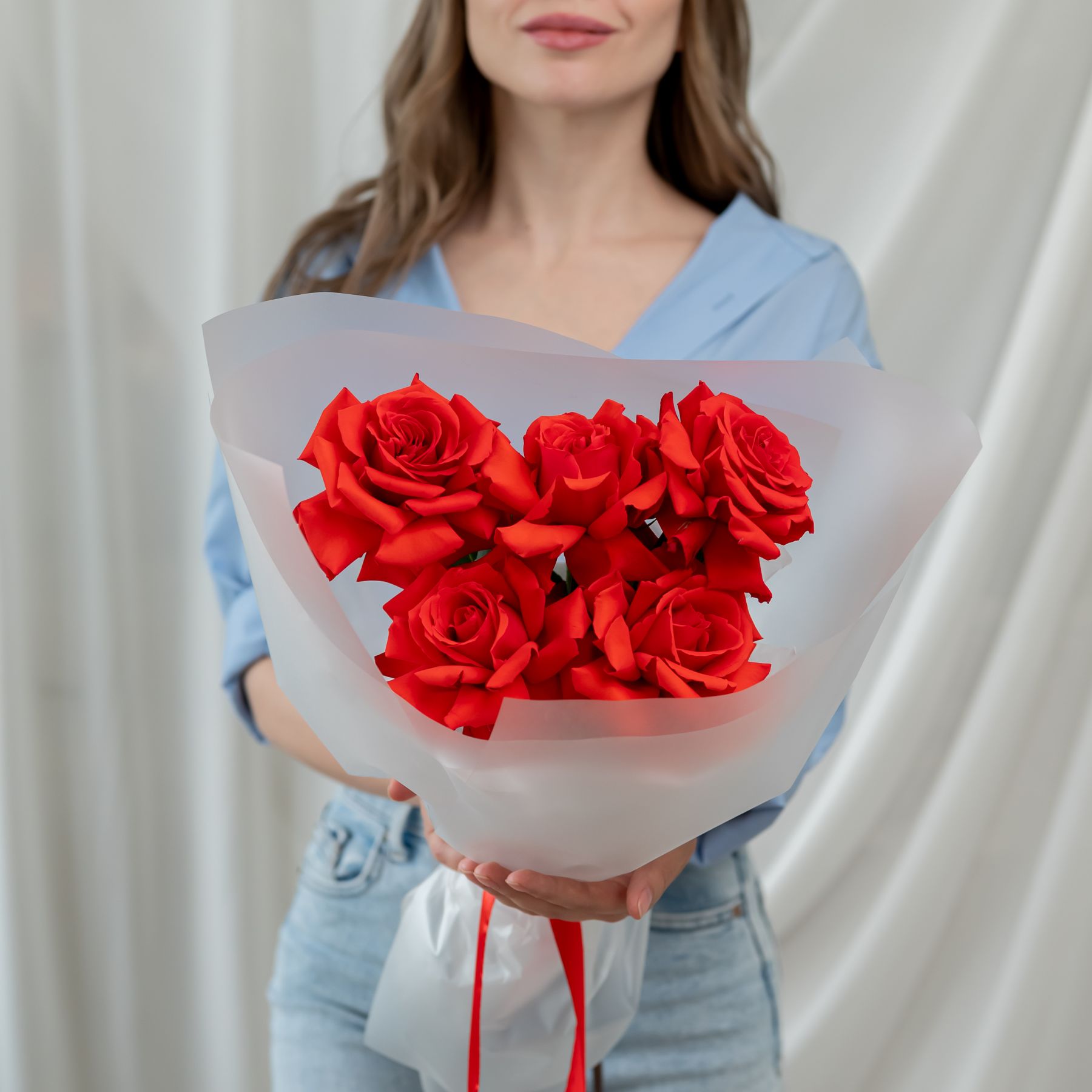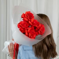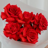 В составе 5 Французскиз роз (сорт Нина) в объемной красивой упаковке.