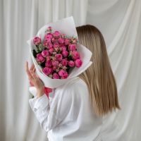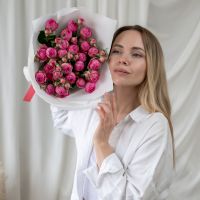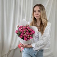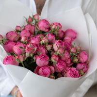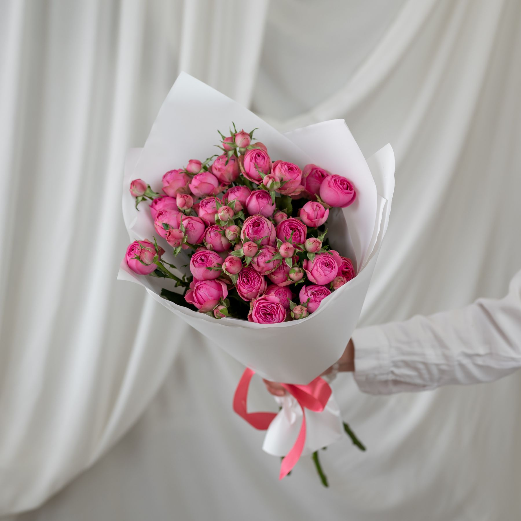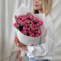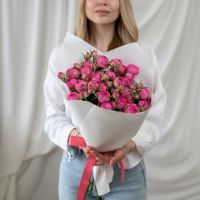 В составе 5 кустовых розовых роз (сорт Кения) 50 см в дизайнерской упаковке.