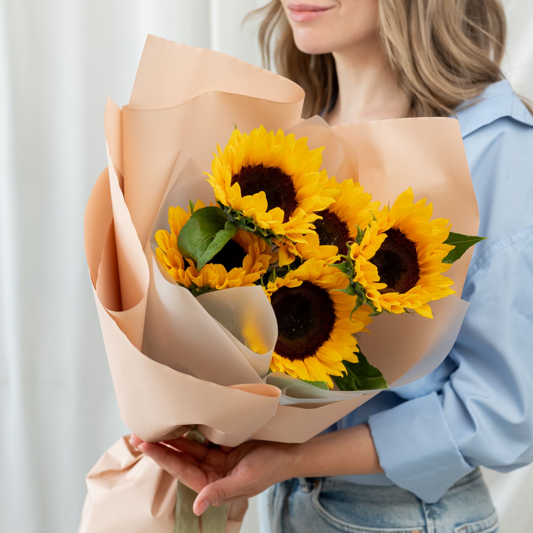 В составе 15 подсолнухов в дизайнерской упаковке.