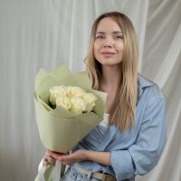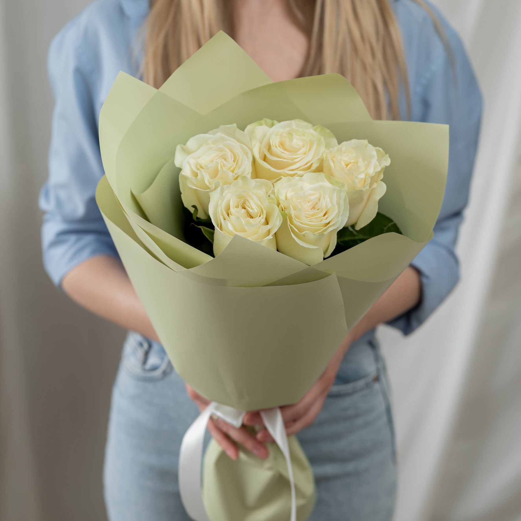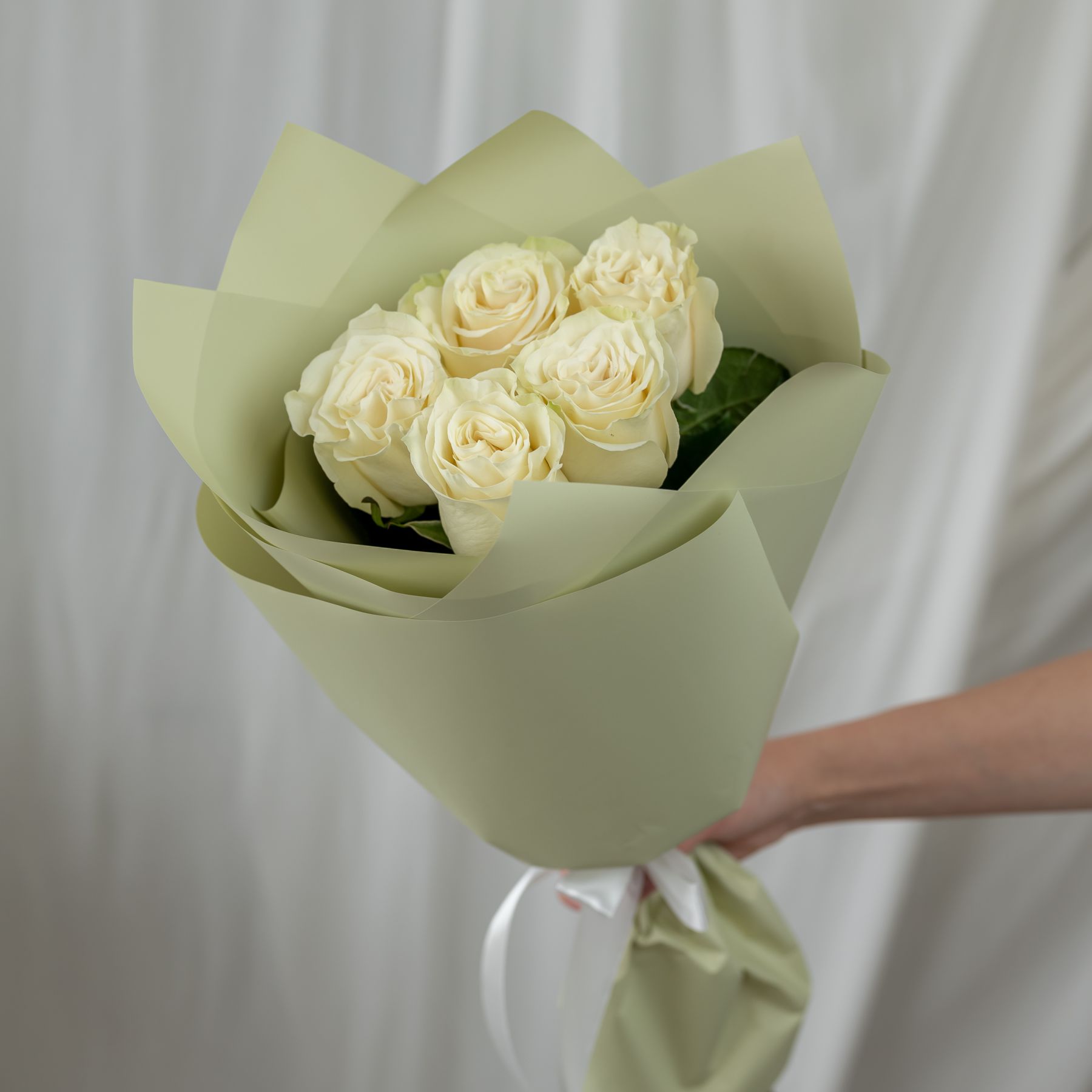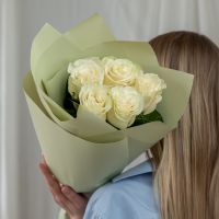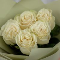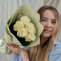 5 белых роз Эквадор (сорт Мондиаль) в стильной упаковке.
