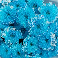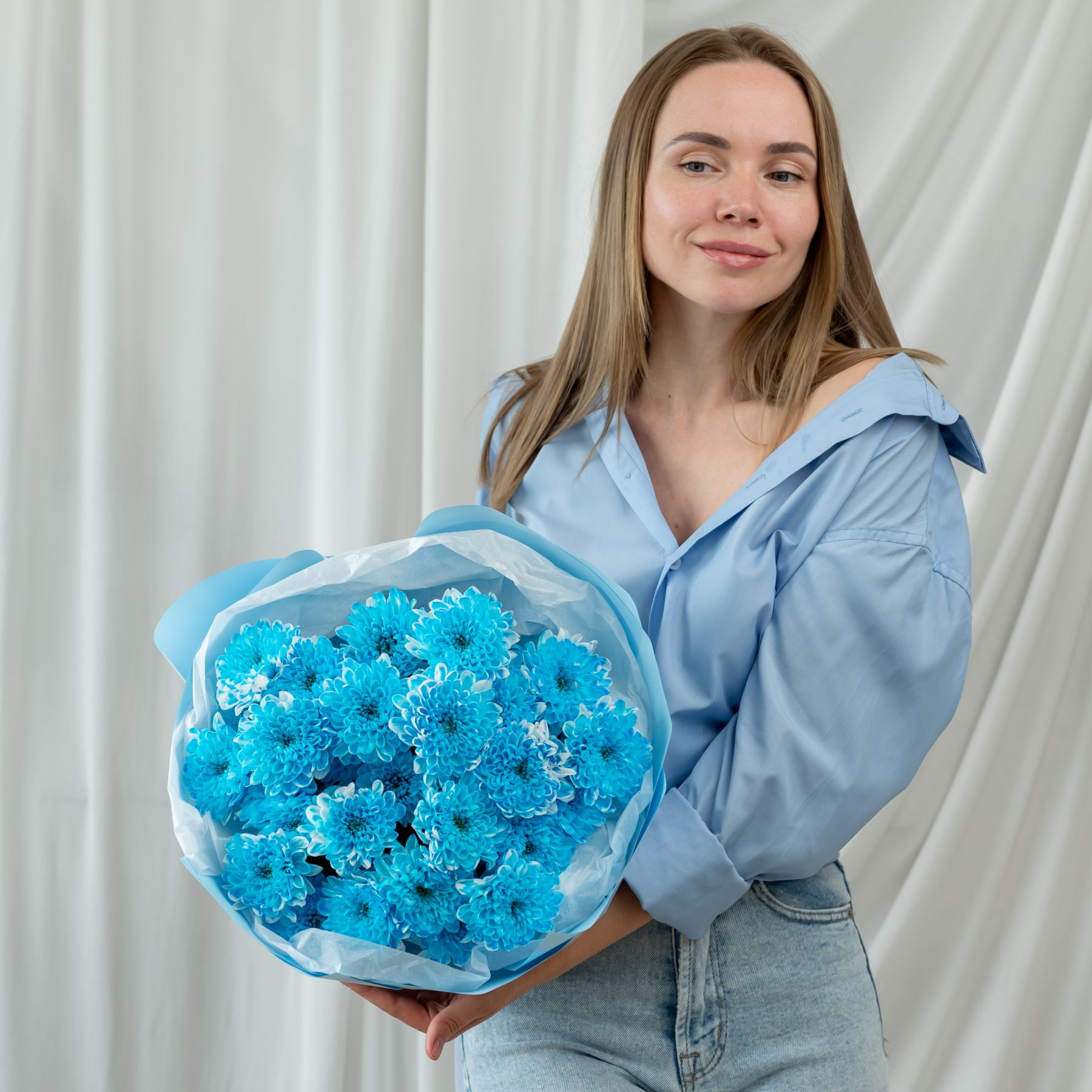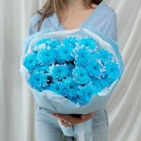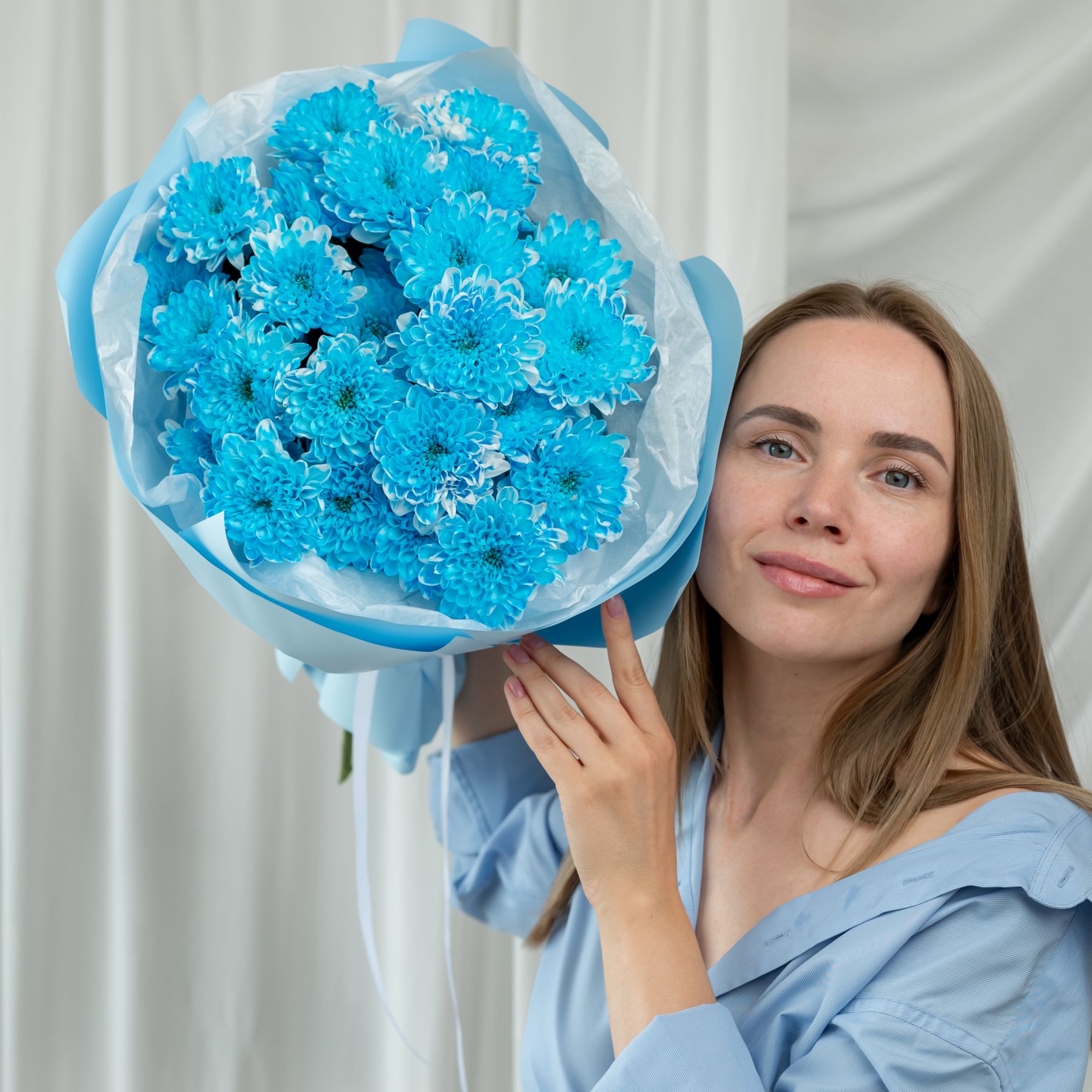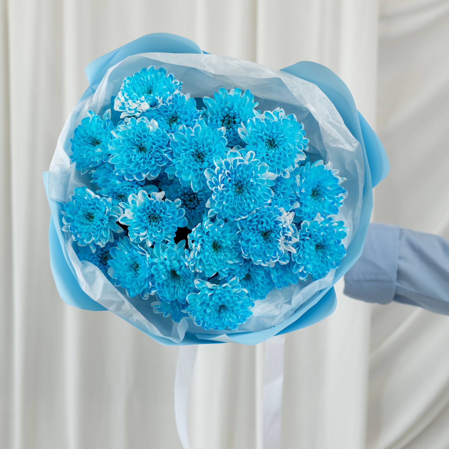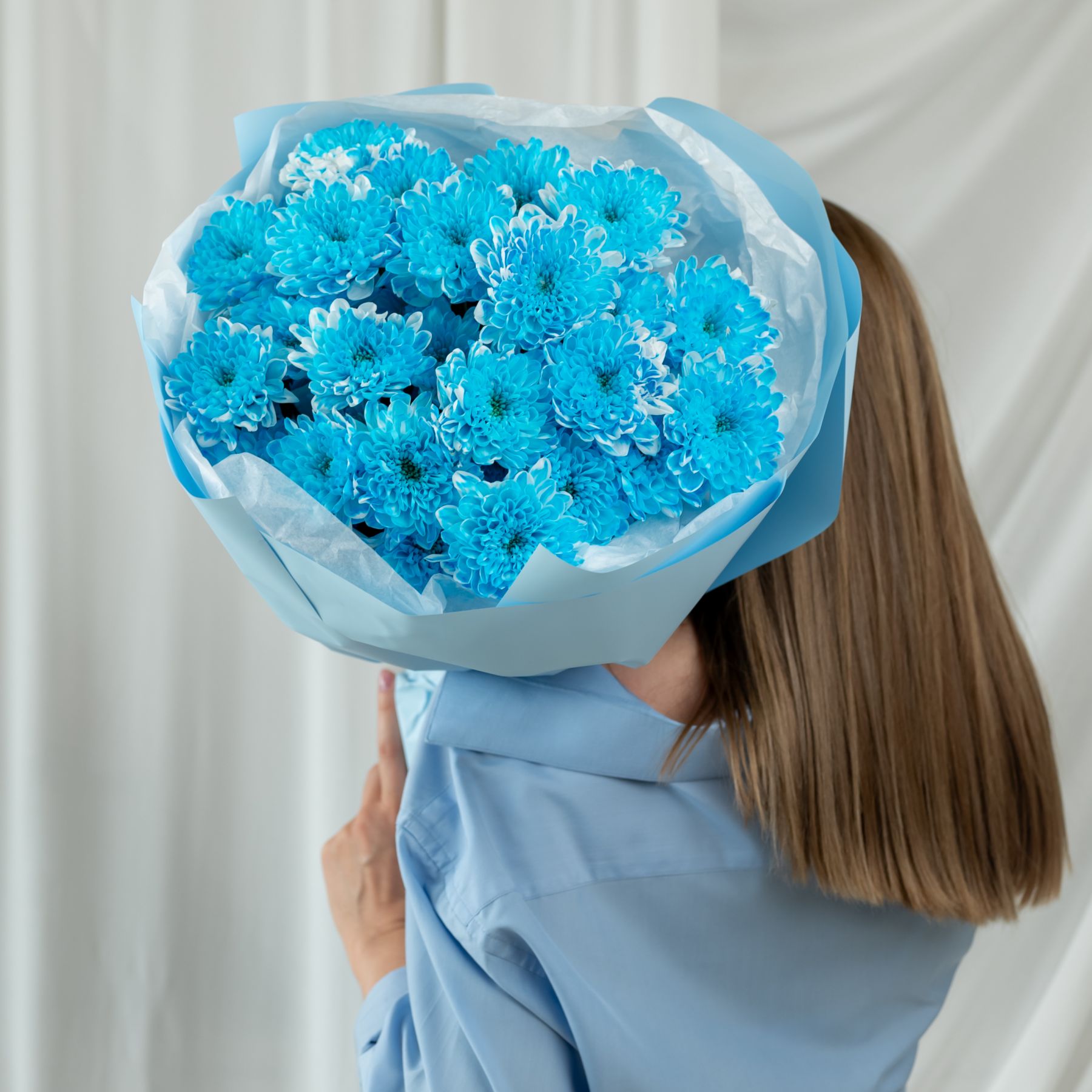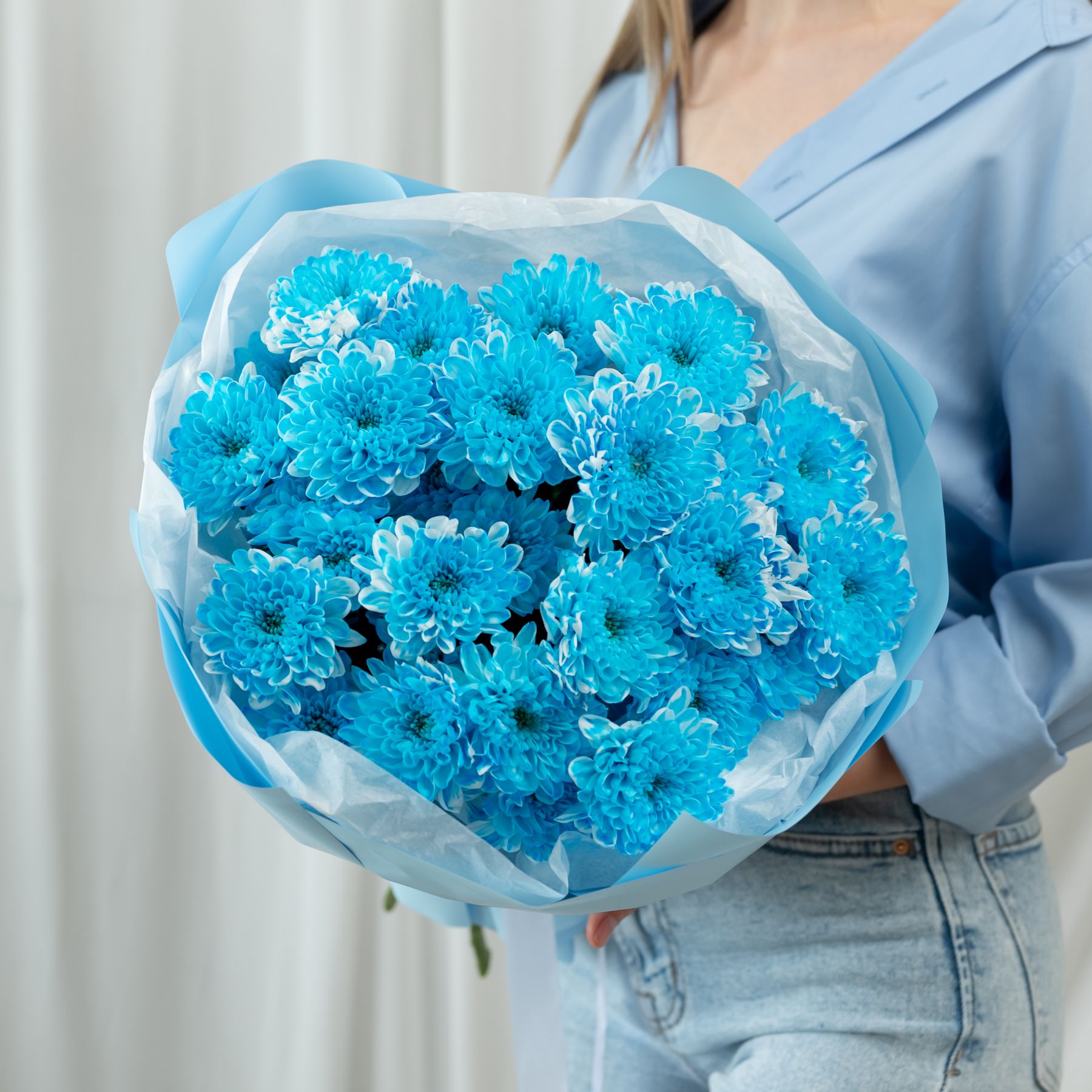 В составе 5 синих хризантем (сорт Алтай) в красивом оформлении.