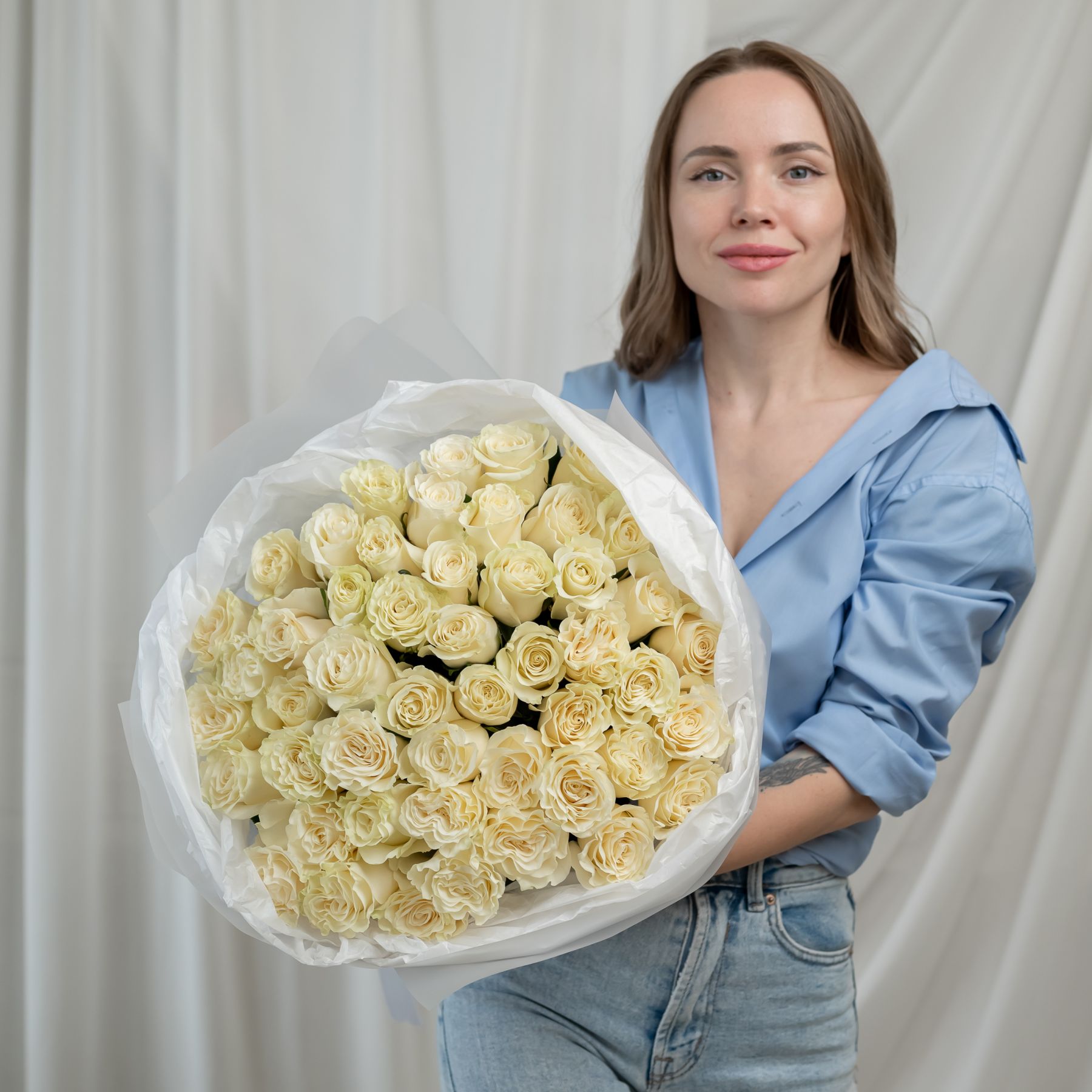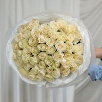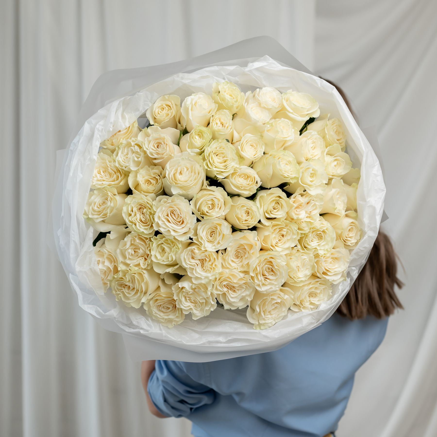 51 белая роза Эквадор (сорт Мондиаль) в объемной стильной упаковке.