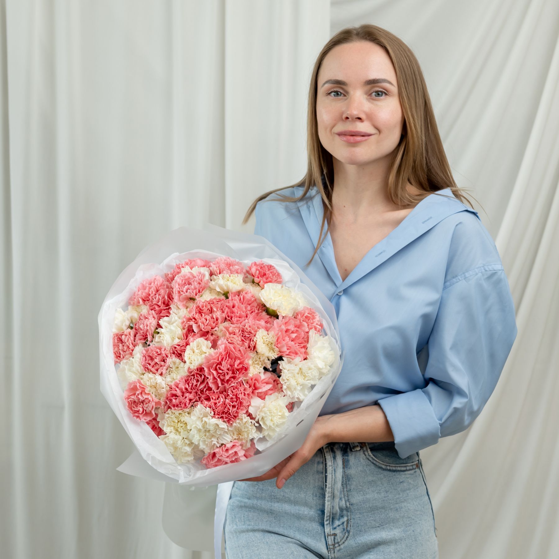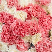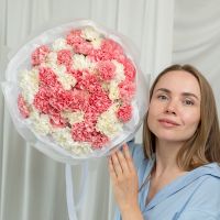 В составе 51 бело-розовых диантусов в дизайнерской упаковке.
