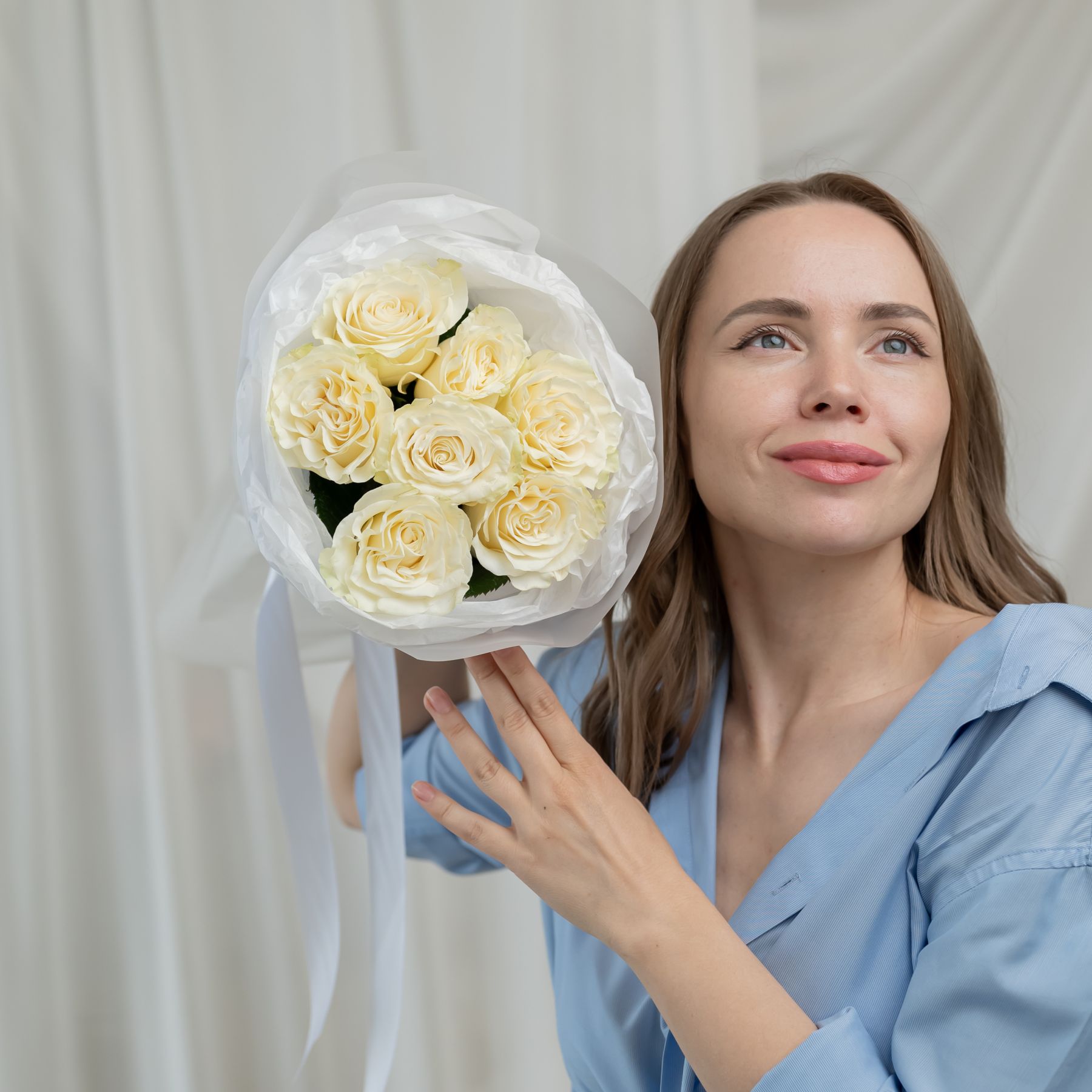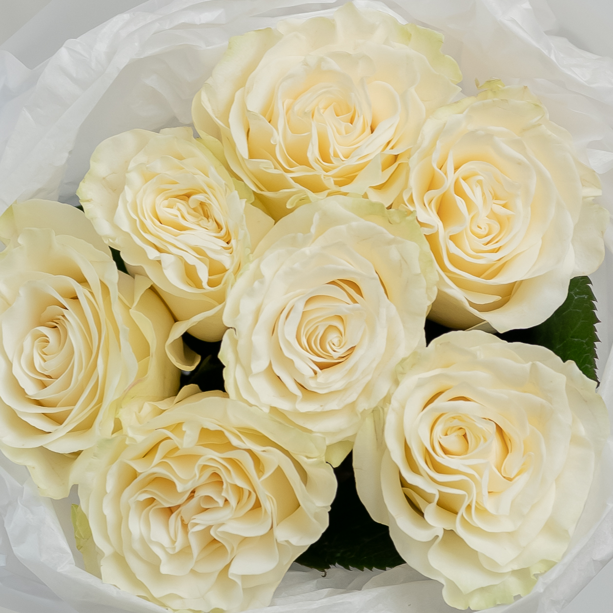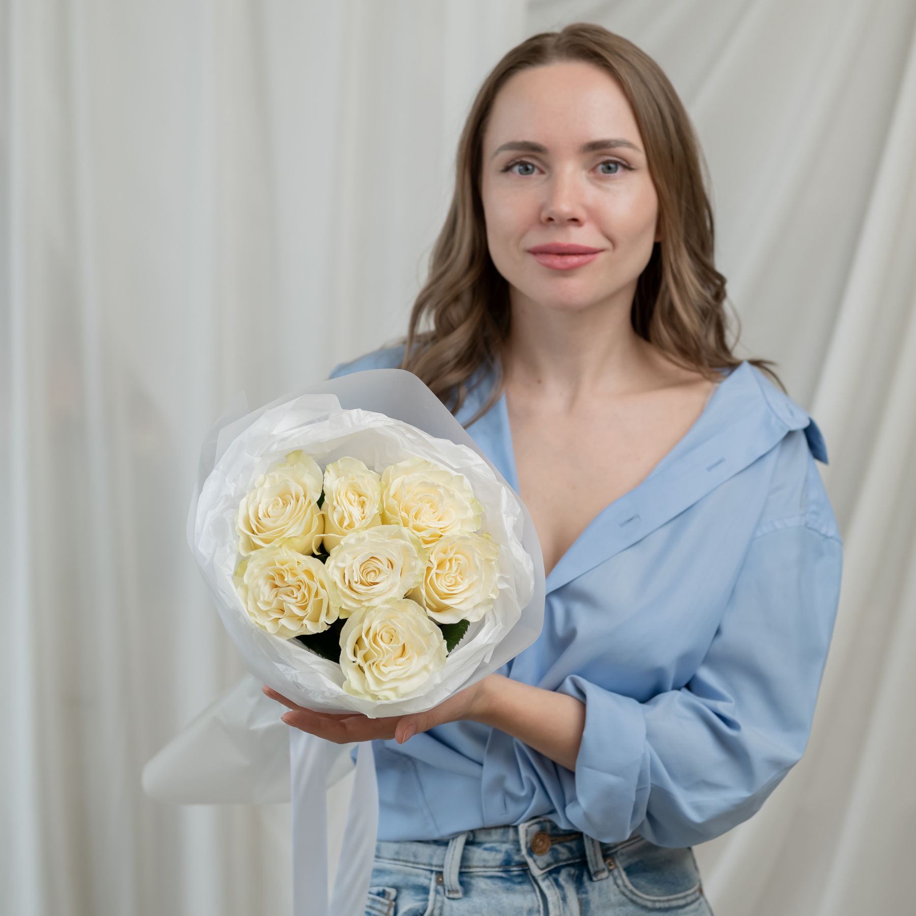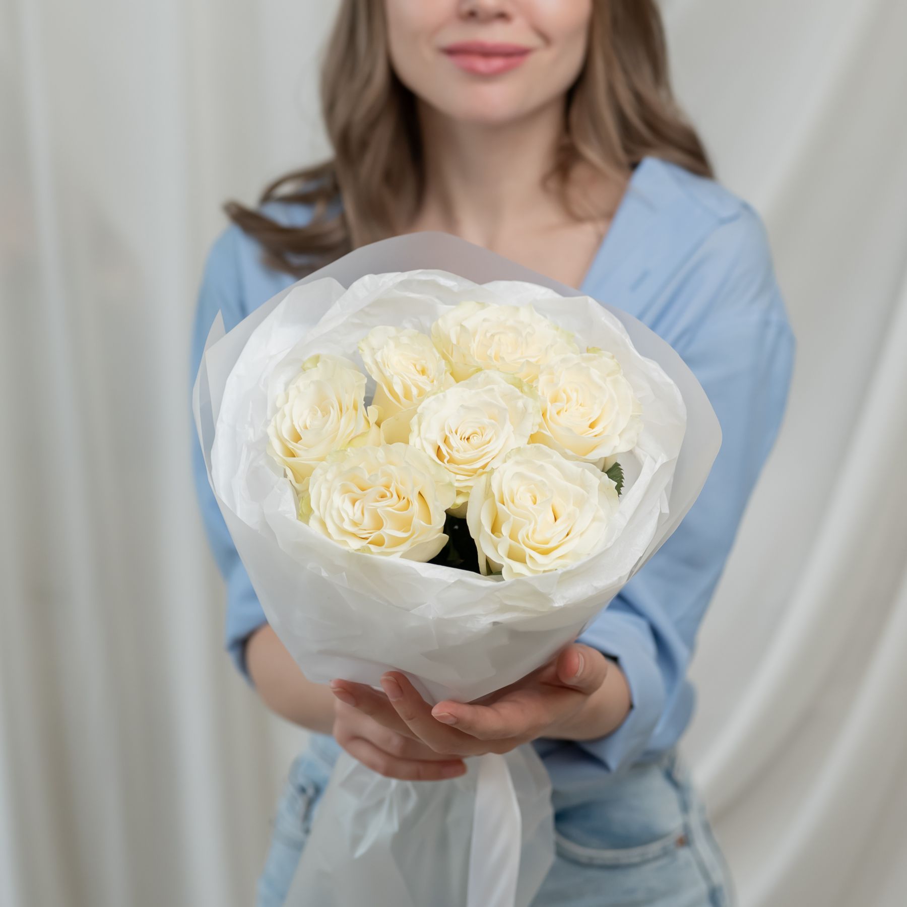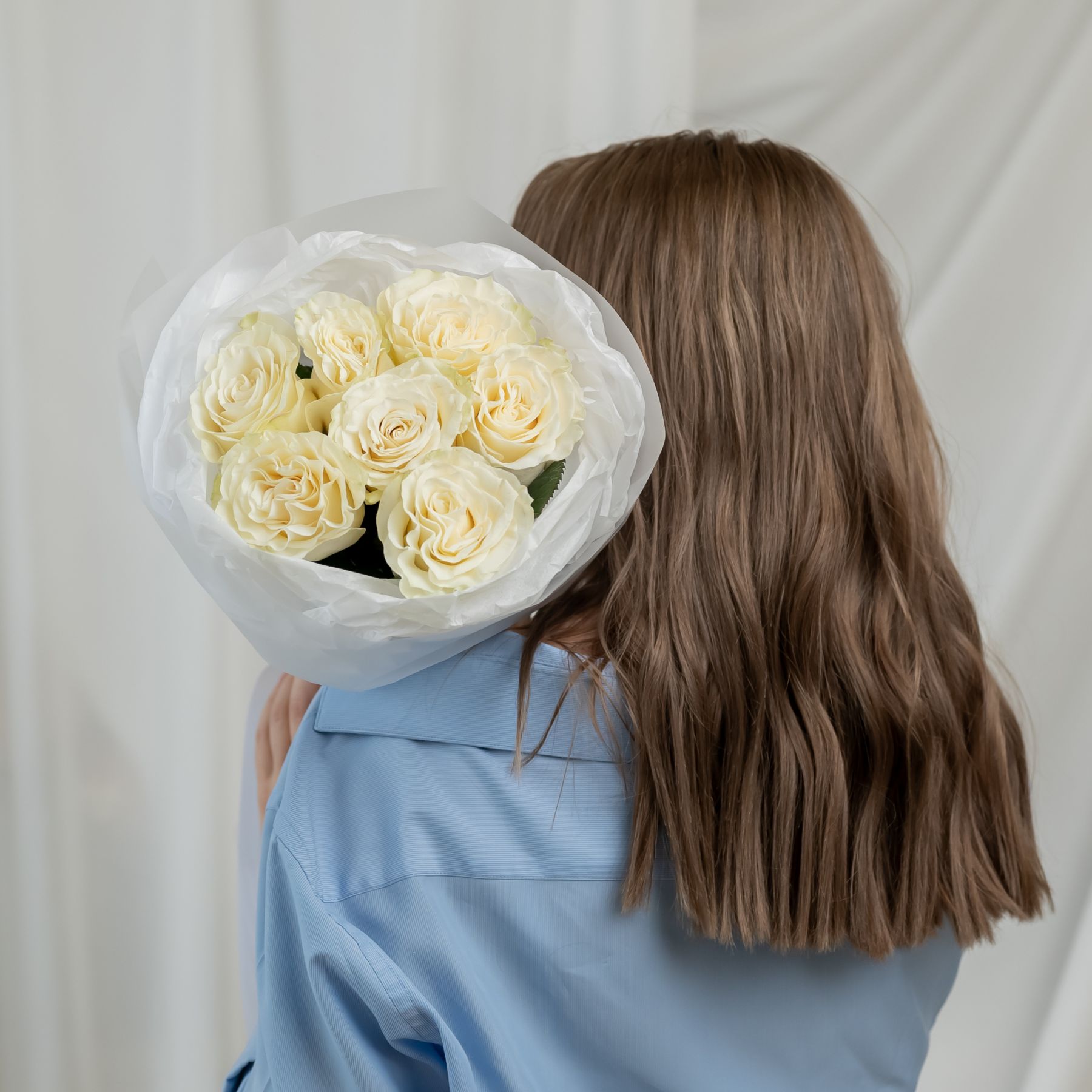 7 белых роз Эквадор (сорт Мондиаль) в объемной стильной упаковке.