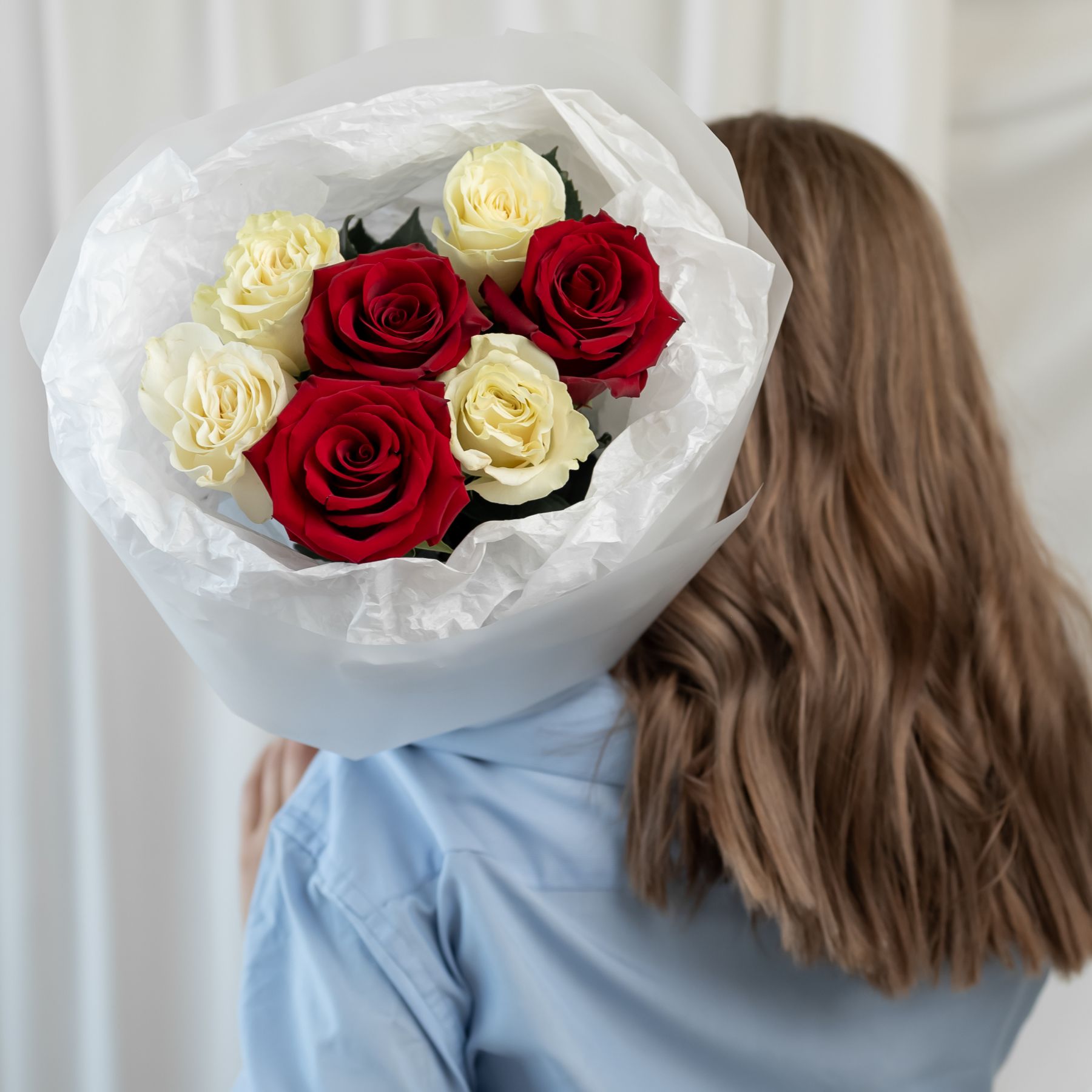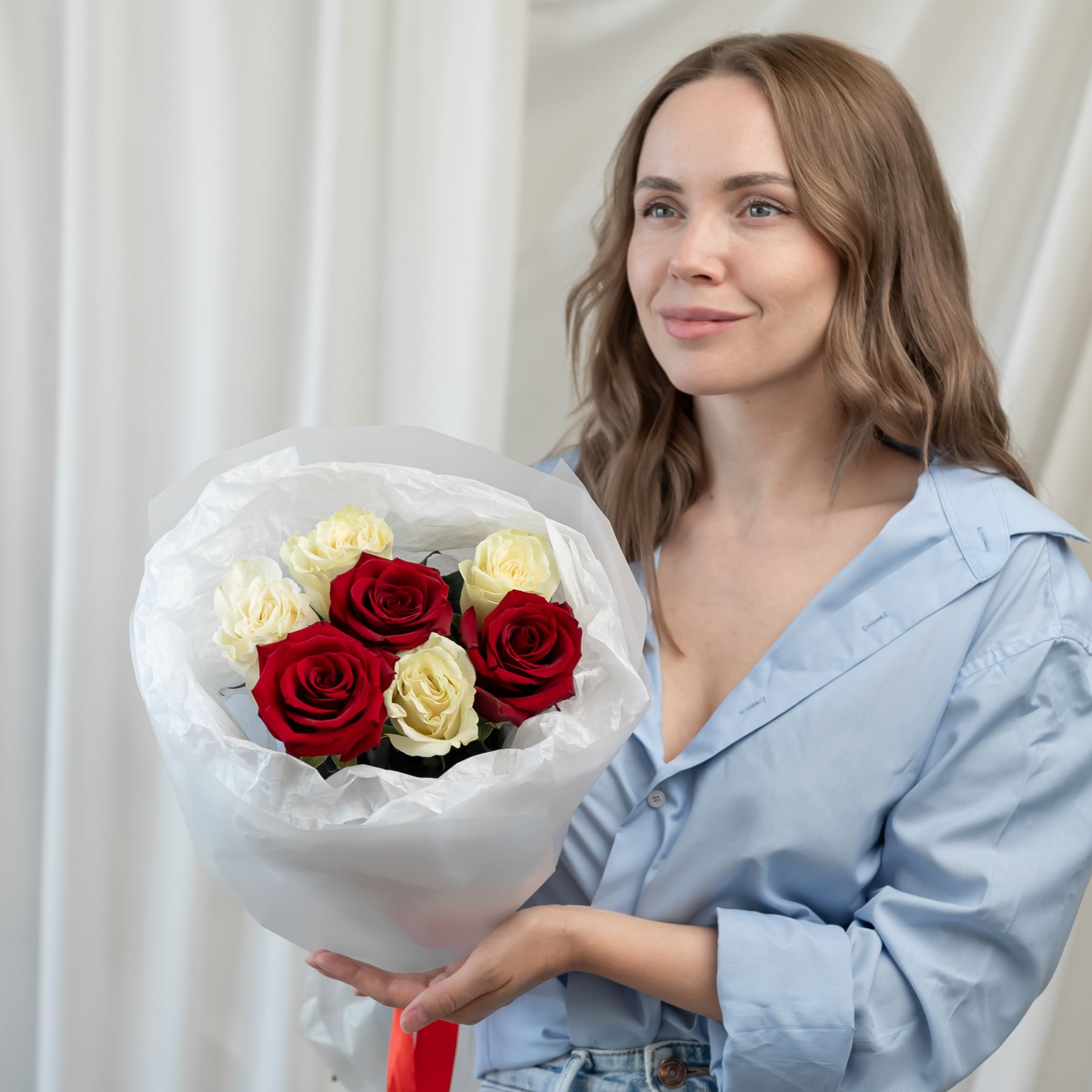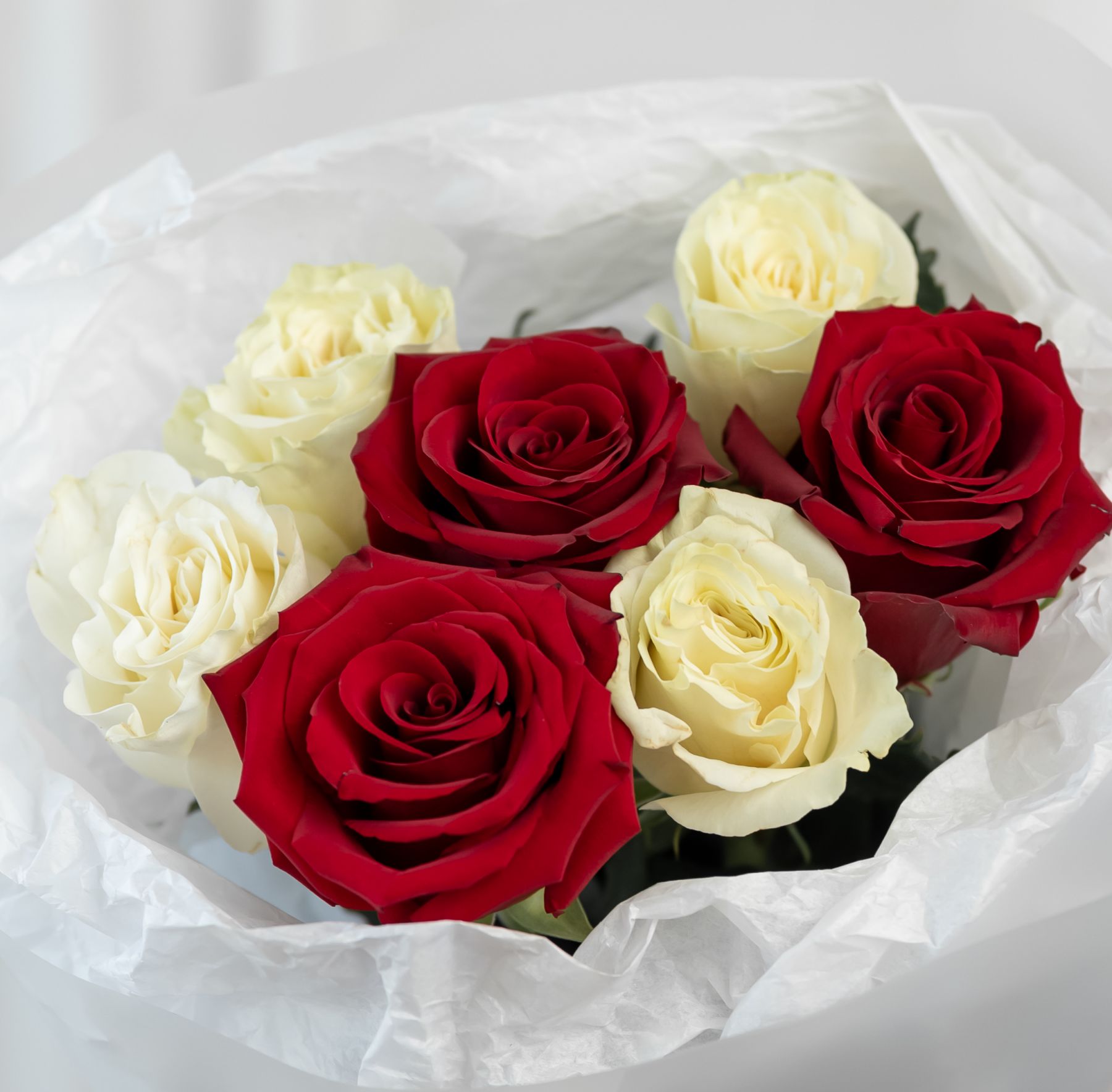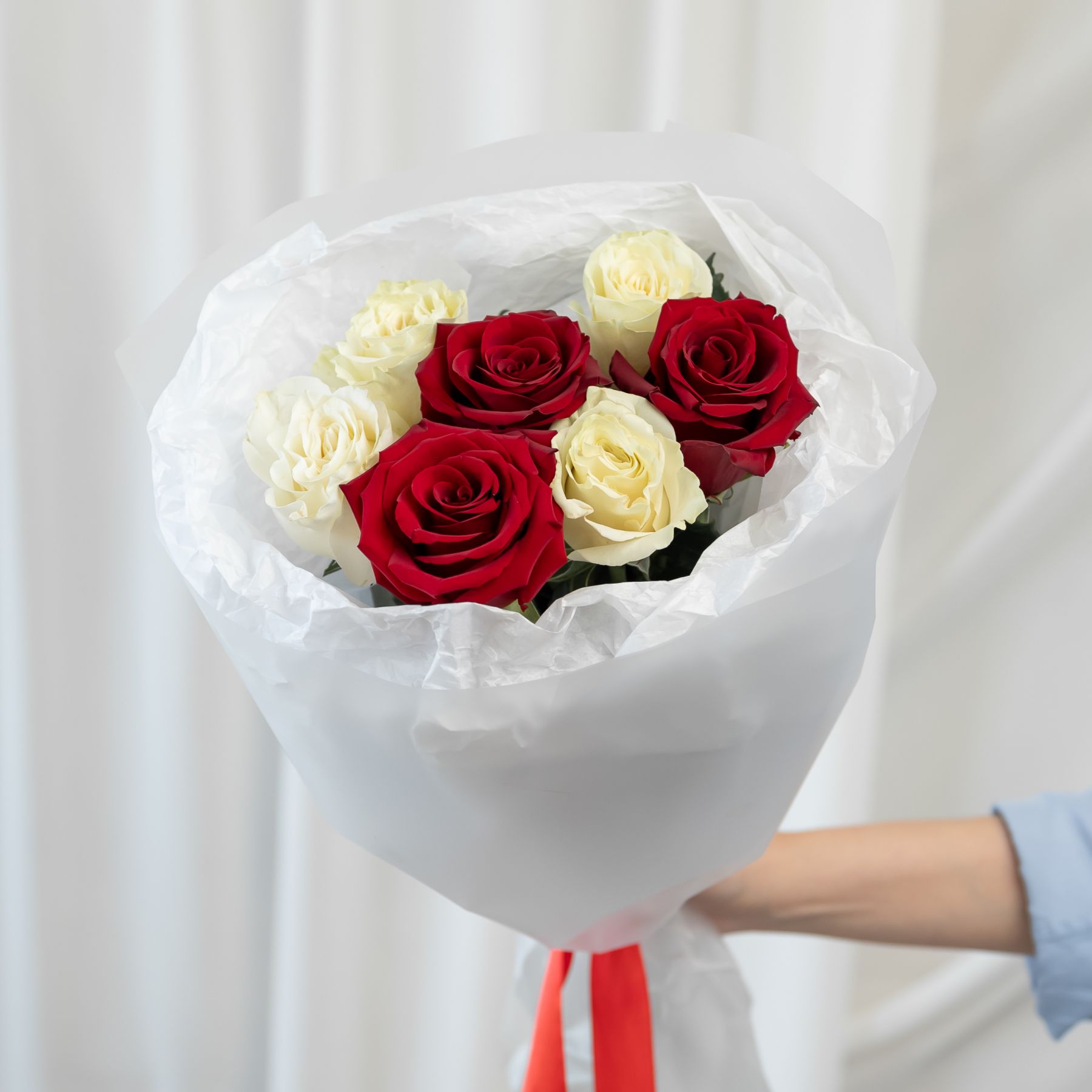 7 красно-белых роз (60 см) в дизайнерской упаковке.