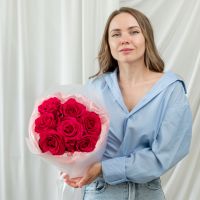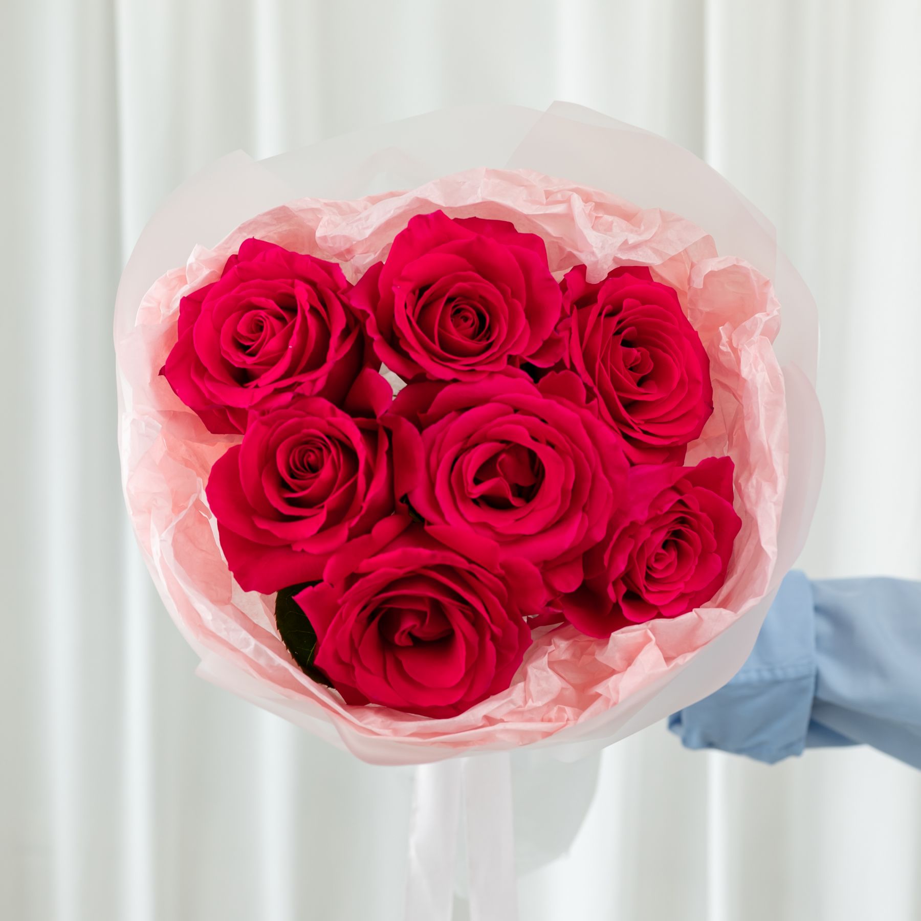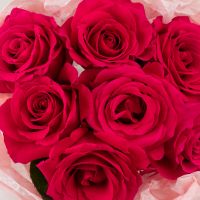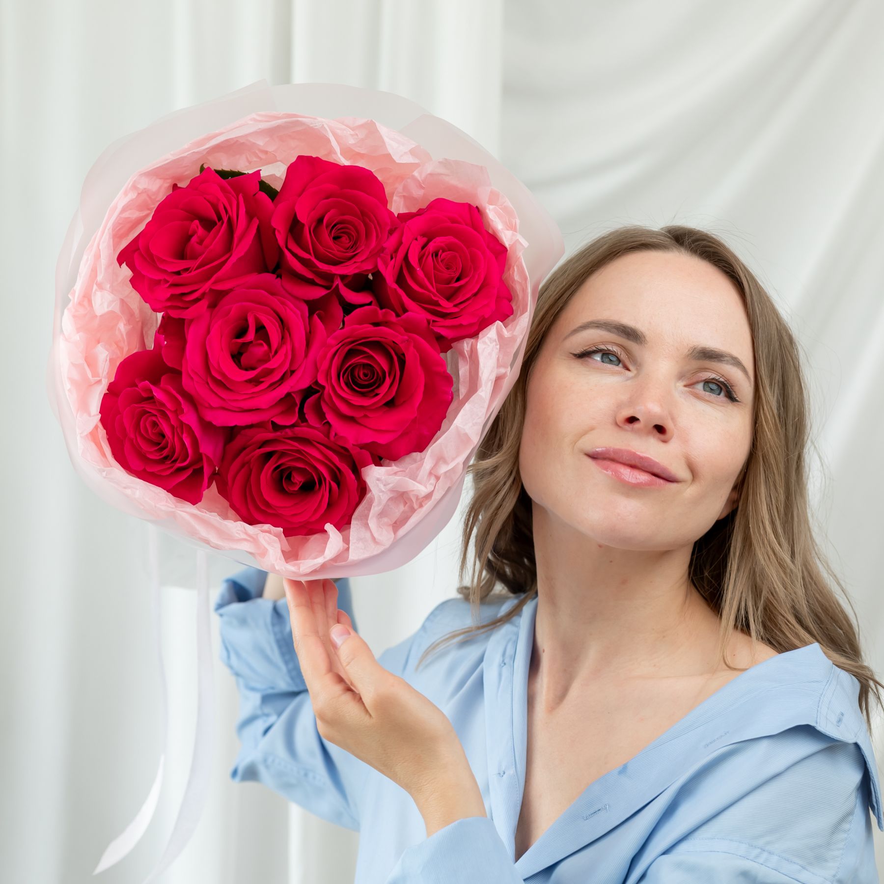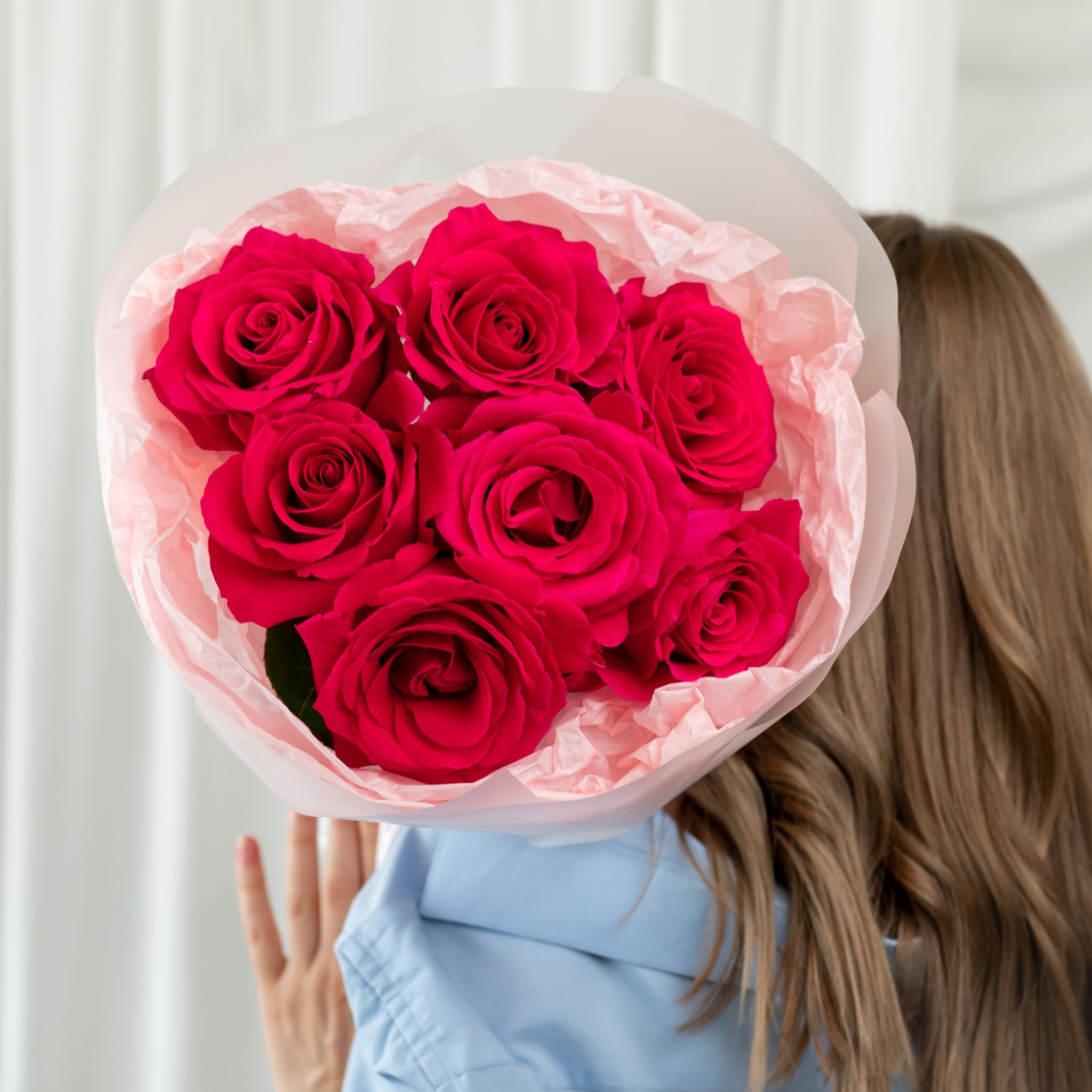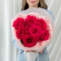 7 малиновых роз (60 см) в дизайнерской упаковке.