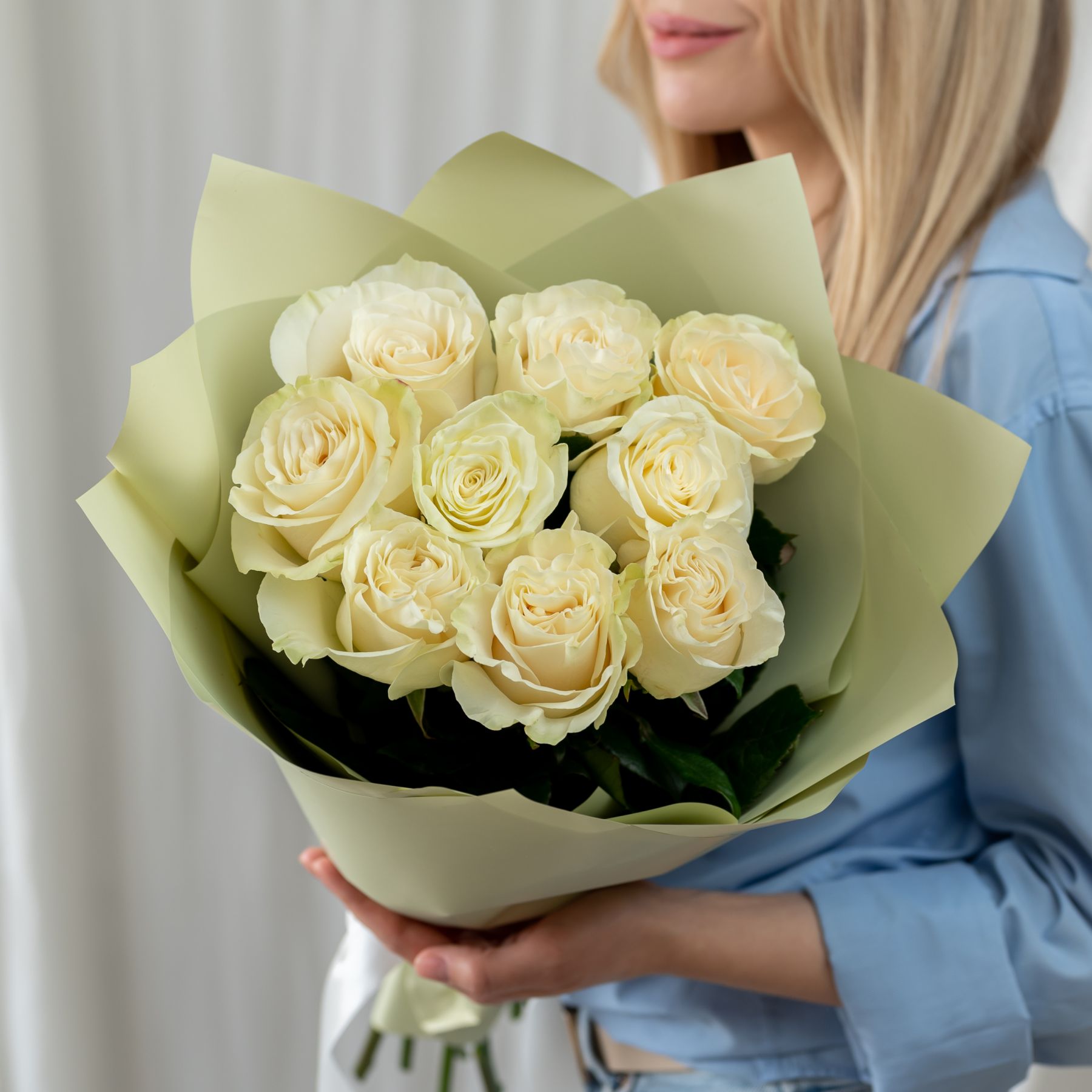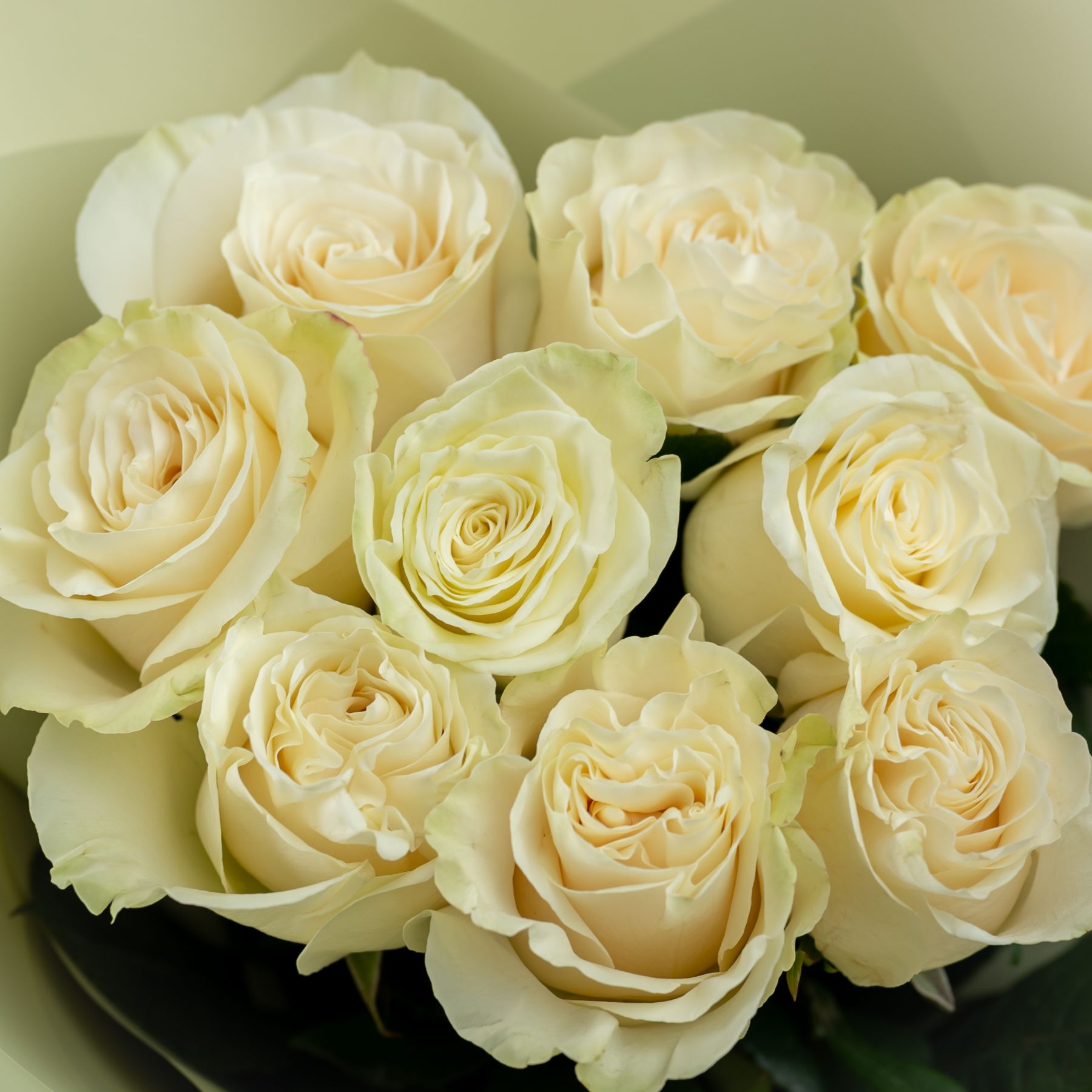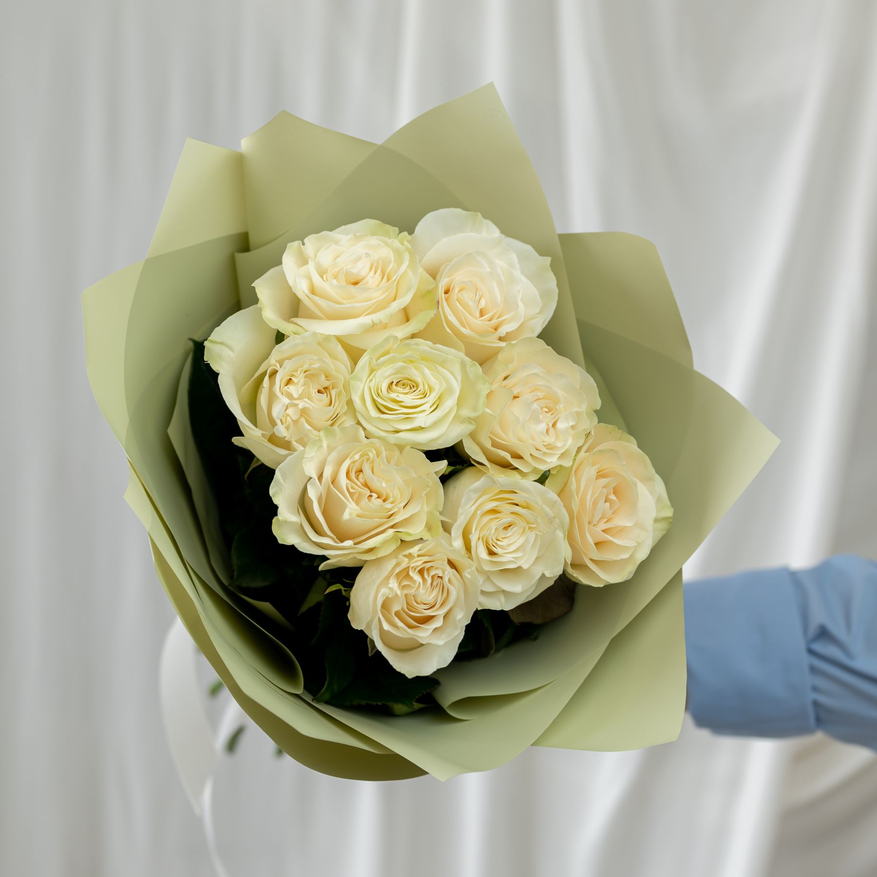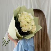 9 белых роз Эквадор (сорт Мондиаль) в объемной стильной упаковке.