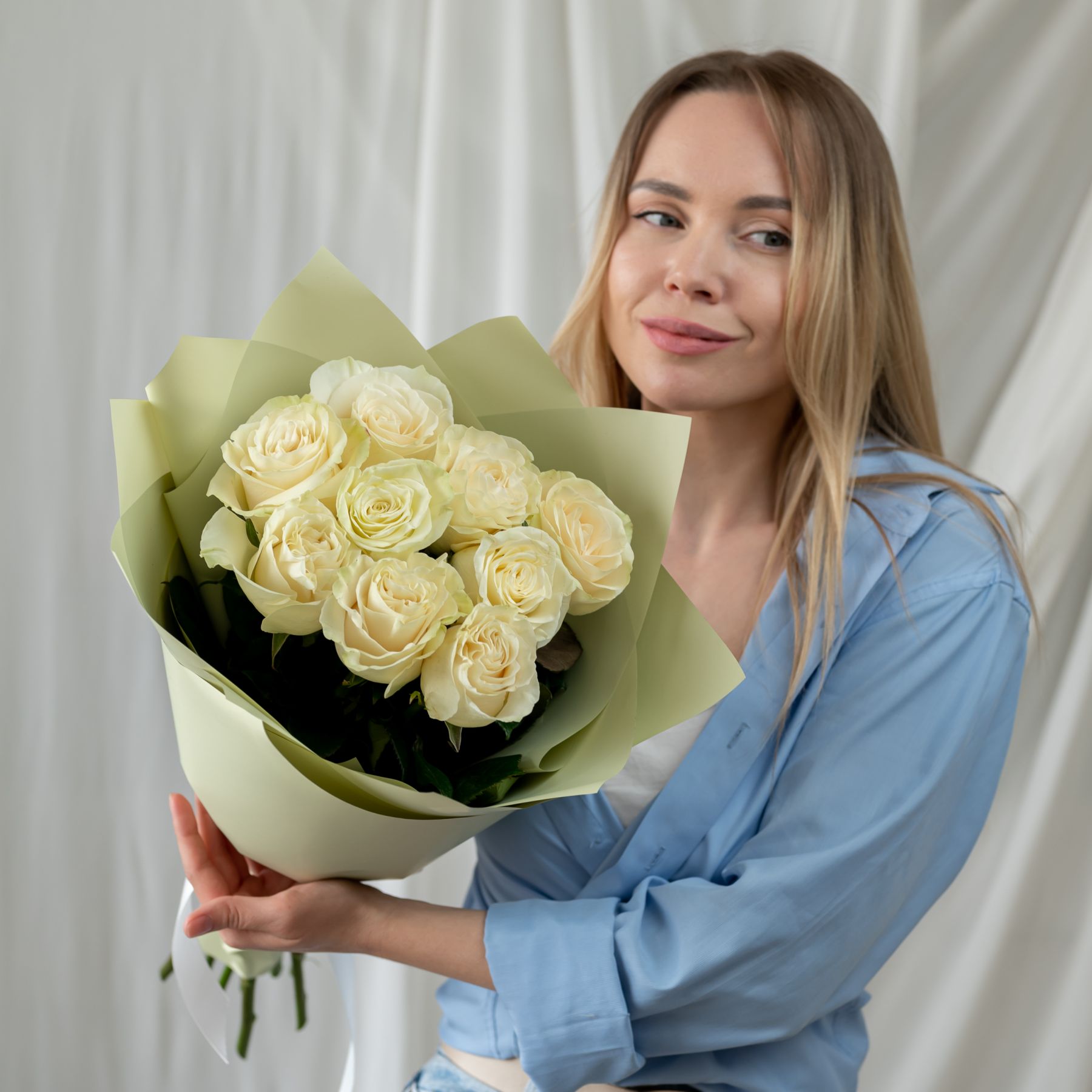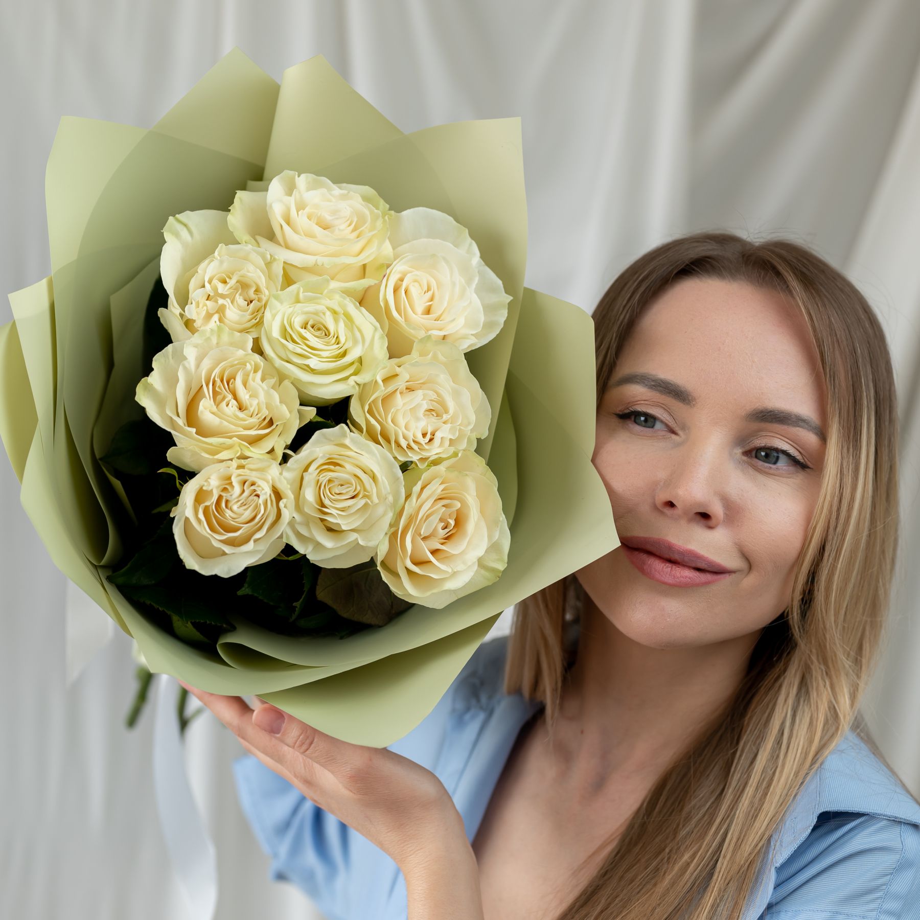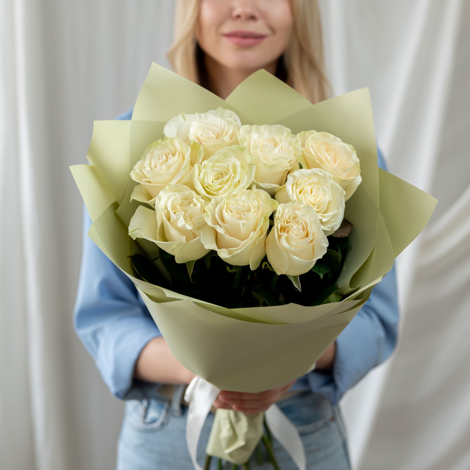 9 белых роз Эквадор (сорт Мондиаль) в объемной стильной упаковке.