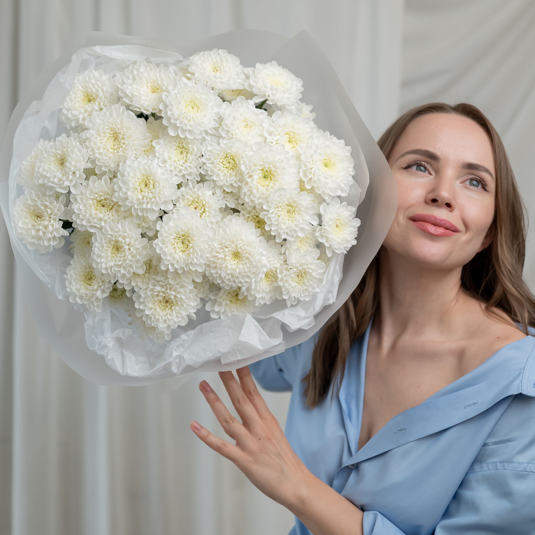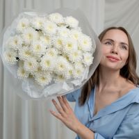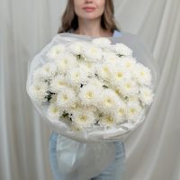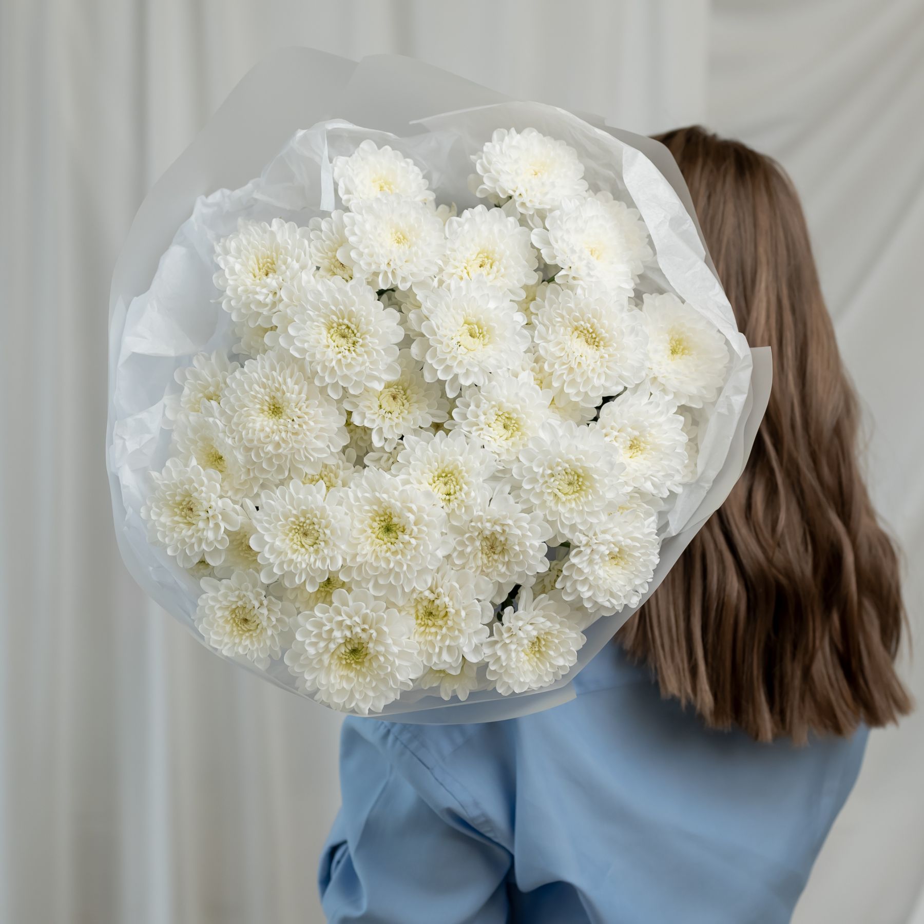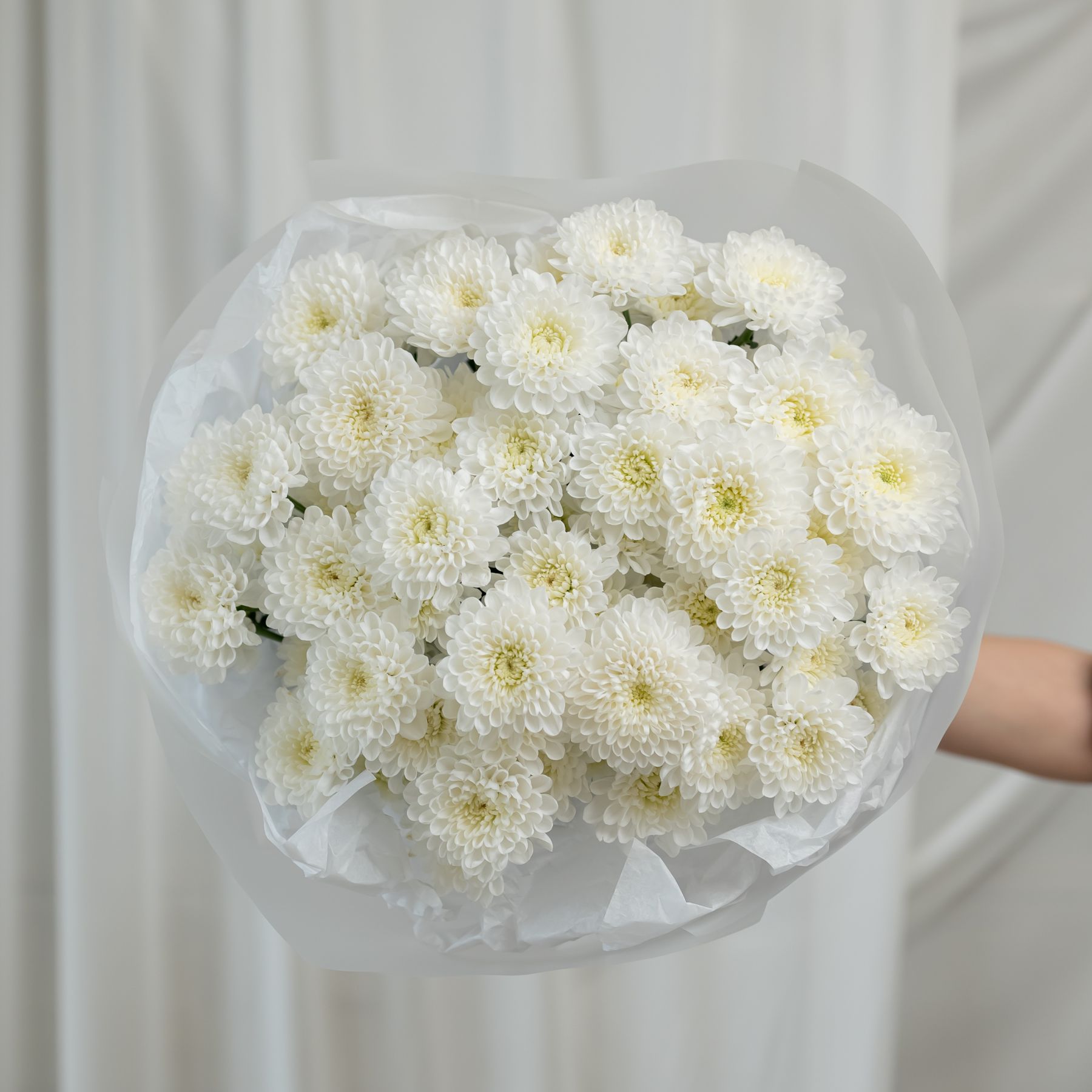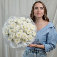 В составе 9 белых хризантем (сорт Алтай) в дизайнерской упаковке.