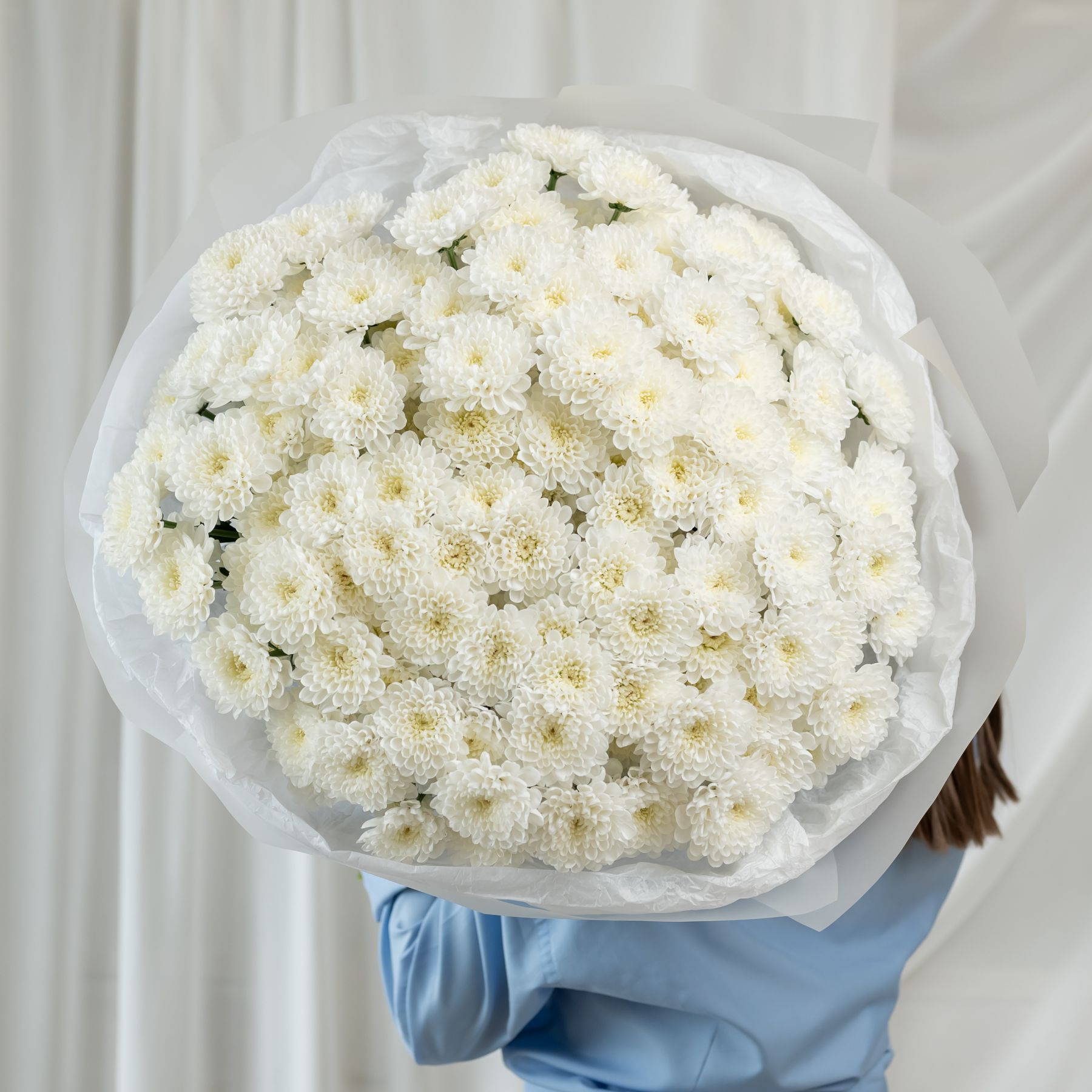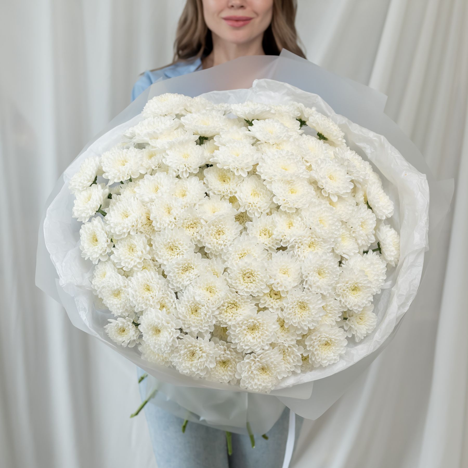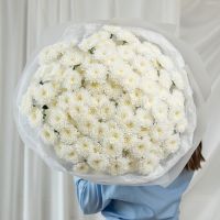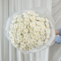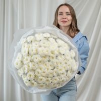 В составе 25 белых хризантем (сорт Алтай) в дизайнерской упаковке.