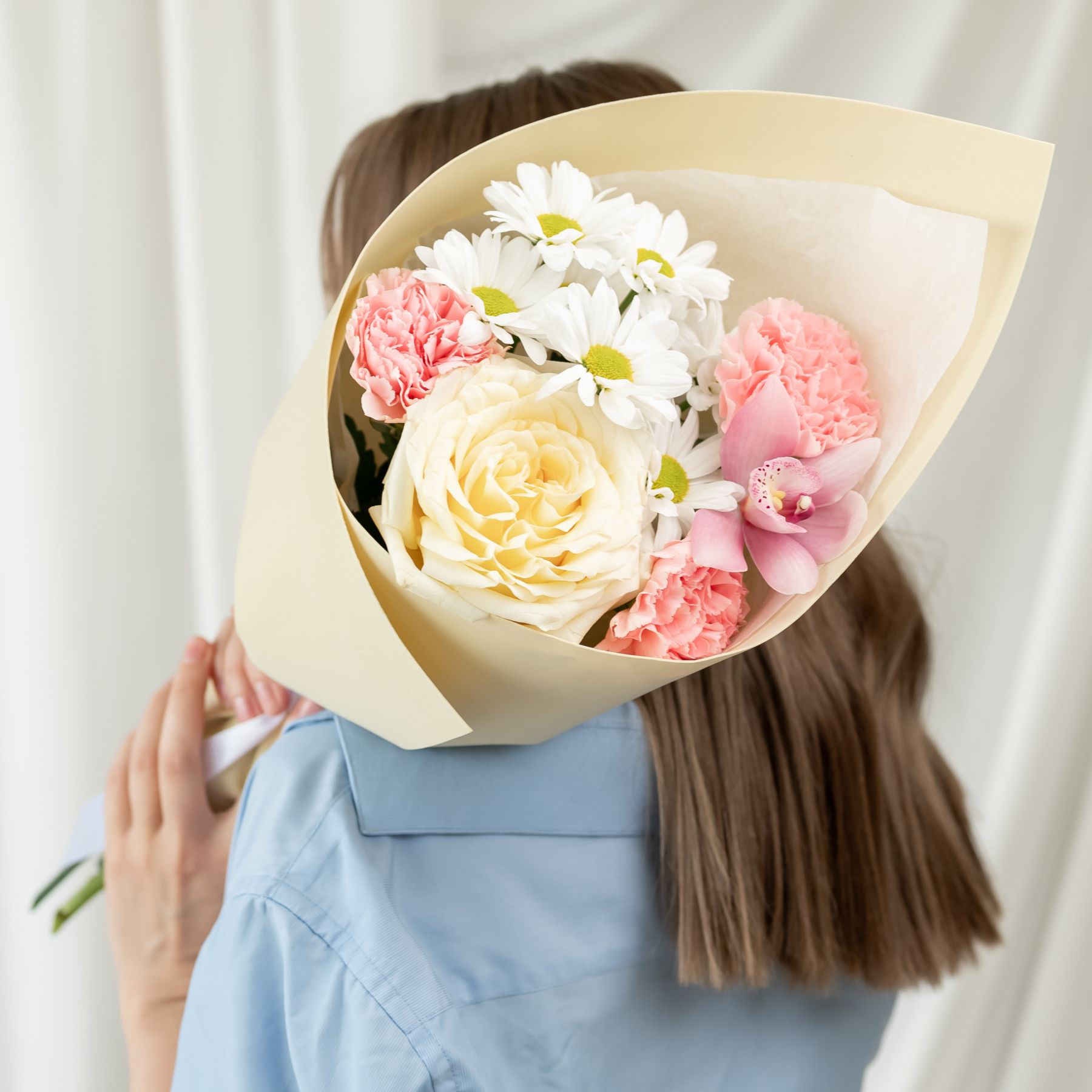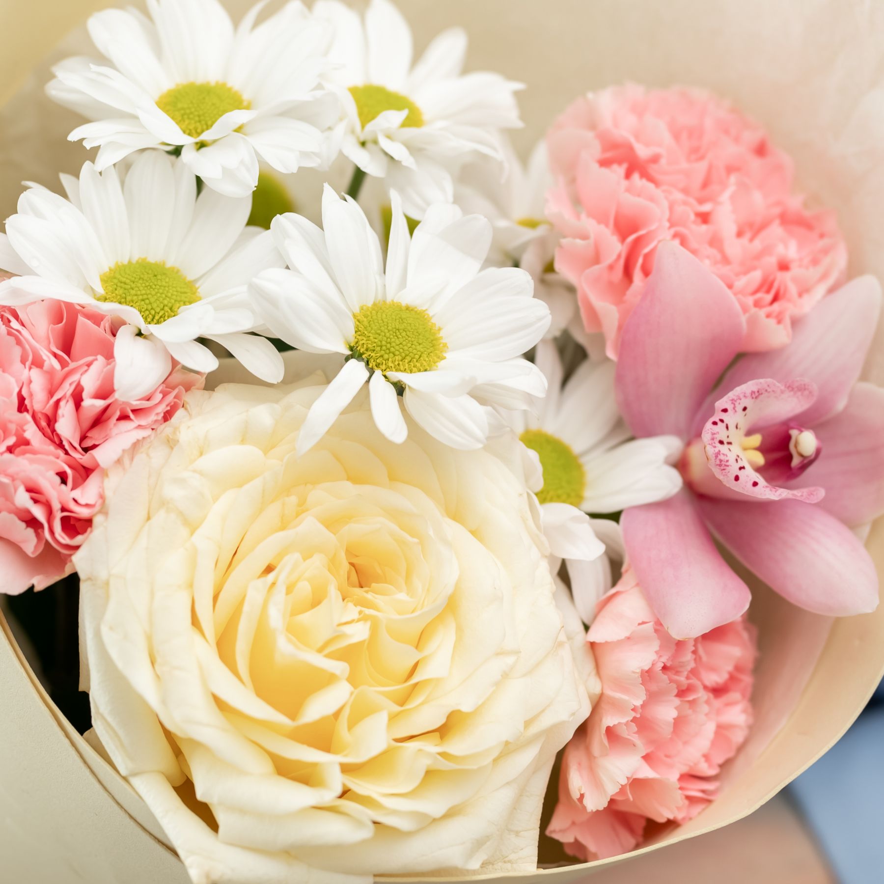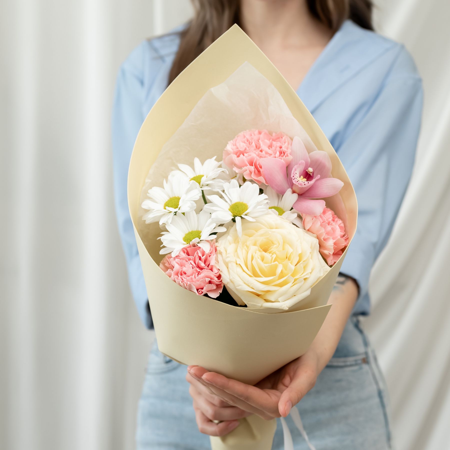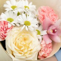 В составе хризантема кустовая (сорт Бакарди) 1 шт, диантус 3 шт, роза (сорт Кендел Лайт) 1 шт, орхидея 1 шт, упаковка дизайнерская.