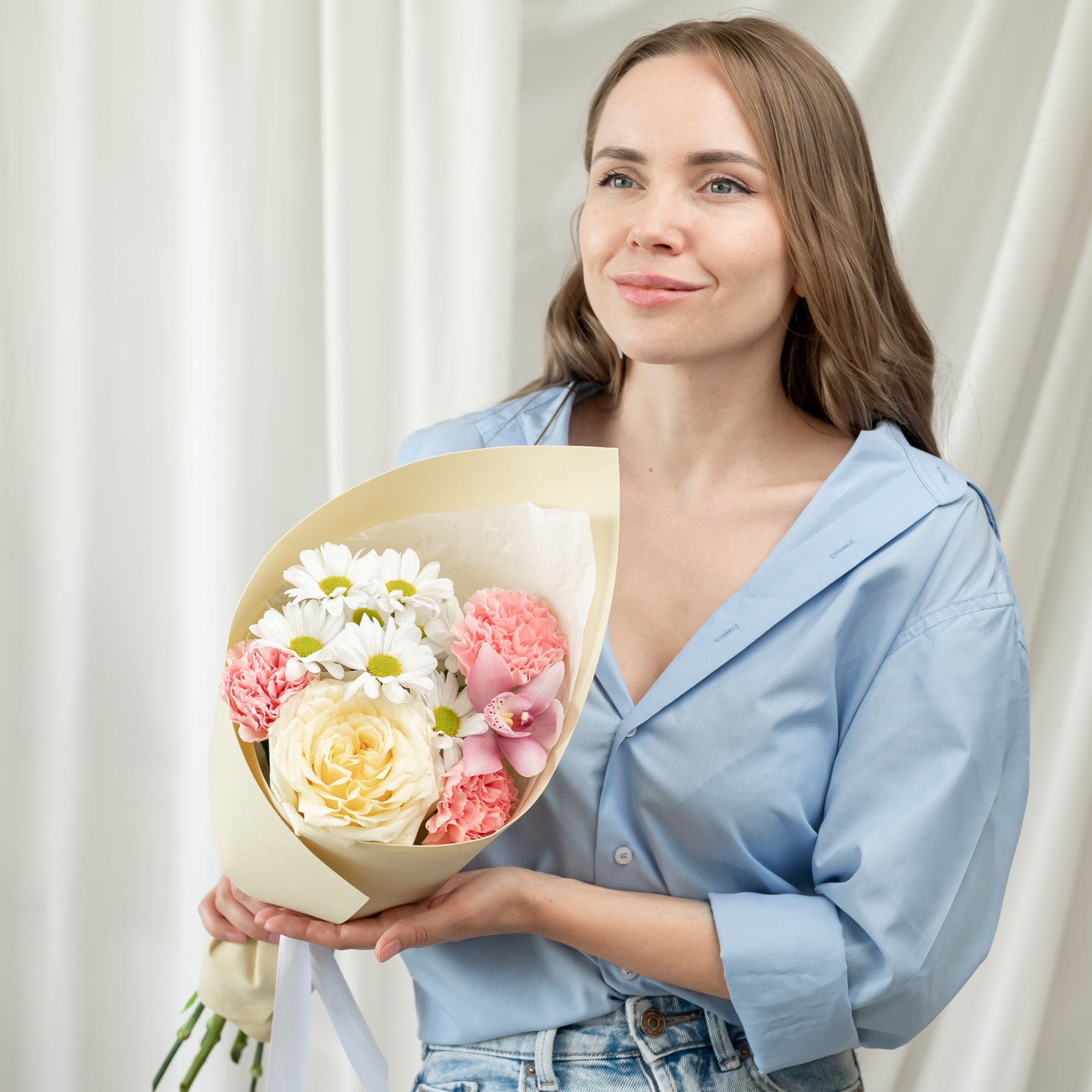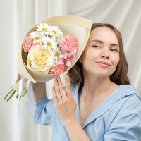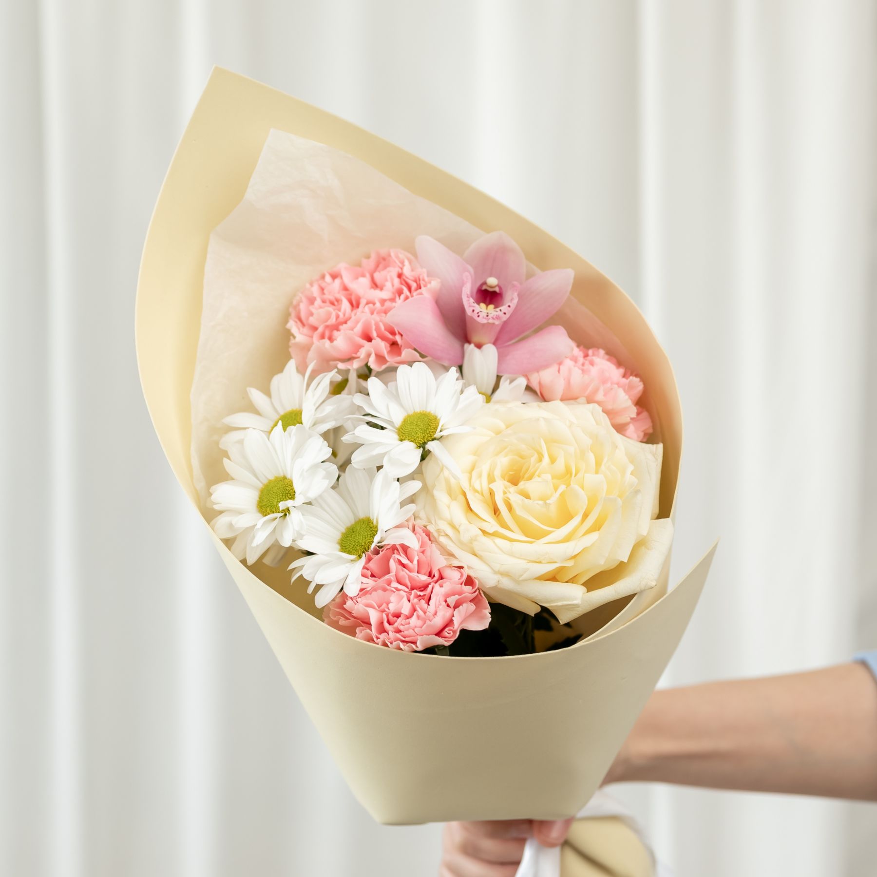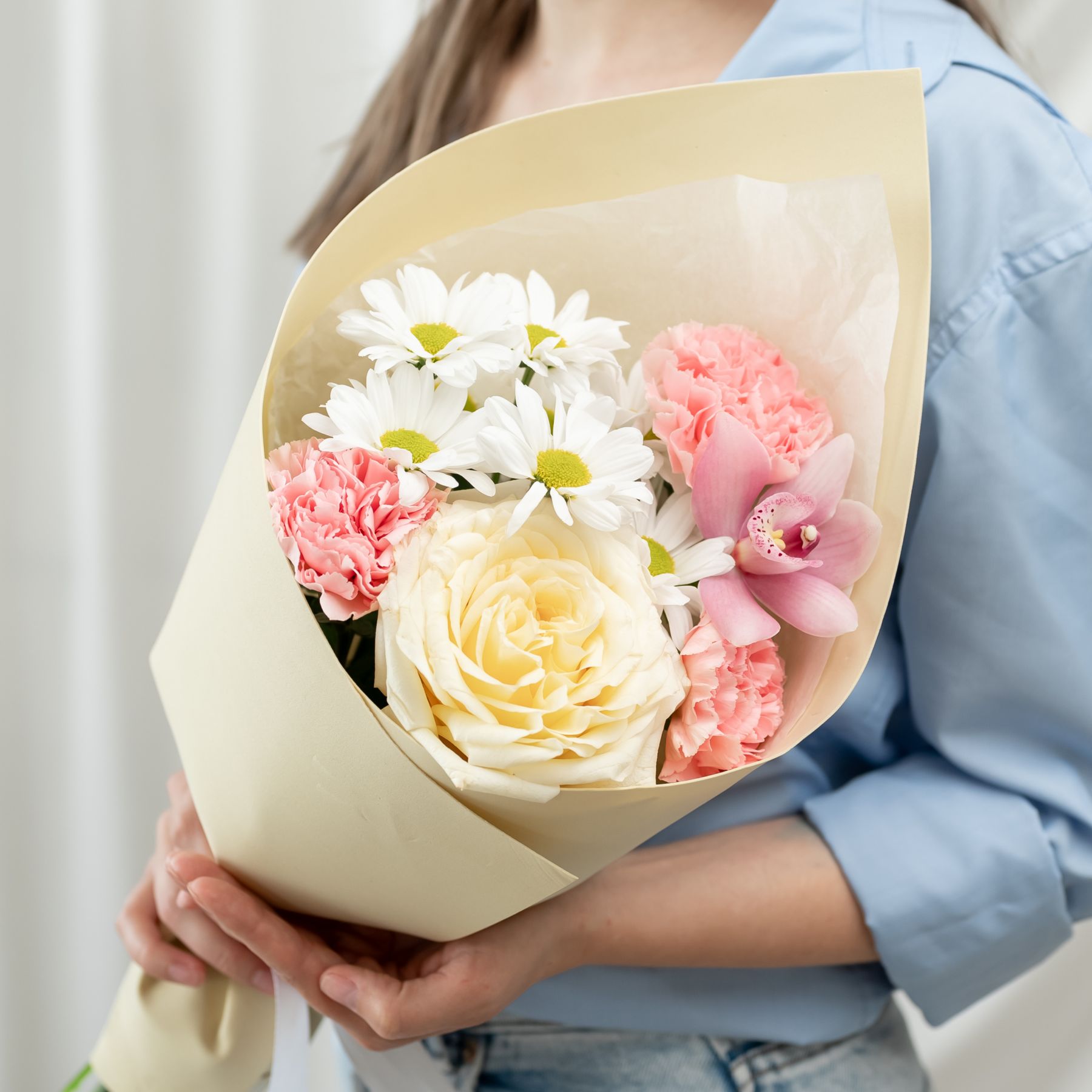 В составе хризантема кустовая (сорт Бакарди) 1 шт, диантус 3 шт, роза (сорт Кендел Лайт) 1 шт, орхидея 1 шт, упаковка дизайнерская.