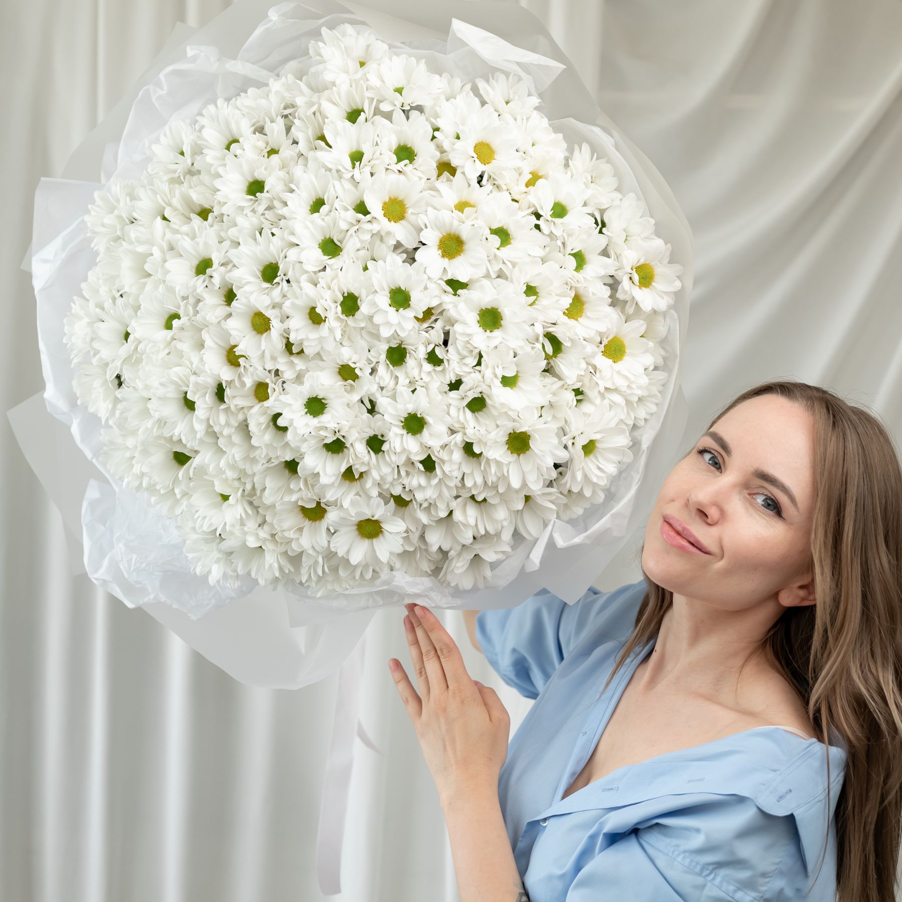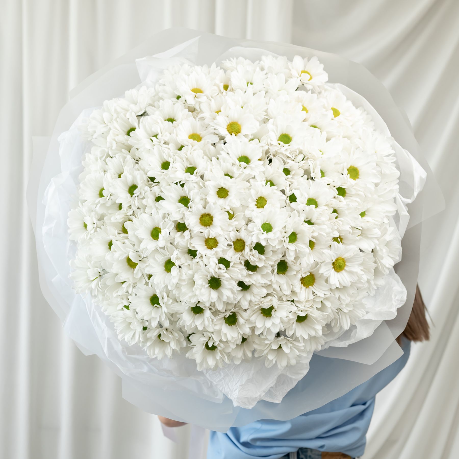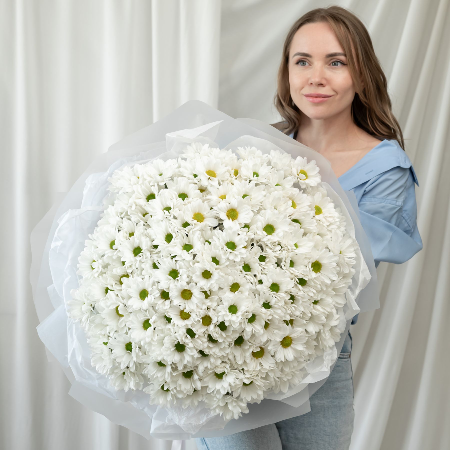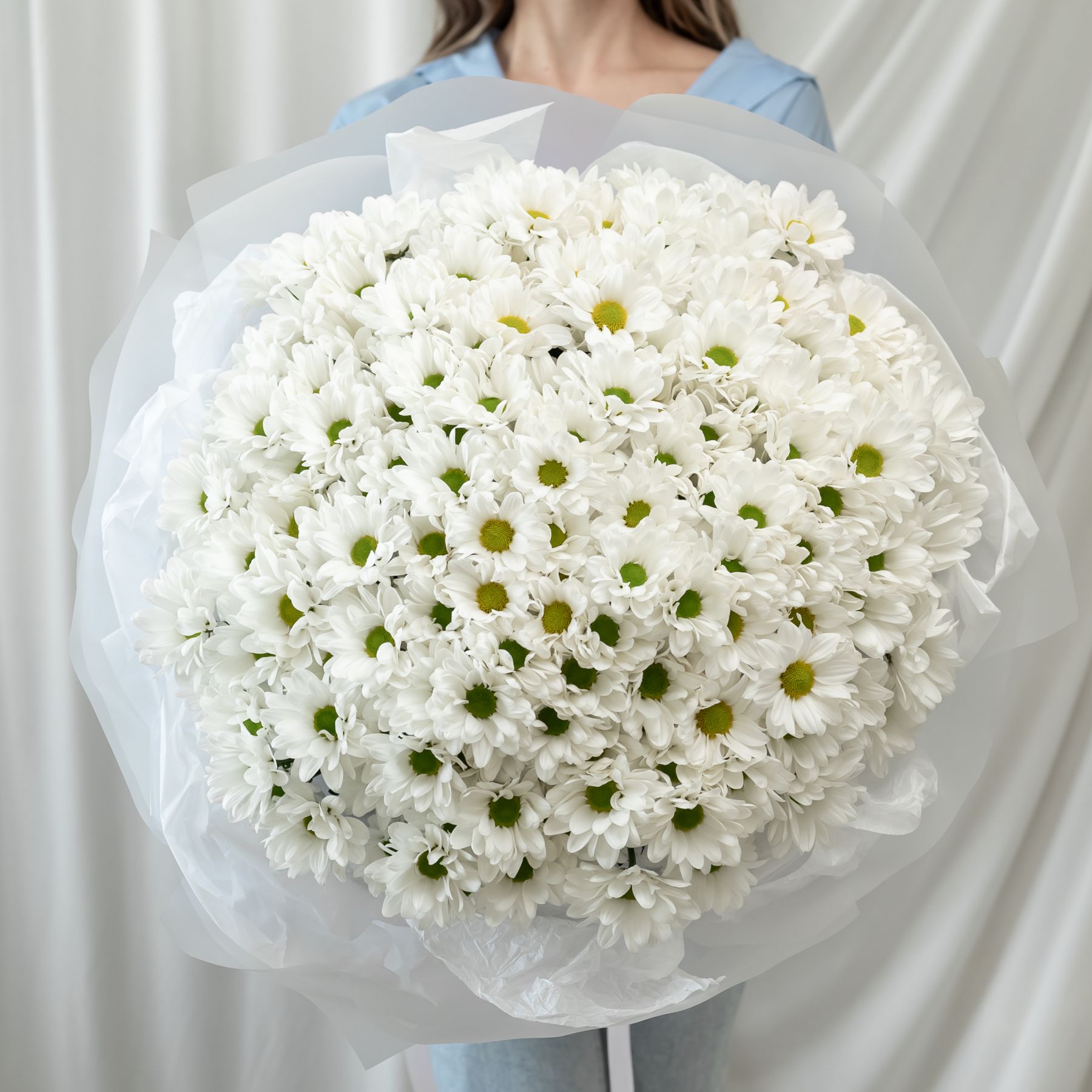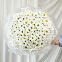 В составе 35 белых хризантем (сорт Бакарди) в дизайнерской упаковке.