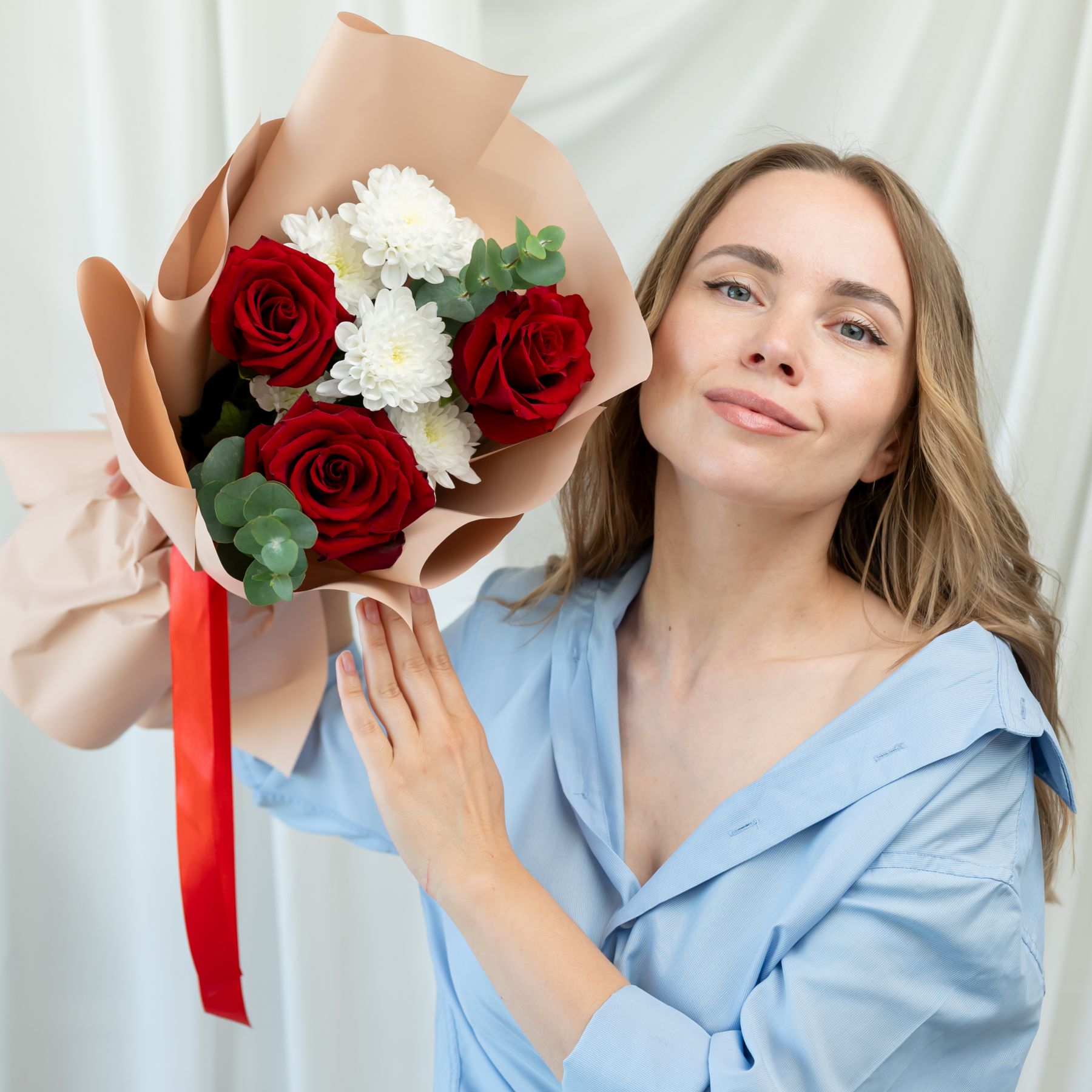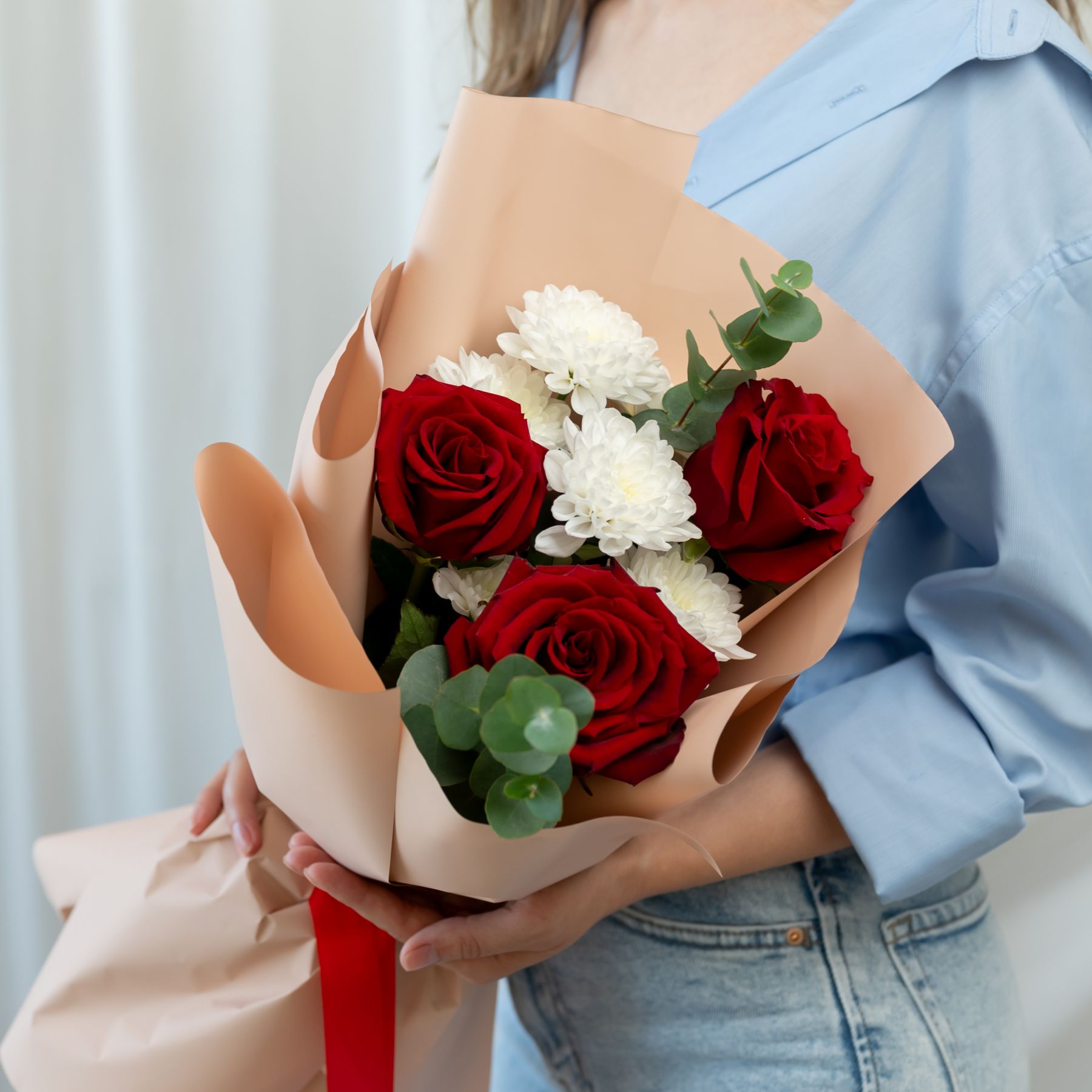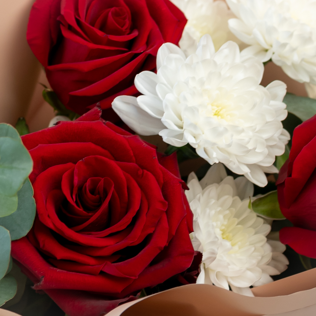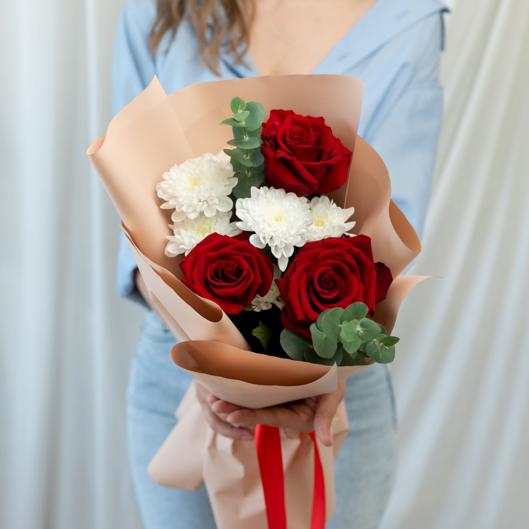 В составе хризантема кустовая (сорт Алтай) 1 шт, роза красная (сорт Эквадор) 3 шт, эвкалипт 1 шт, упаковка дизайнерская.
