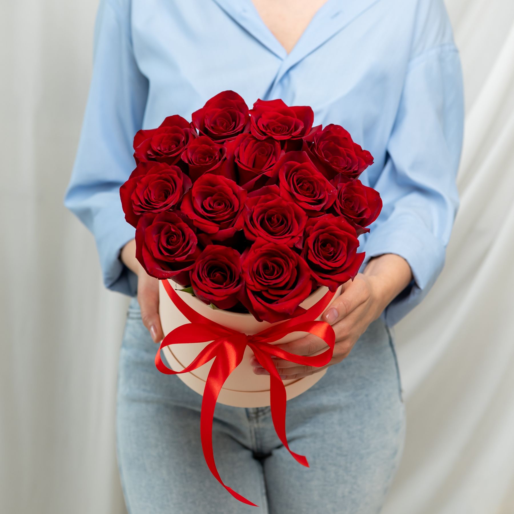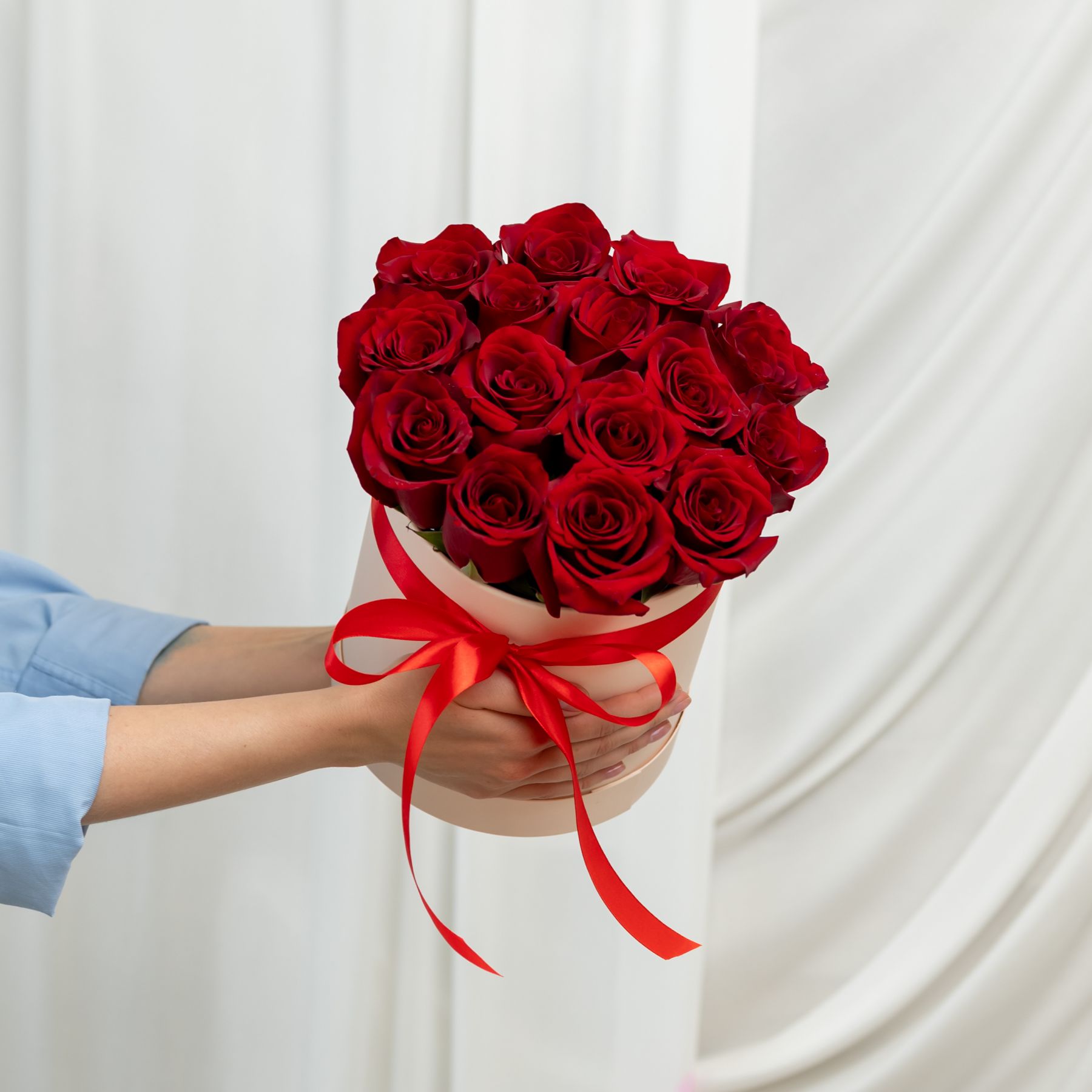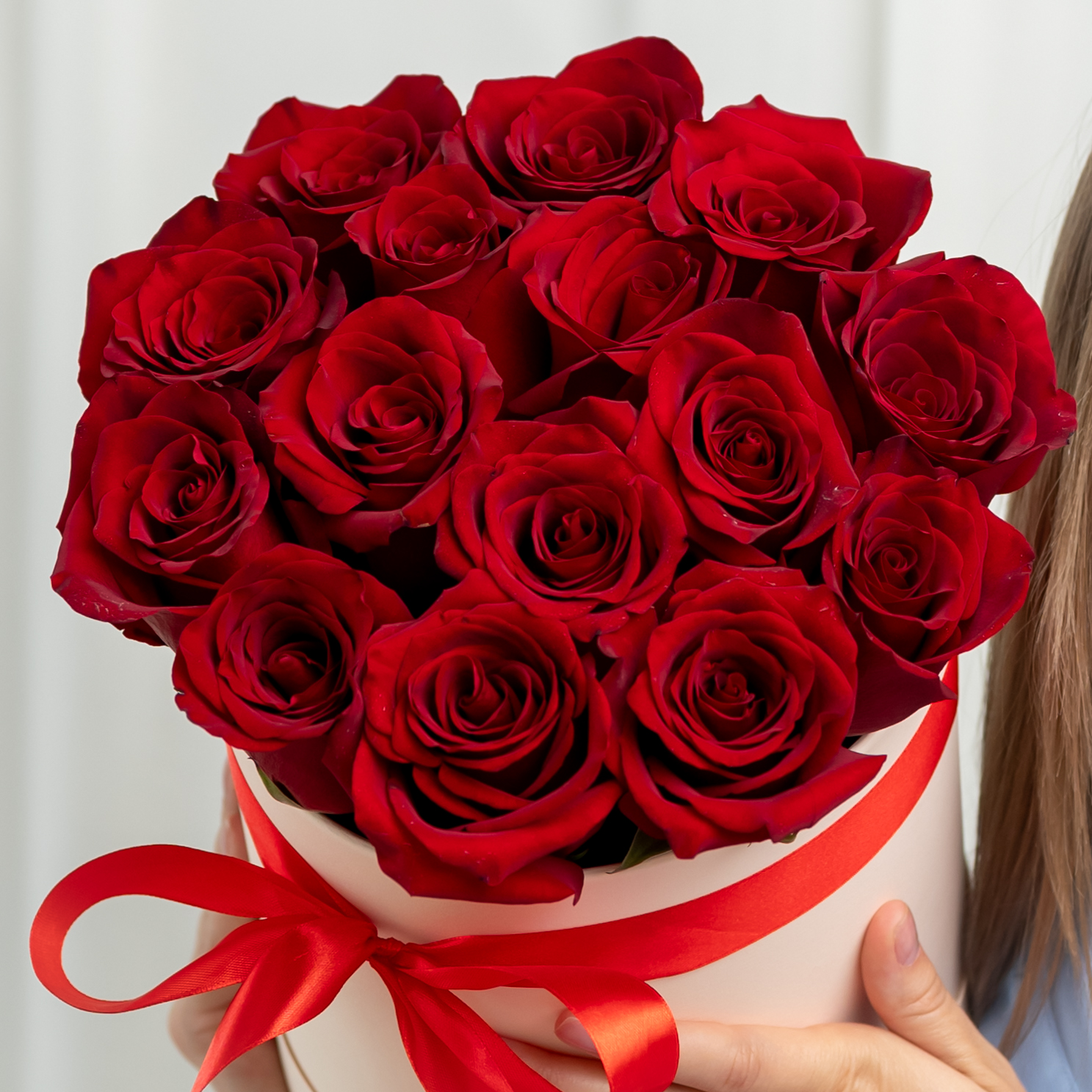 В составе 15 красных роз (сорт Эквадор), шляпная коробка, флористическая губка.