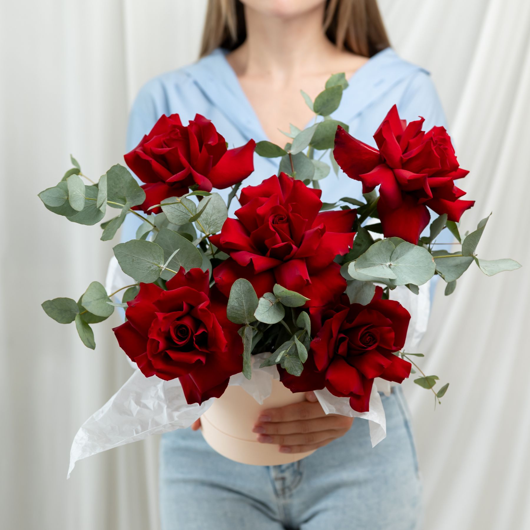 В составе 5 красных вывернутых роз (сорт Эквадор) с эвкалиптом, шляпная коробка, флористическая губка.