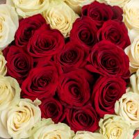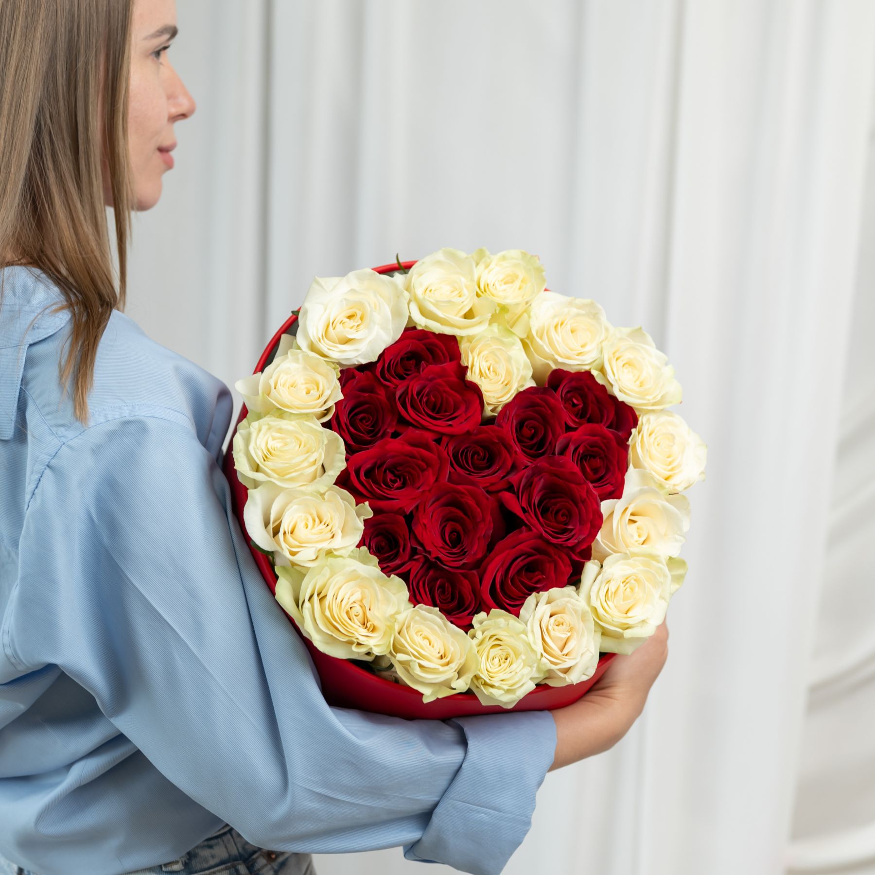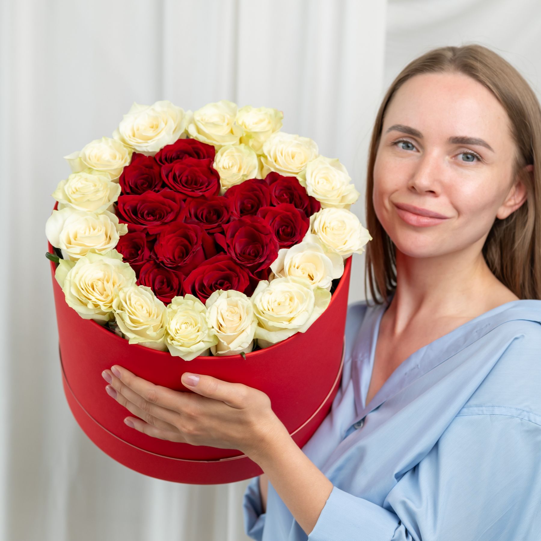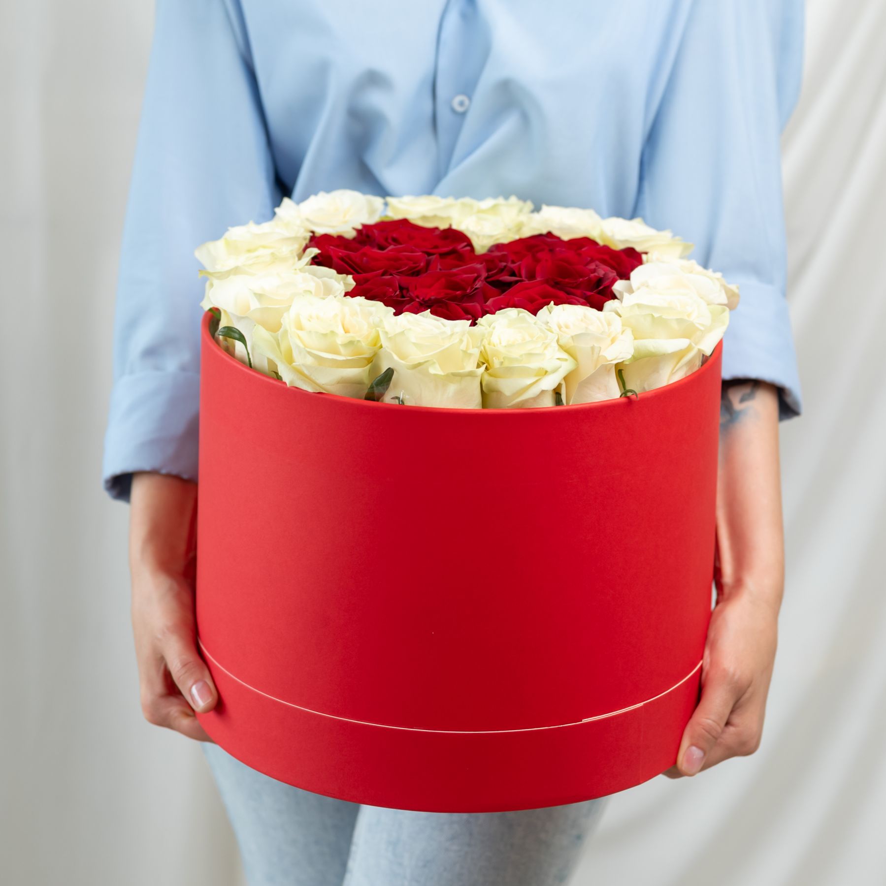 В составе красные розы (сорт Эквадор 13 шт), белая роза (сорт Эквадор 17 шт), шляпная коробка, флористическая губка.