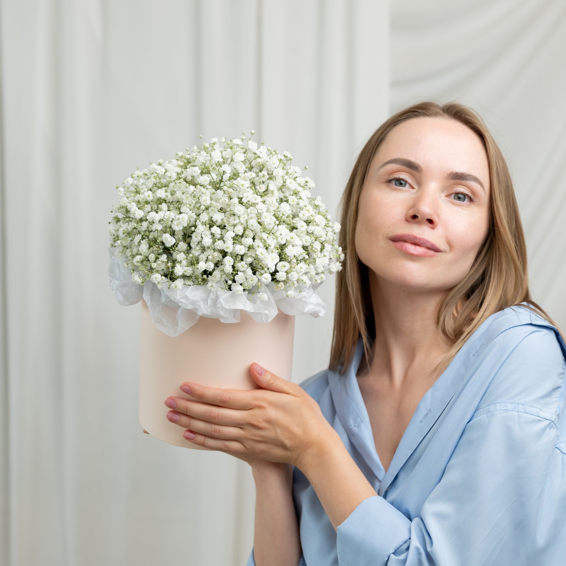 В составе гипсофила белая (5 шт), шляпная коробка, флористическая губка.