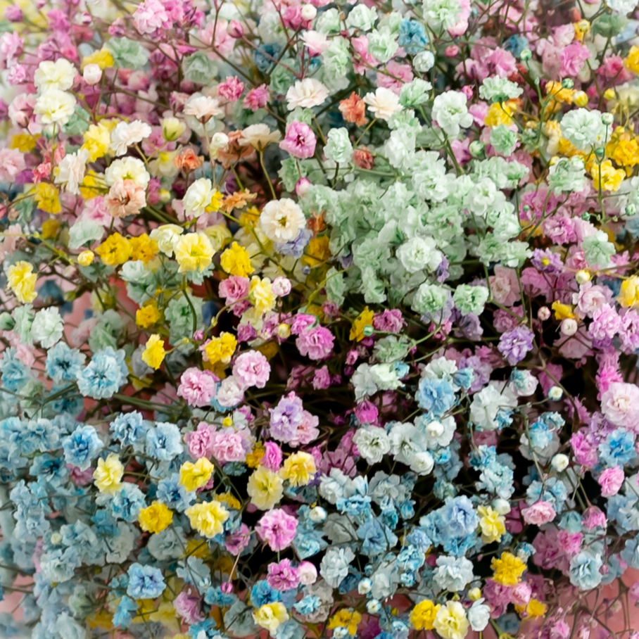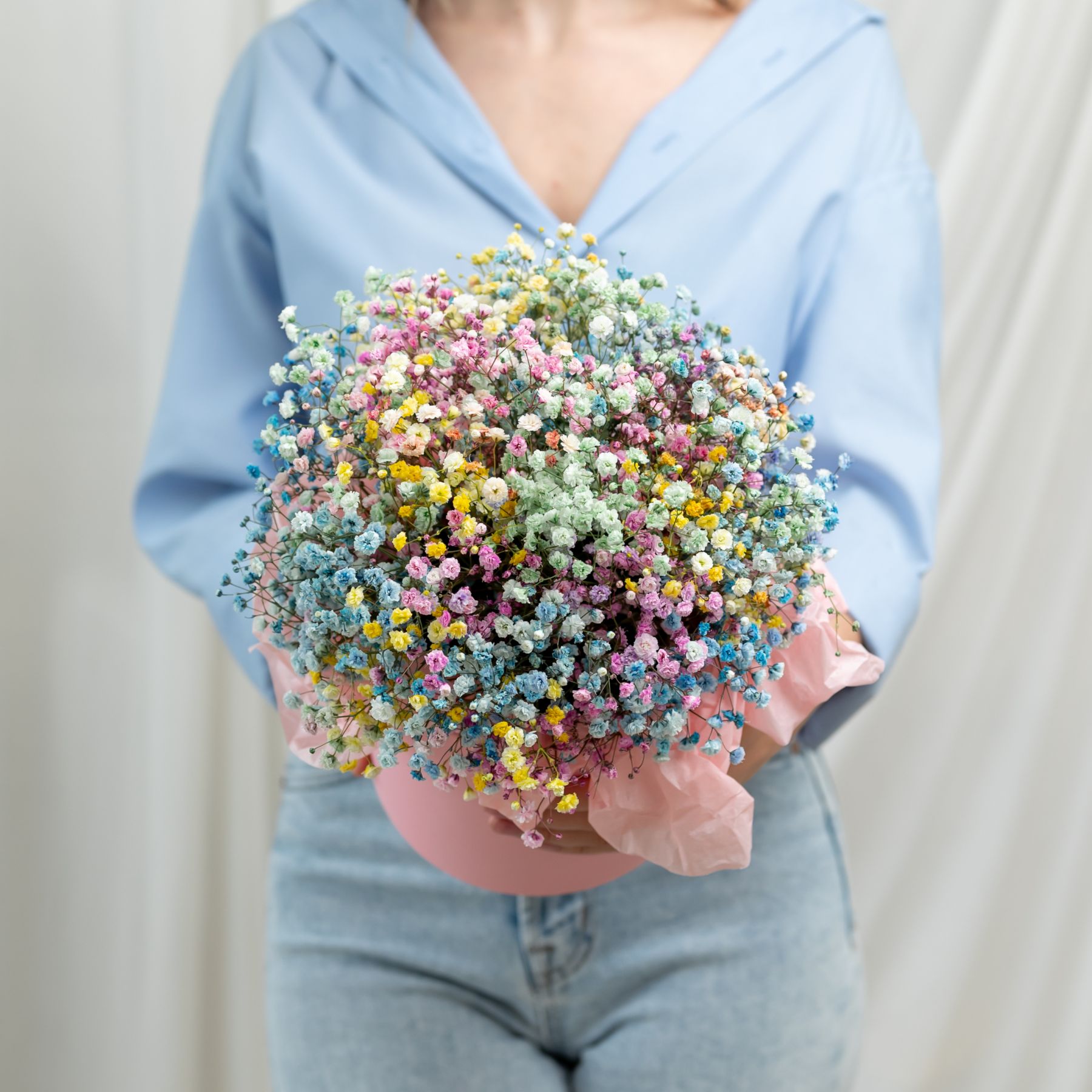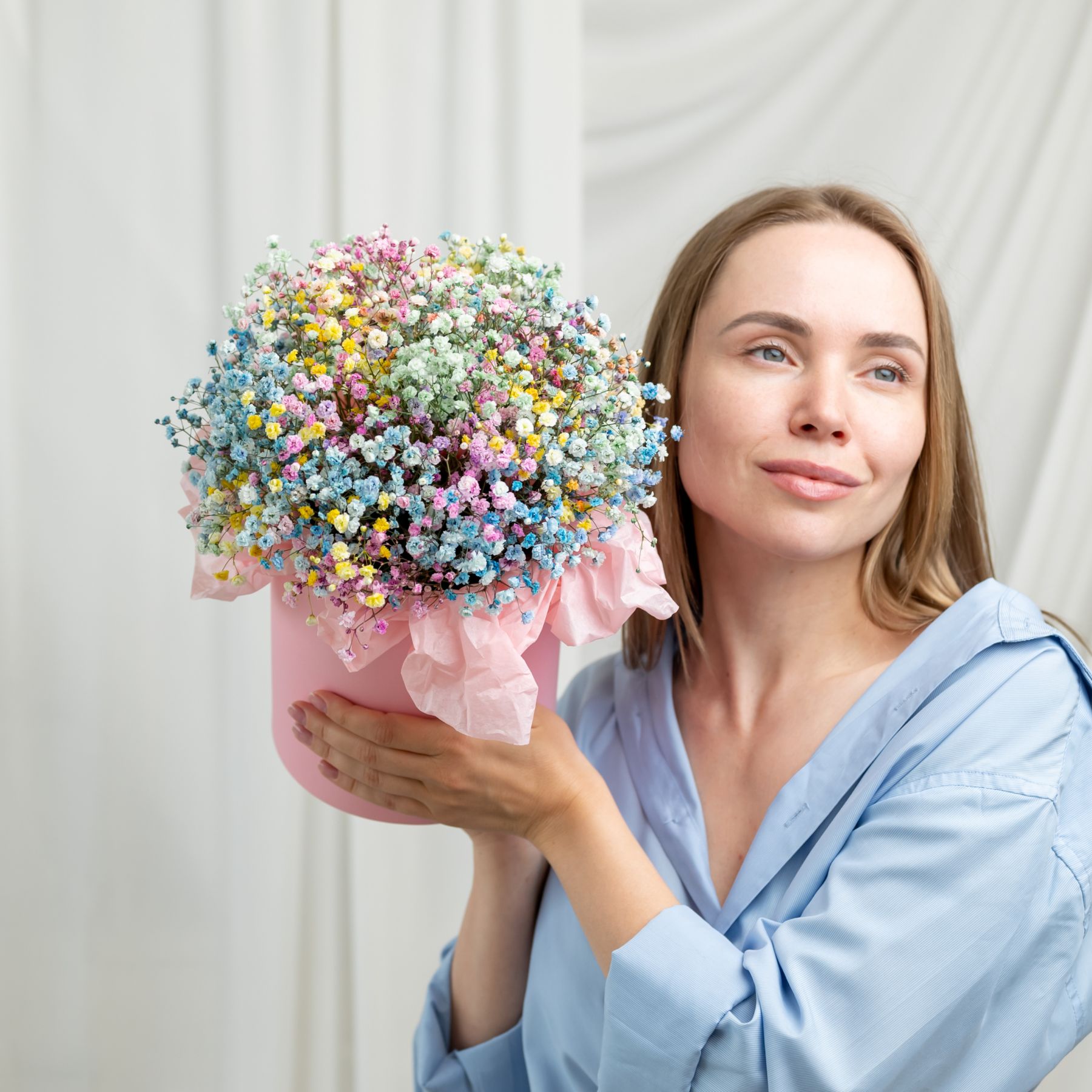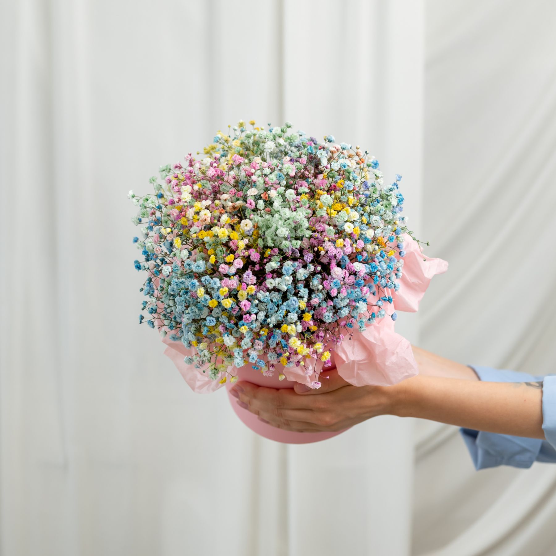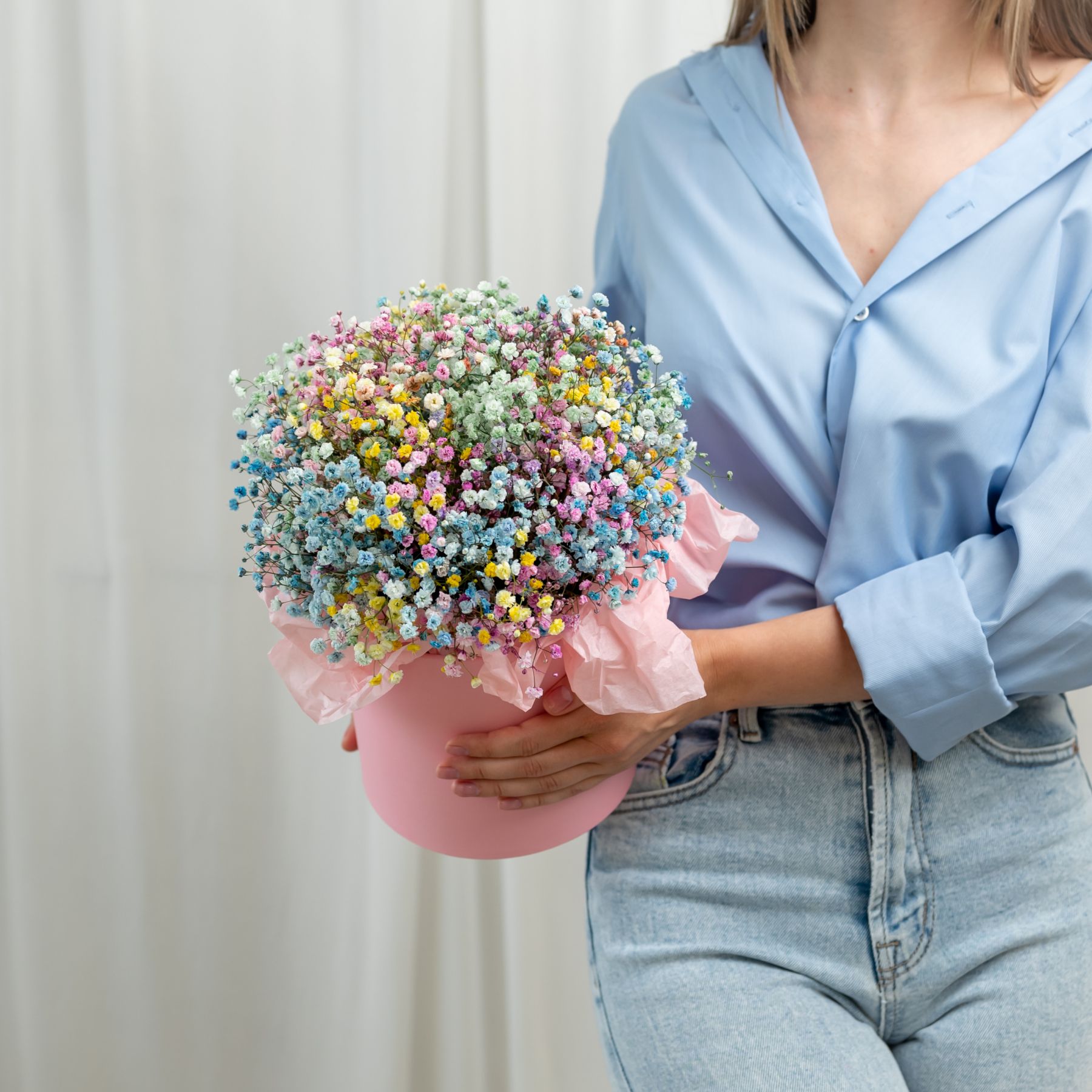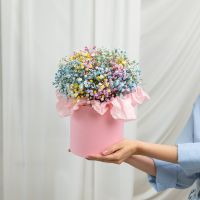 В составе гипсофила радужная (5шт), шляпная коробка, флористическая губка.