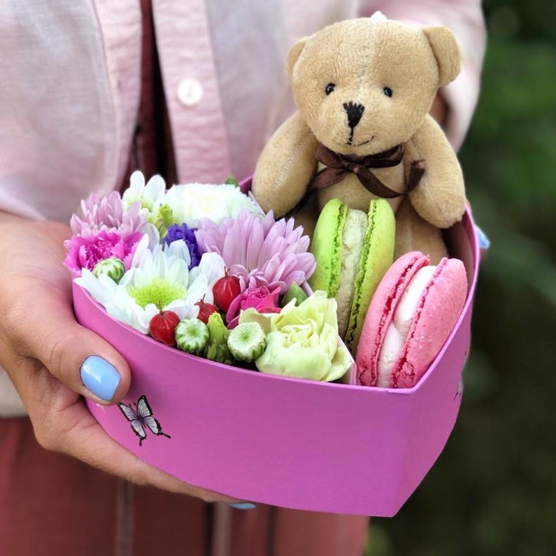 Коробочка-комплимент в форме сердца (d=15 см) с мягким мишкой и печеньем макаронс.