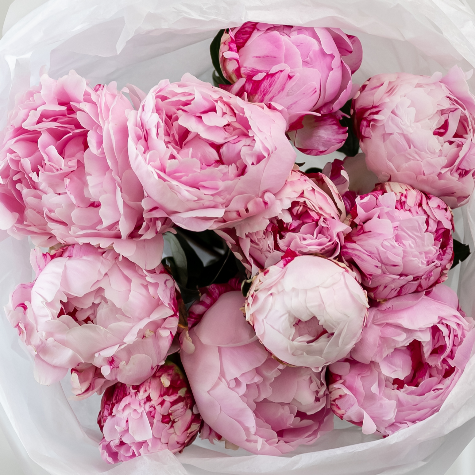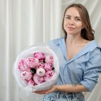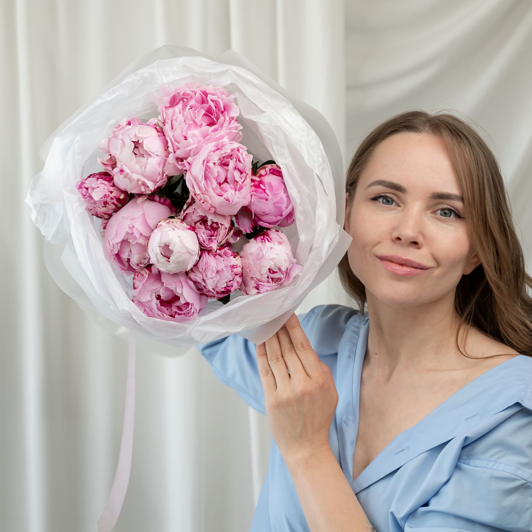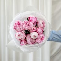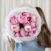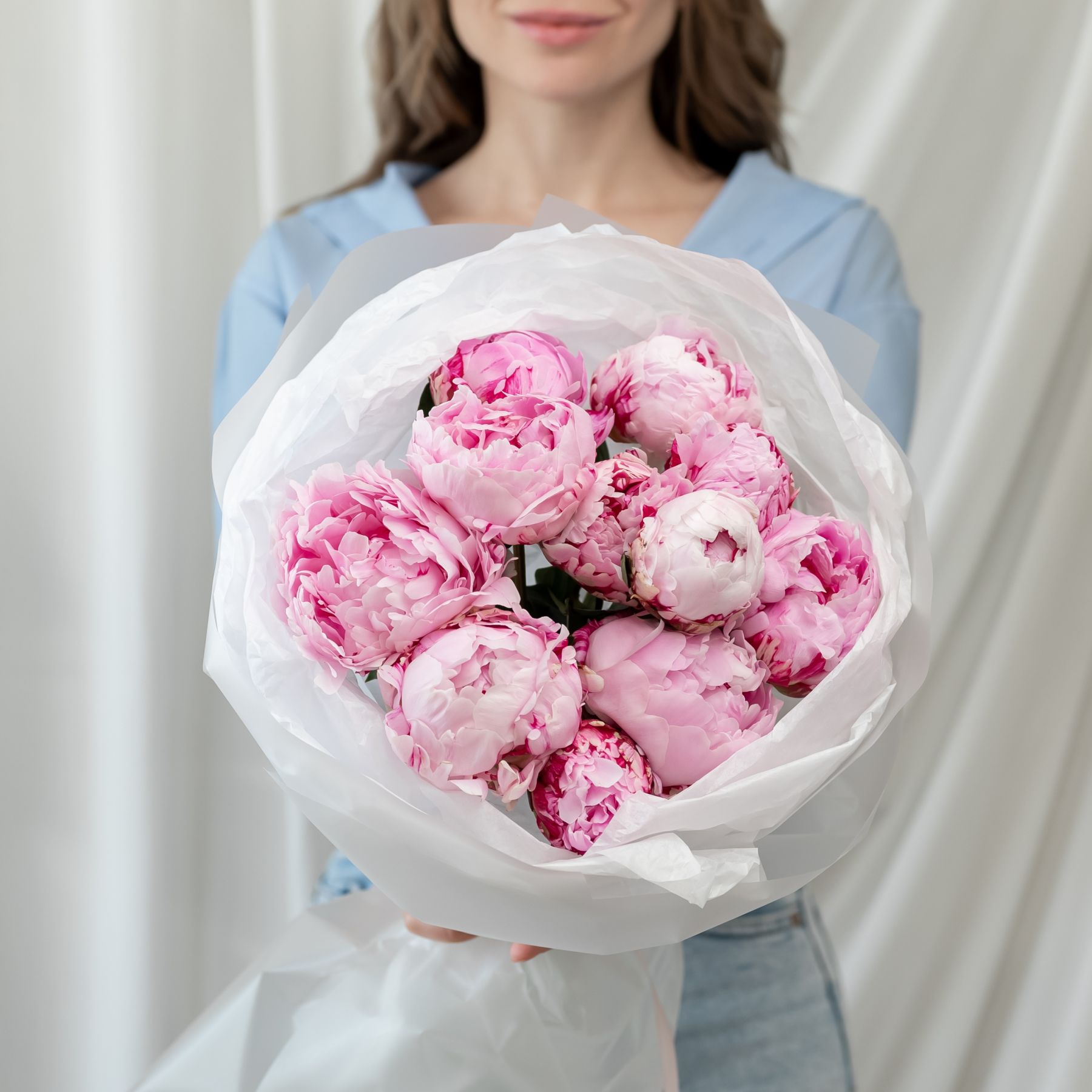 В составе 11 пионов (сорт Сара Бернард) в дизайнерской упаковке.
