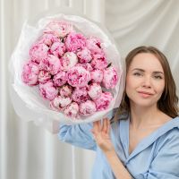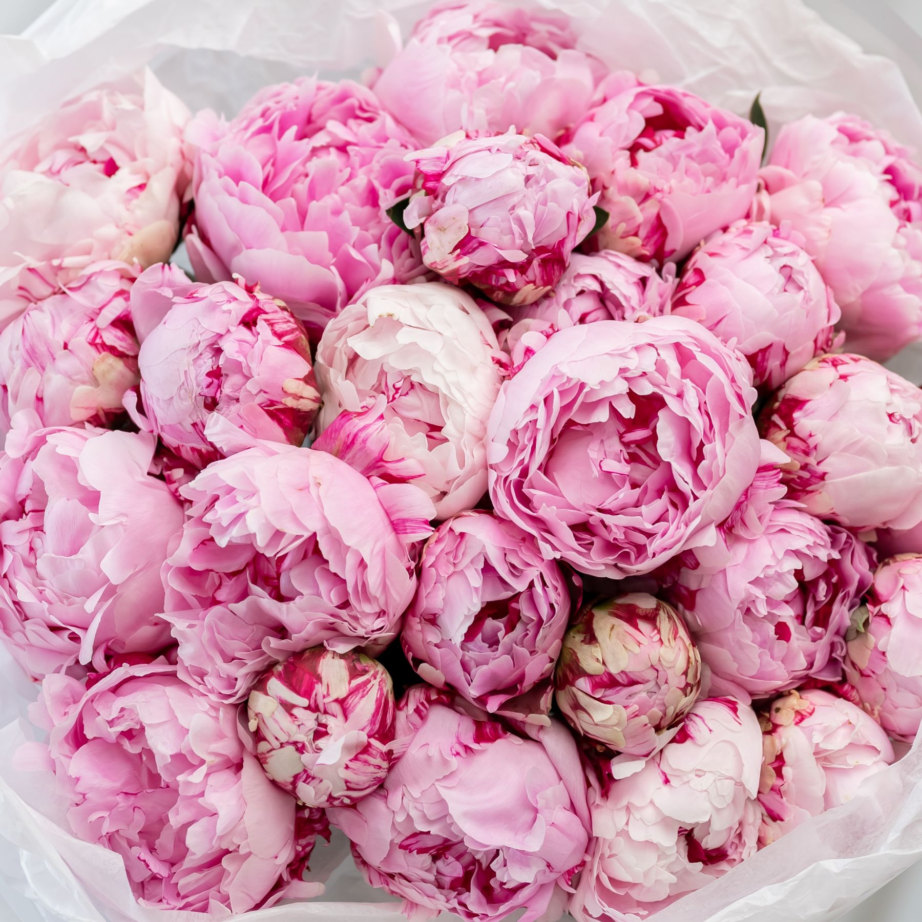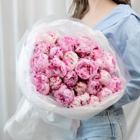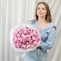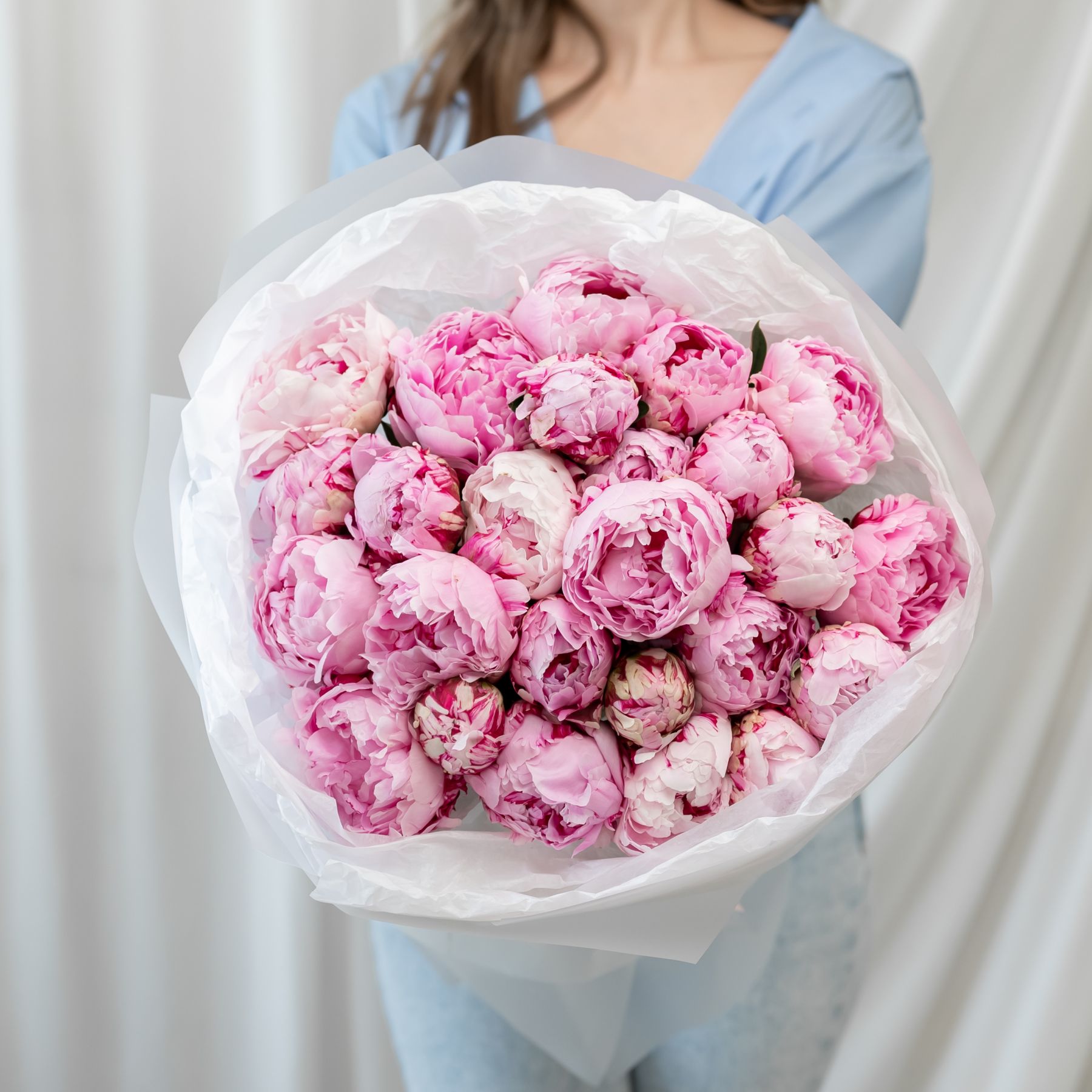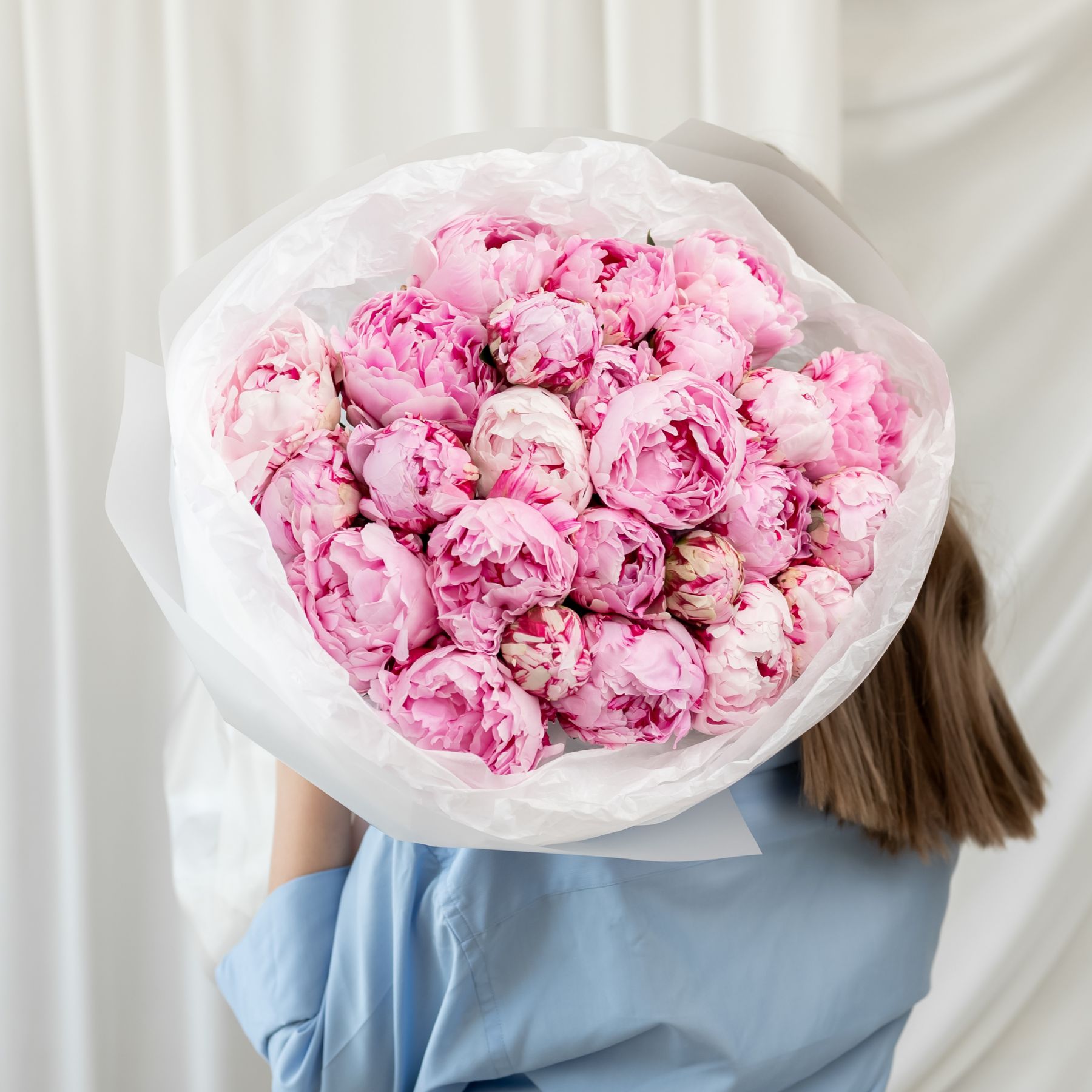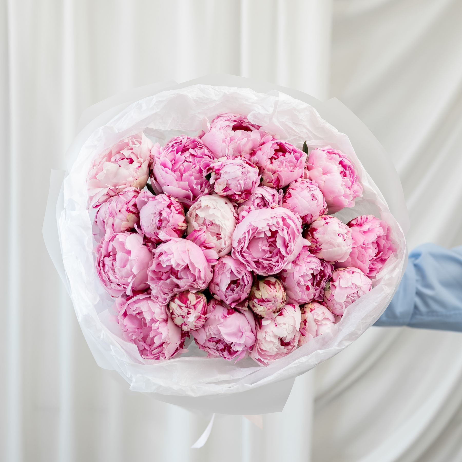 В составе 25 пионов (сорт Сара Бернард) в дизайнерской упаковке.