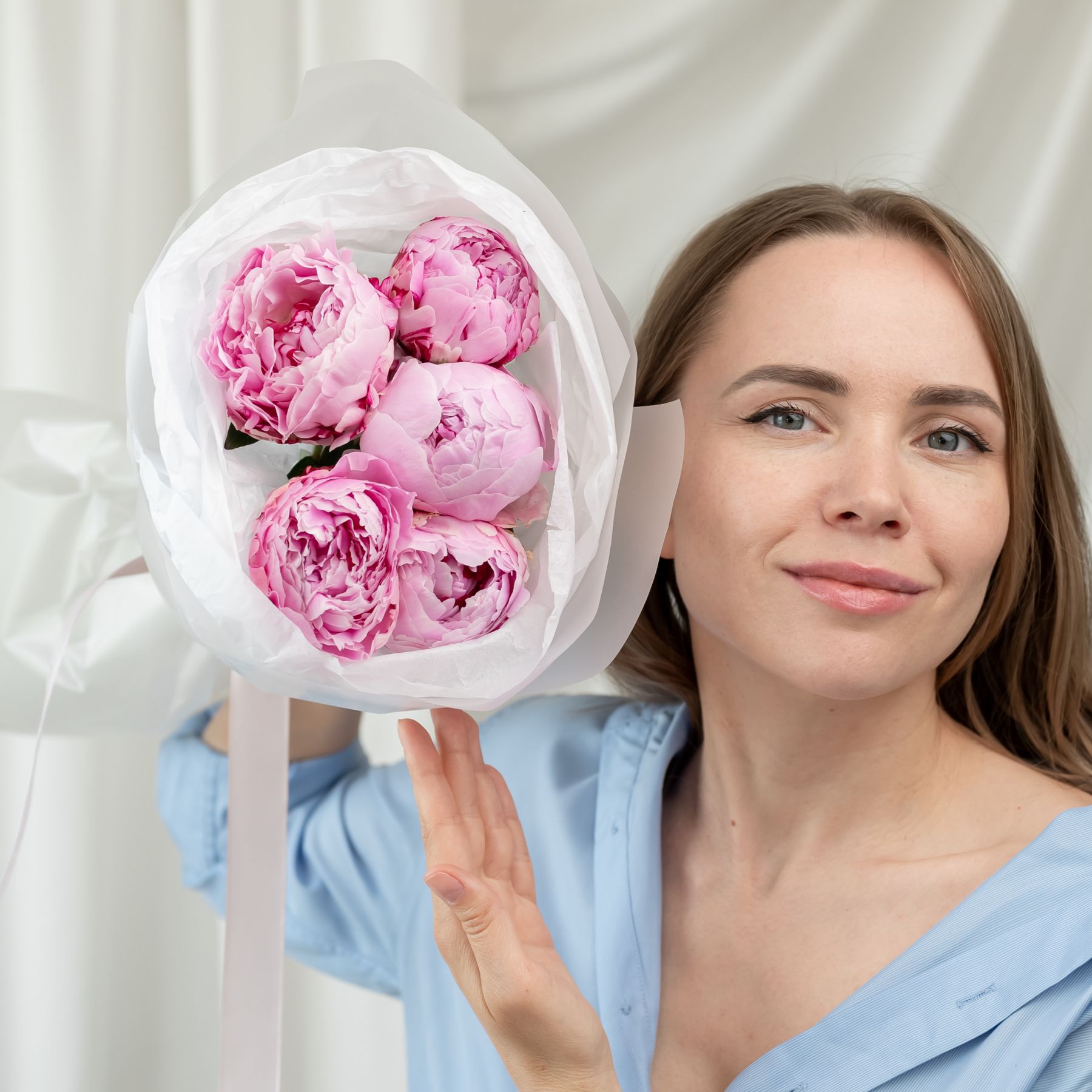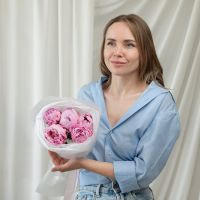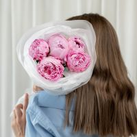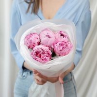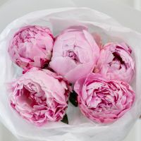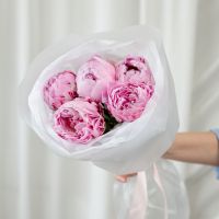 В составе 5 пионов (сорт Сара Бернард) в дизайнерской упаковке.