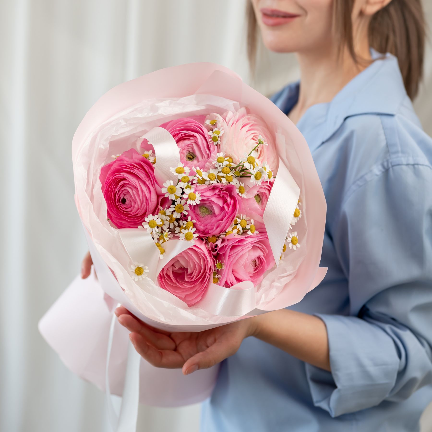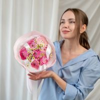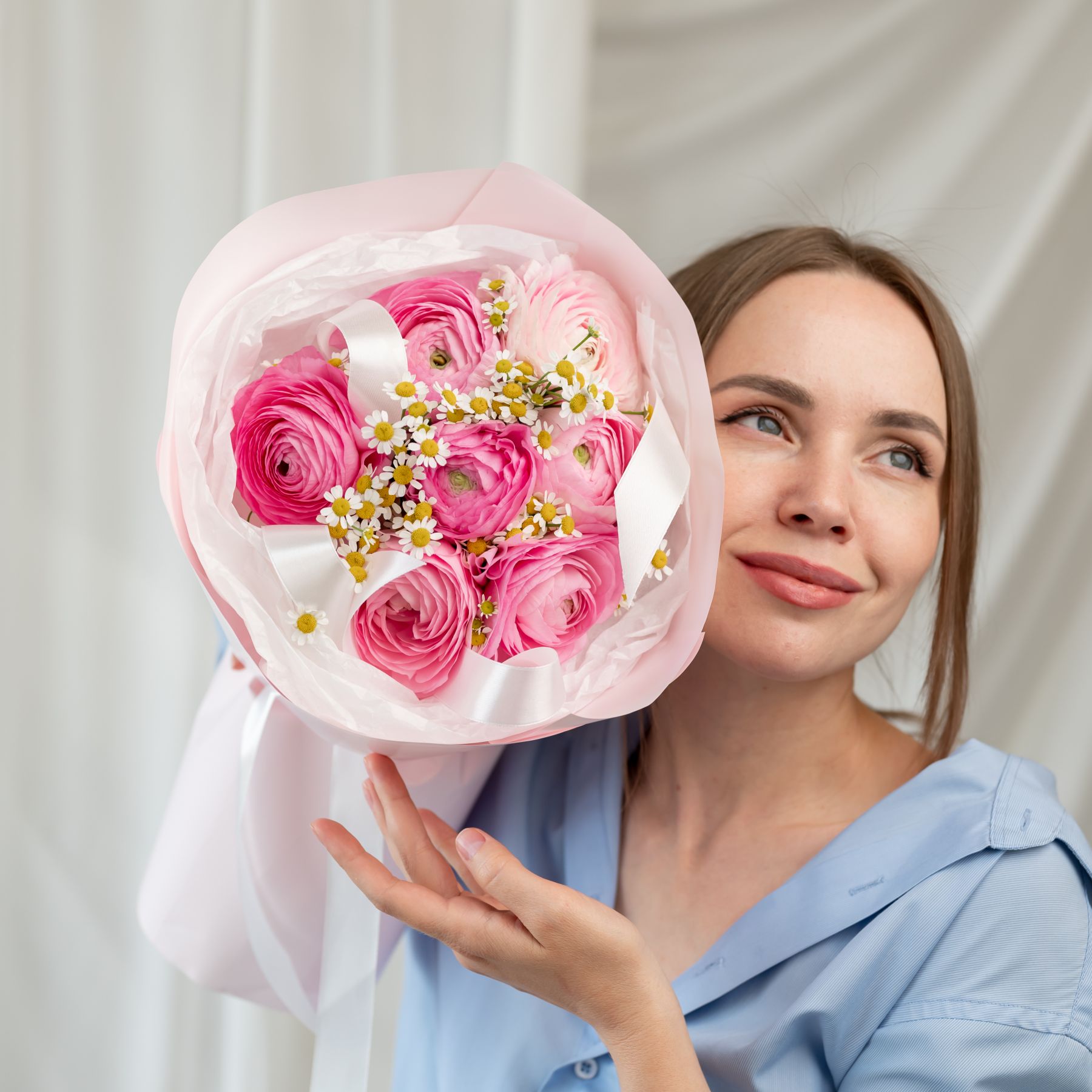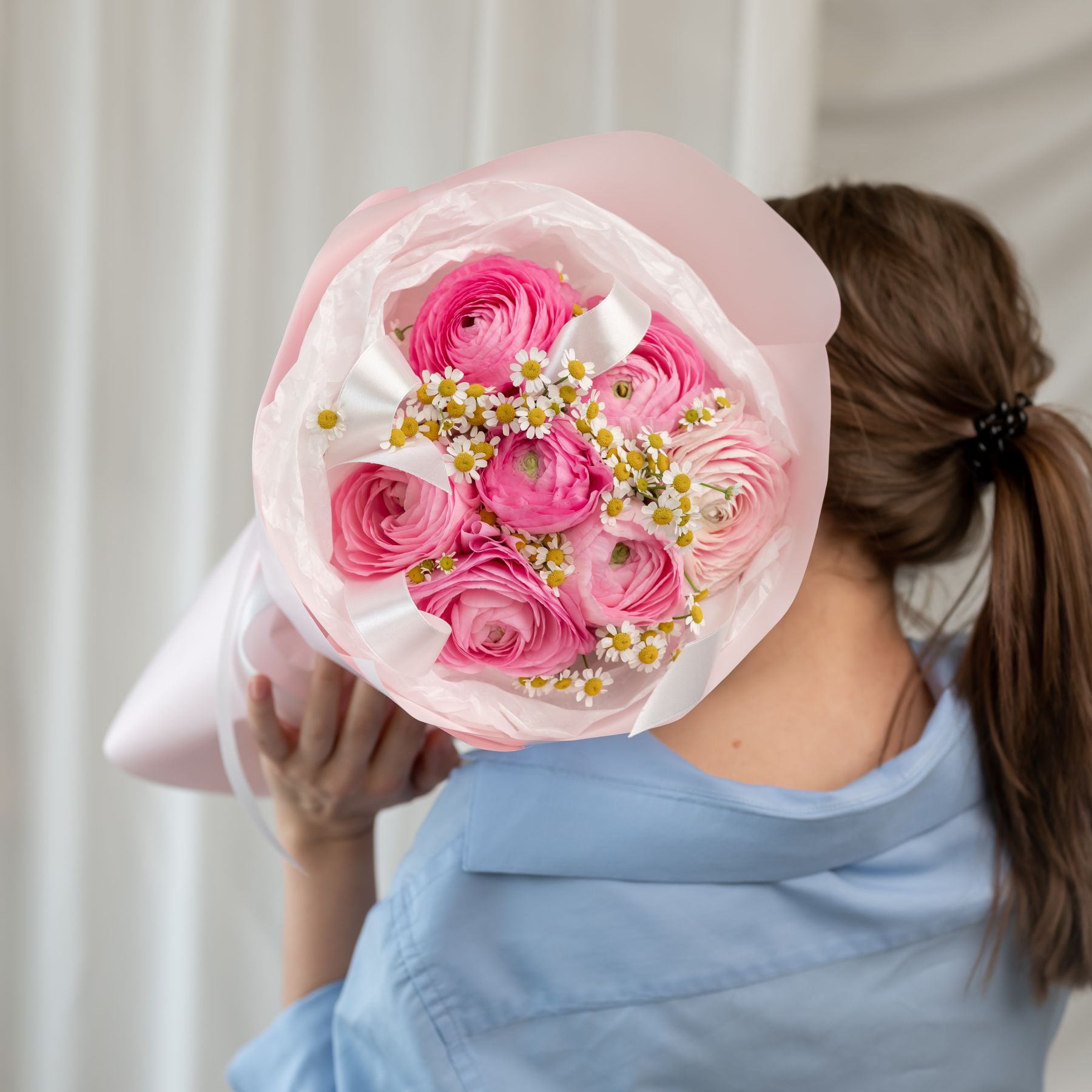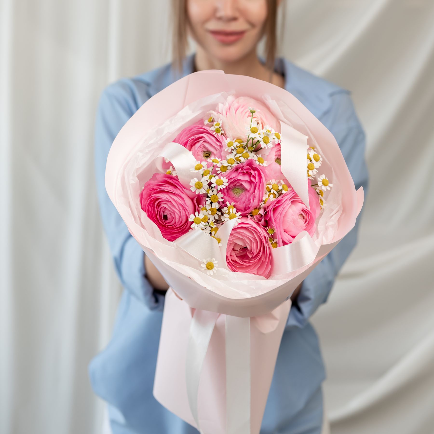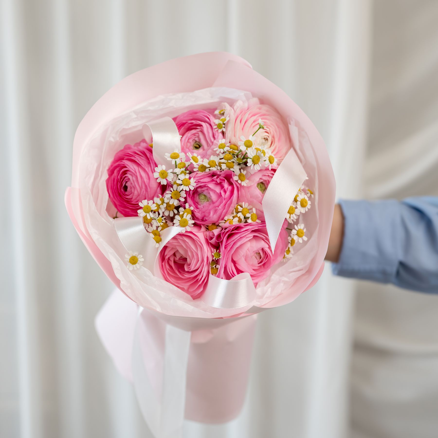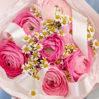 В составе ранункулюс 7 шт, ромашка 2 шт, упаковка дизайнерская.