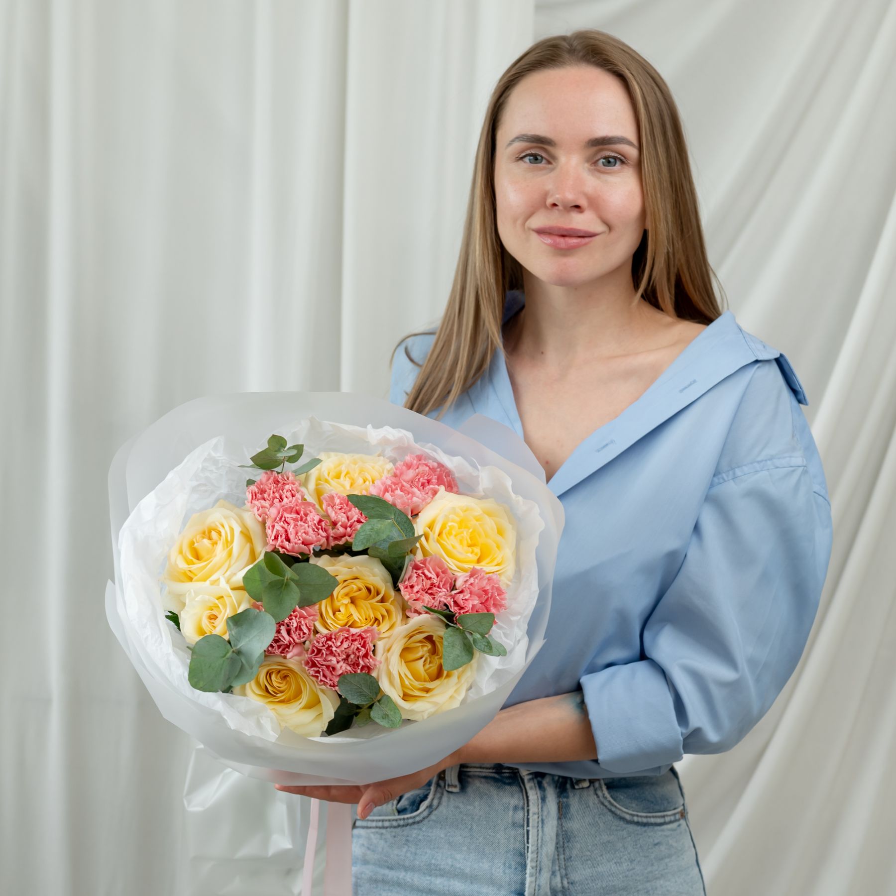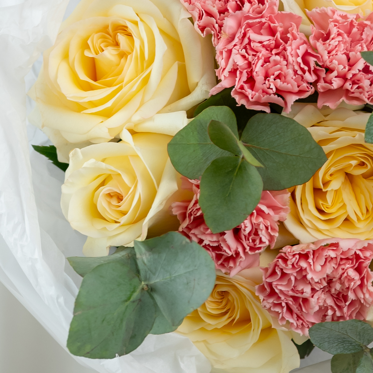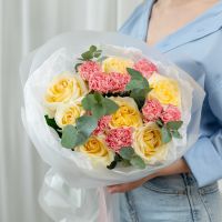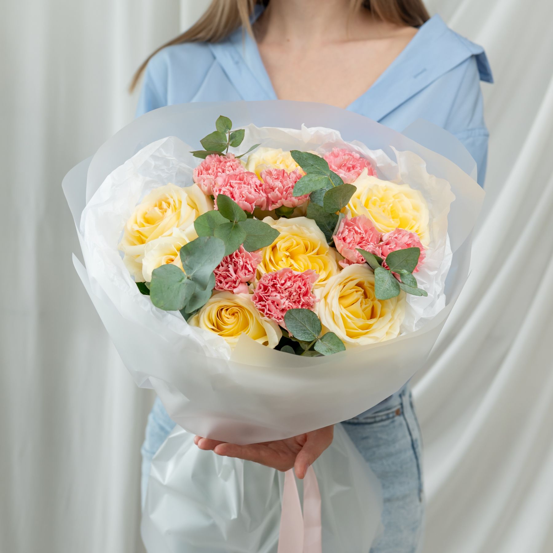 В составе роза (сорт Кендл Лайт) 7 шт, диантус 9 шт, эвкалипт 2 шт, упаковка дизайнерская.