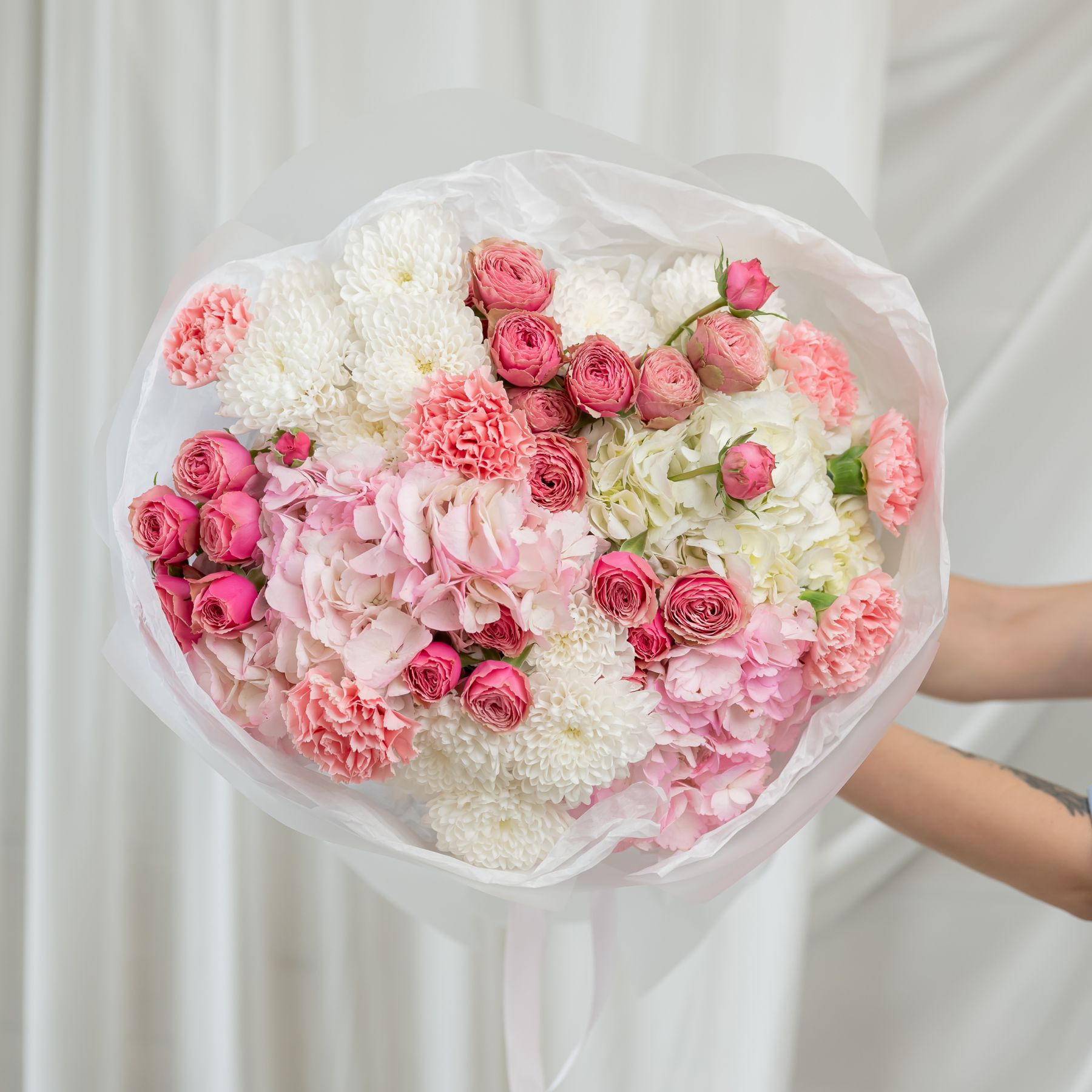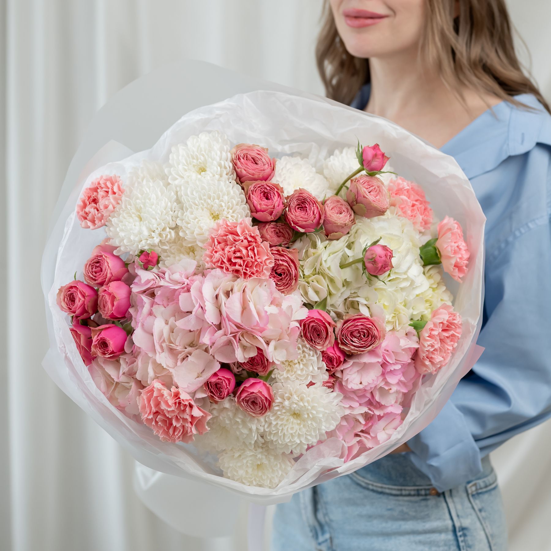 В составе хризантема кустовая (сорт Алтай) 3 шт, гортензия 3 шт, кустовая пионовидная роза 3 шт, дианутс 6 шт, упаковка дизайнерская.