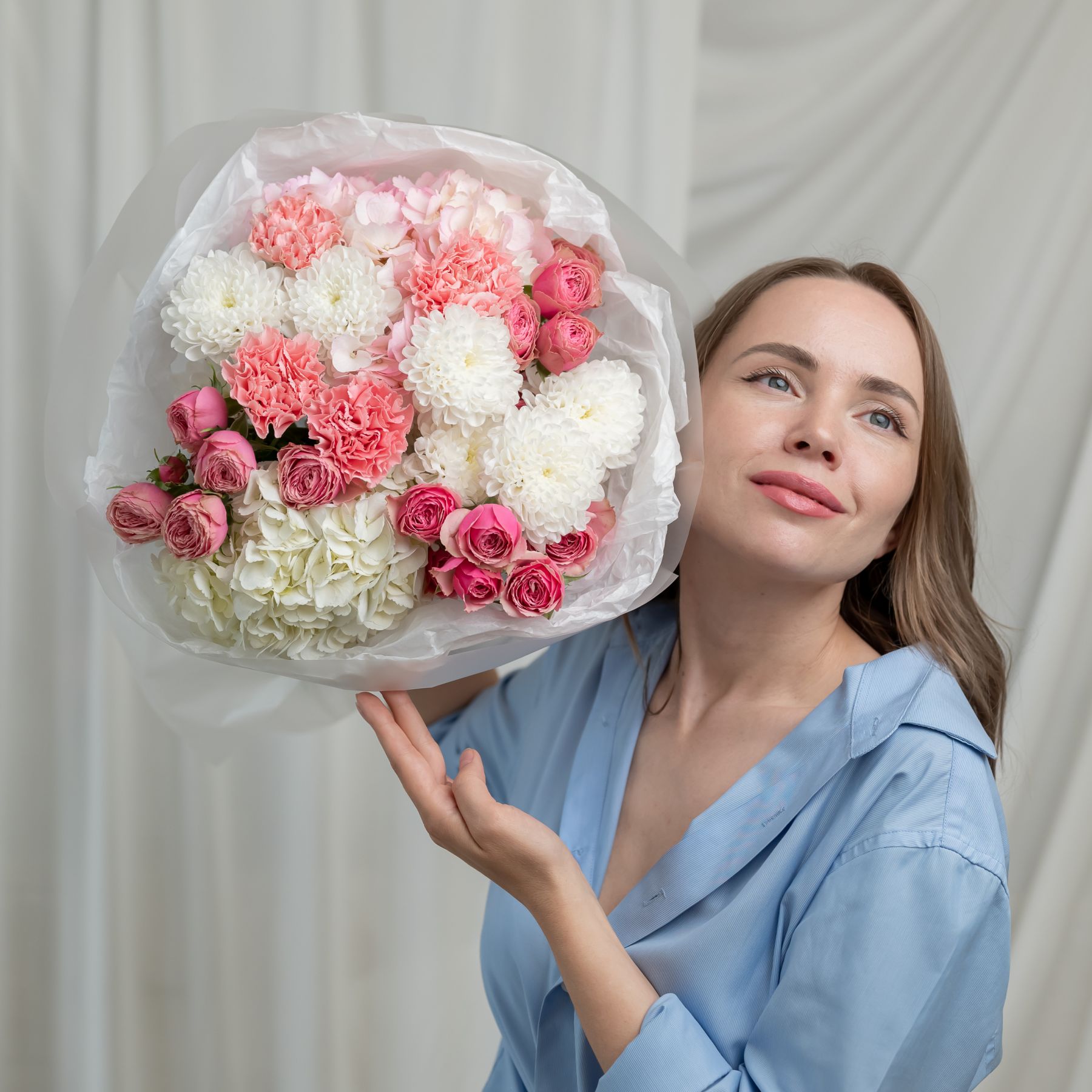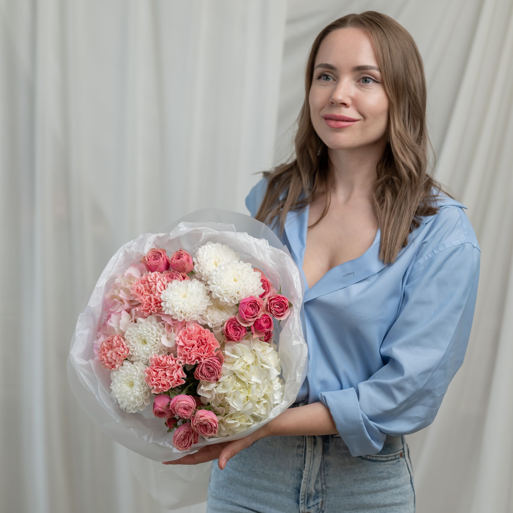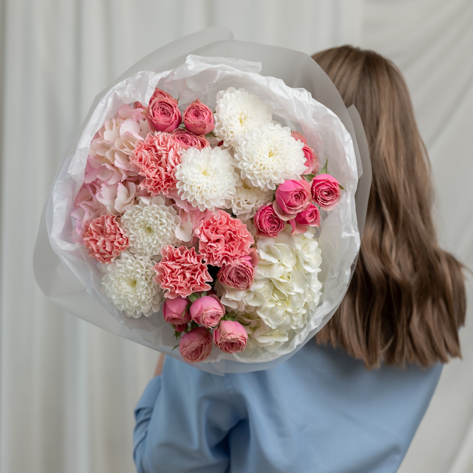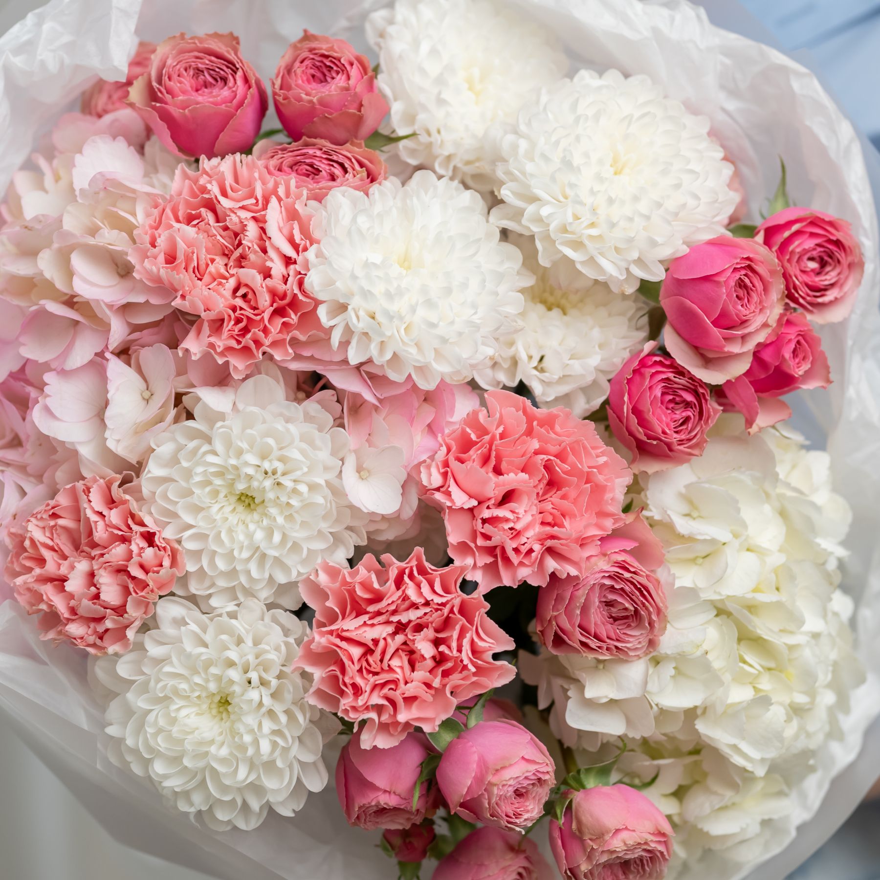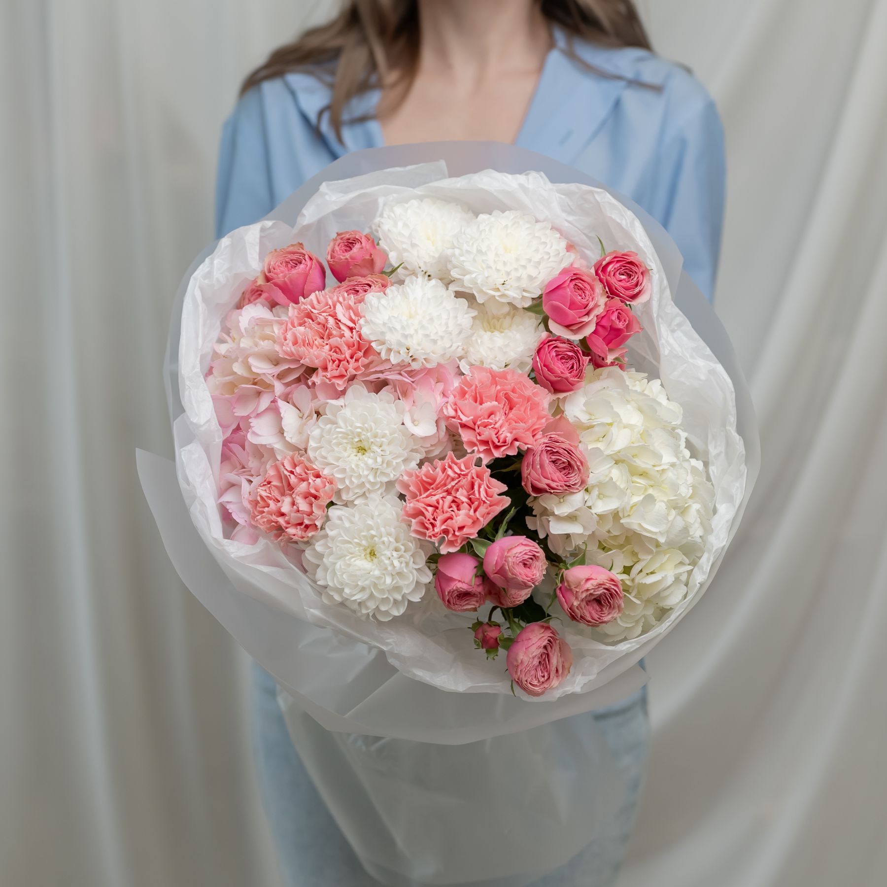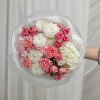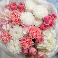 В составе хризантема кустовая (сорт Алтай) 2 шт, гортензия 2 шт, кустовая пионовидная роза 3 шт, дианутс 4 шт, упаковка дизайнерская.